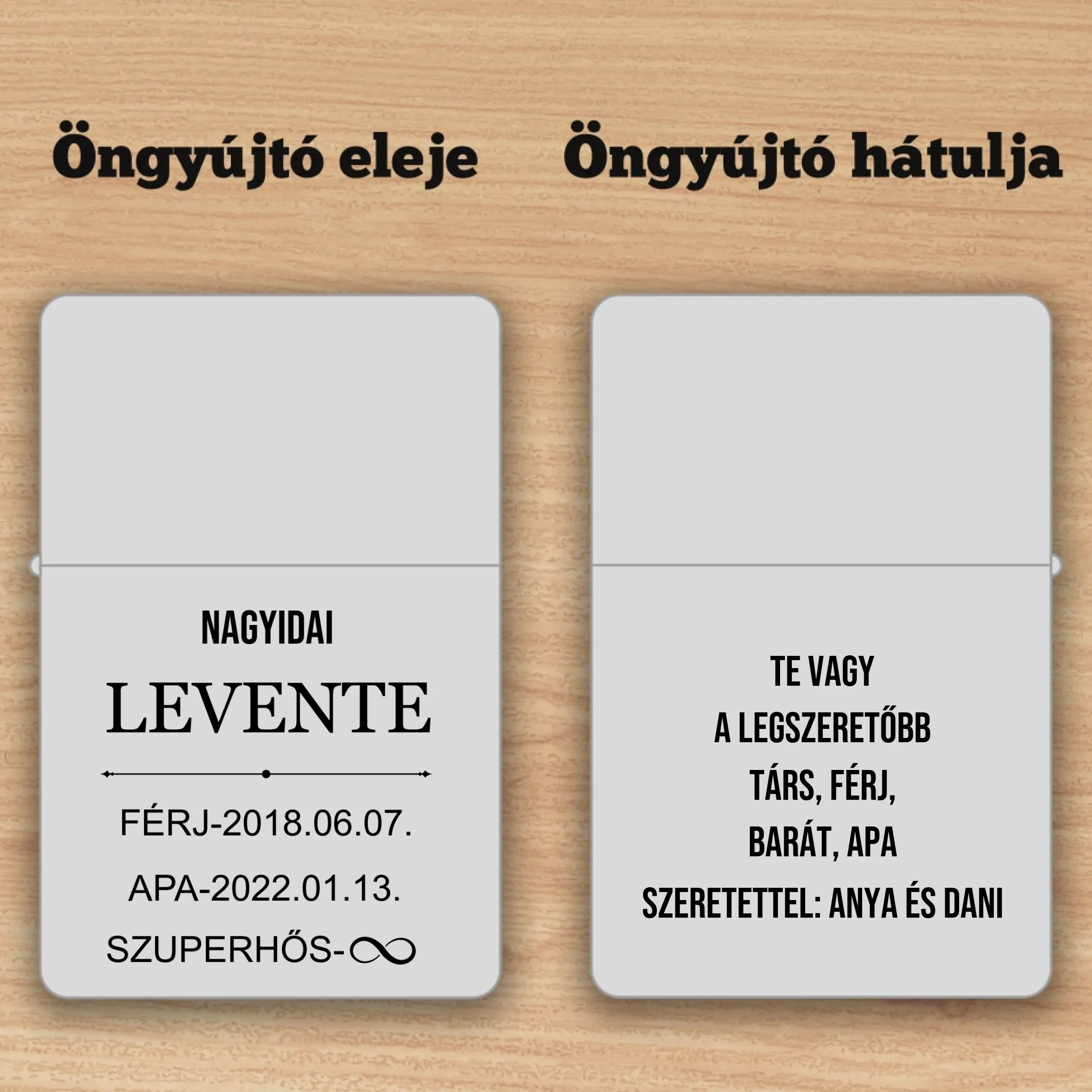 Az öngyújtót az alábbi példa szerint gravírozzuk meg: "DÁNIEL" Férj-2018.02.04. Apa-2020.10.02. Szuperhős-∞. Tehát a Te saját elképzeléseid alapján fog elkészülni. Igazi egyedi ajándék ötlet apának. Biztosan oda lesz érte és szívesen mutatja meg majd a kollégáinak is.