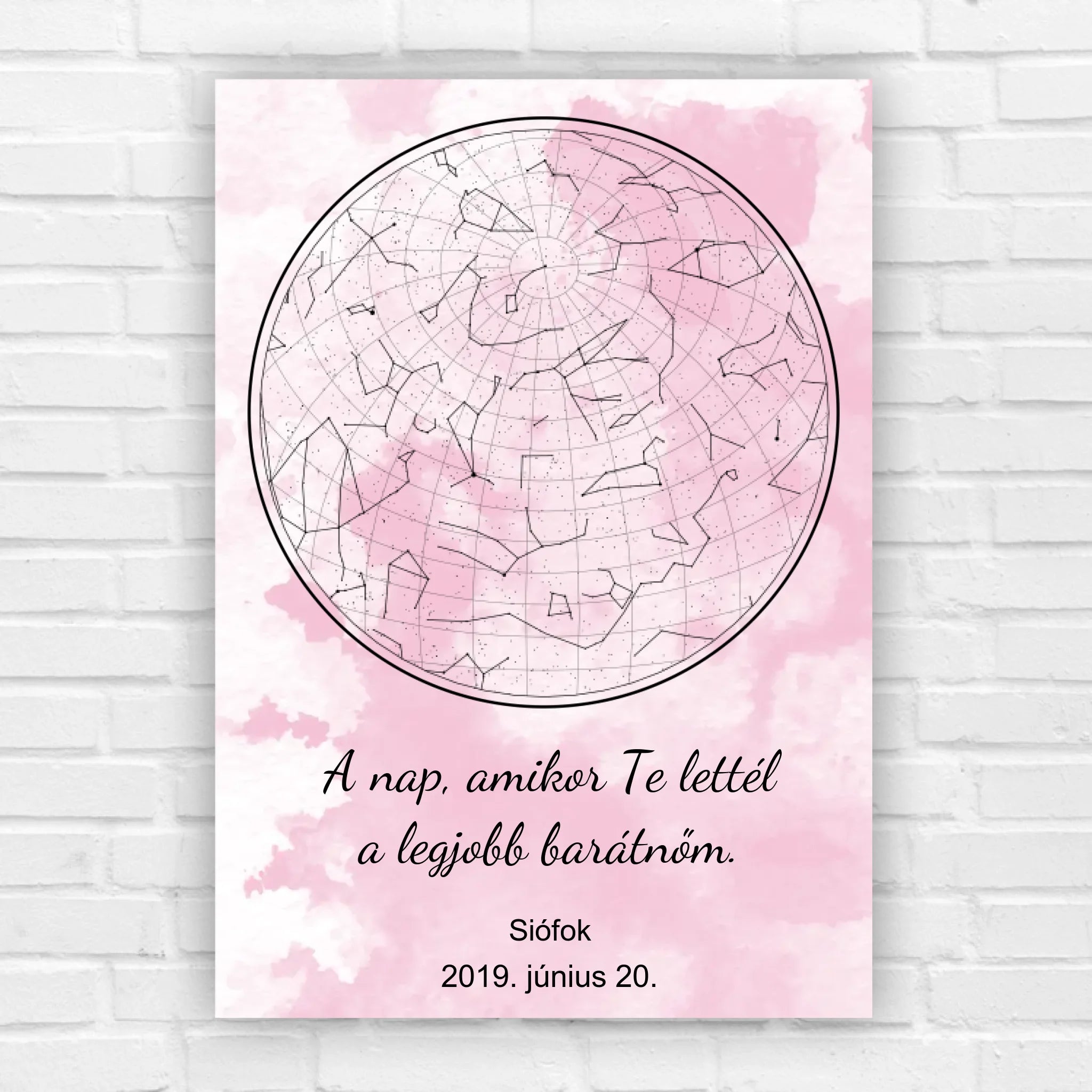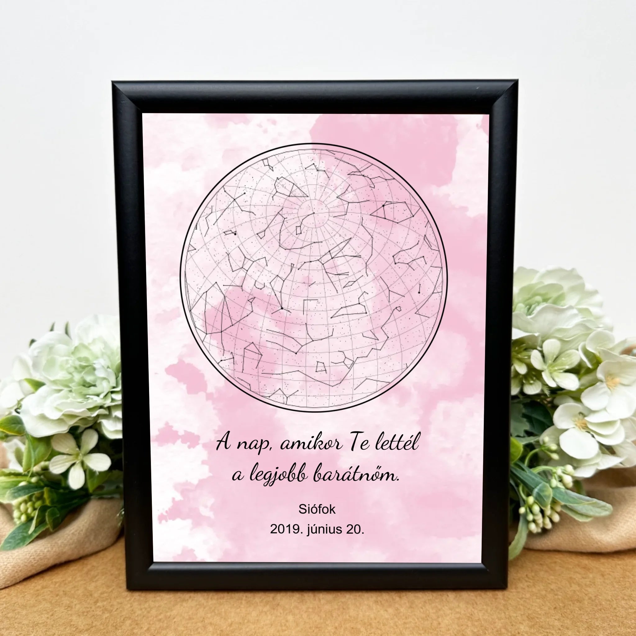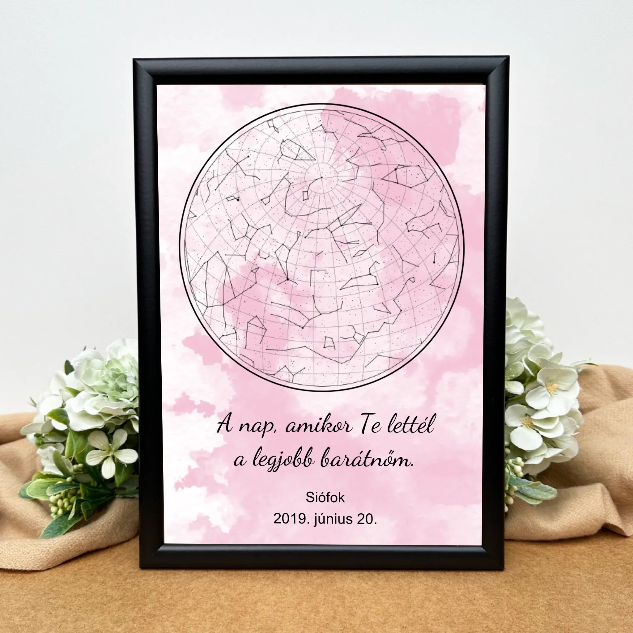 Lepd meg az imádott barátnődet ezzel az ajándékkal. Csillagkép, amely arról mesél, amikor Te és Ő, legjobb barátnőkké váltatok. Válaszd ki, hogy milyen színben kéred a képet, add meg a szükséges adatokat és mi elkészítjük számodra ezt a cuki csillagkép ajndékot.