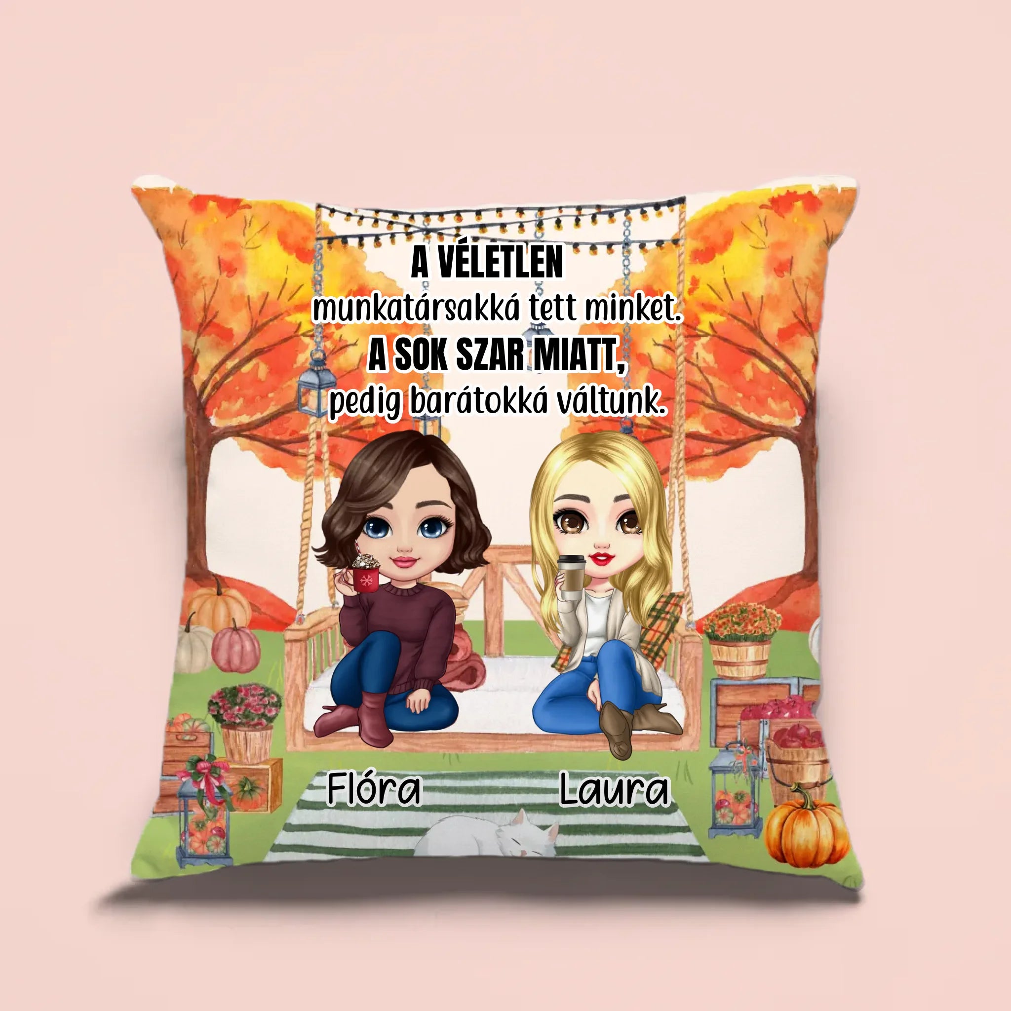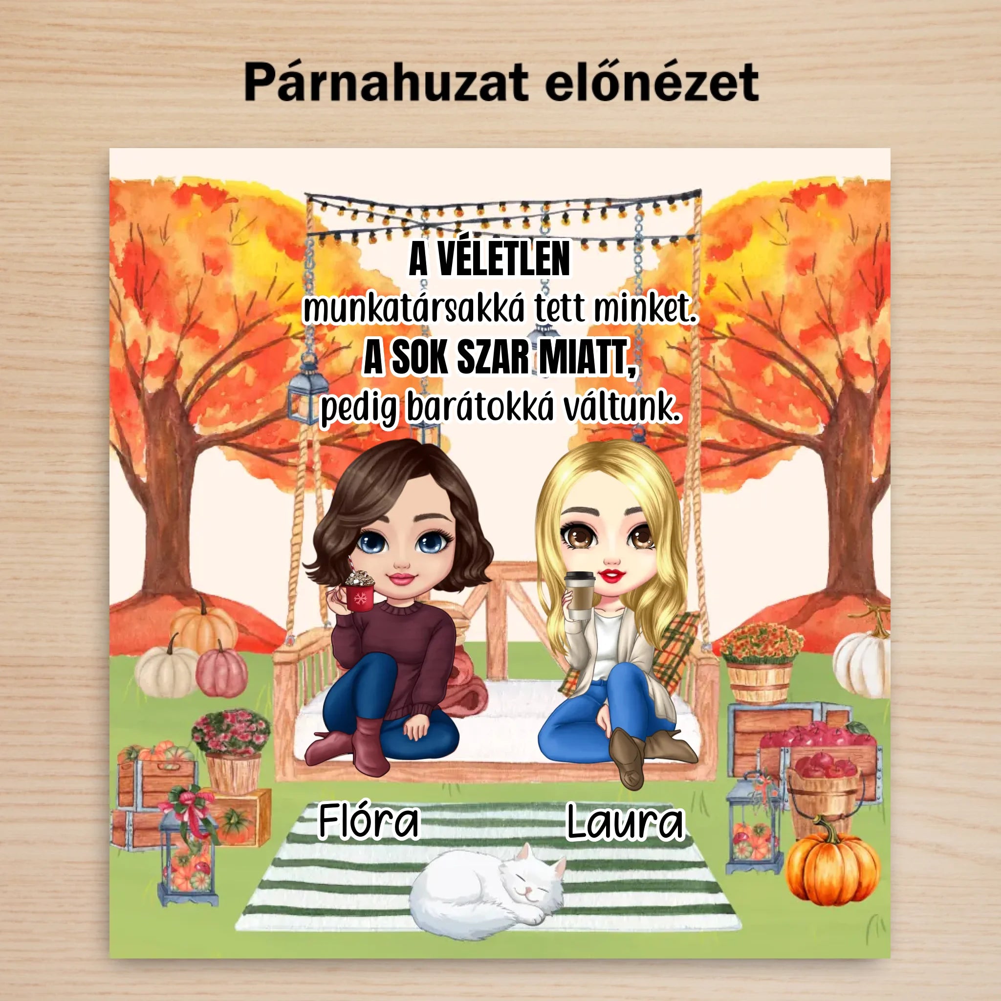 A párna hátulja fehér színű, az elején őszi háttér látható. A tetejére az általad megadott szöveg kerül. A párnán két figura szerepel, melyeket teljesen személyre tudod szabni. Kiválaszthatod a figurák bőrszínét, haját és ruházatát. Az aljába a ti keresztnevetek, vagy becnevetek kerülhet.