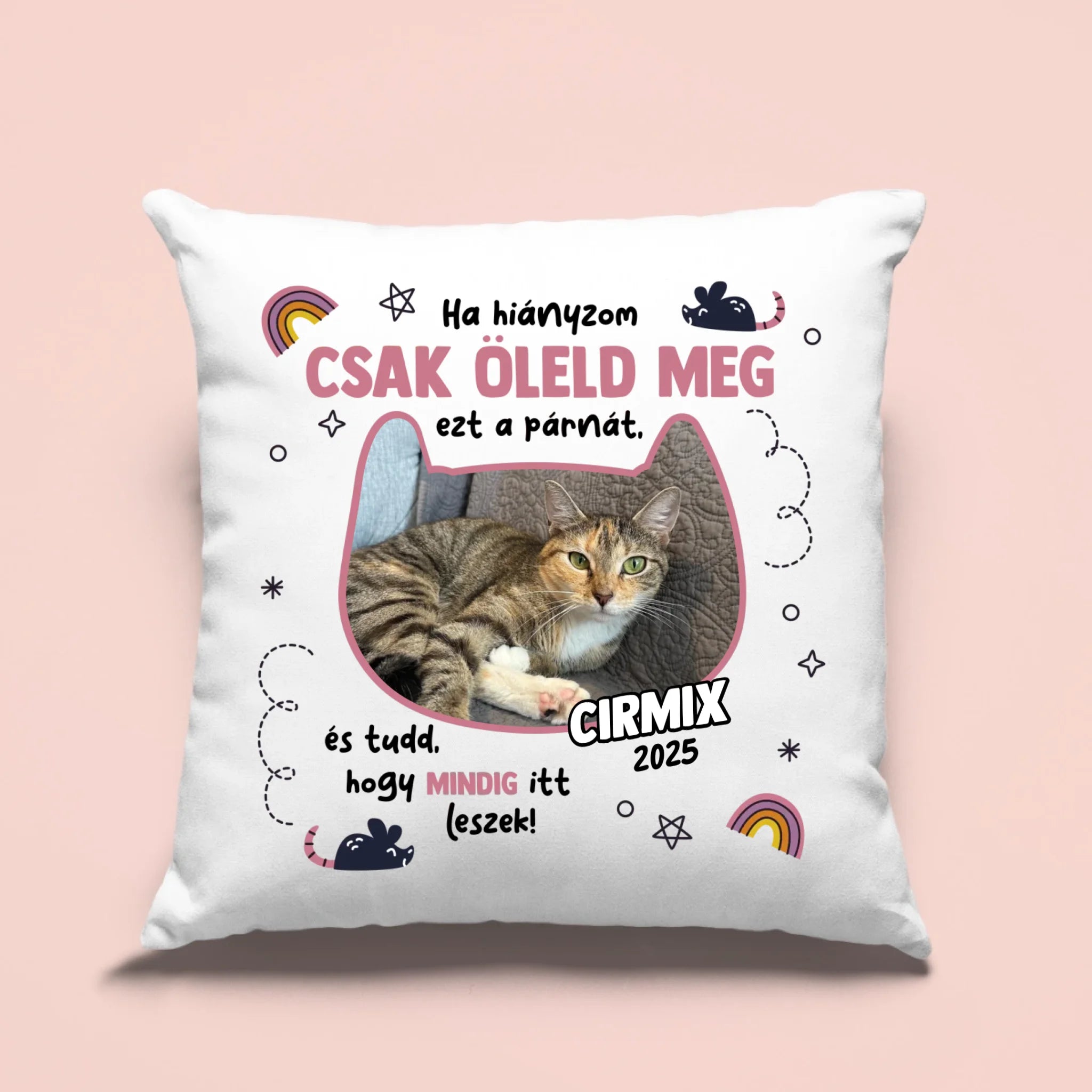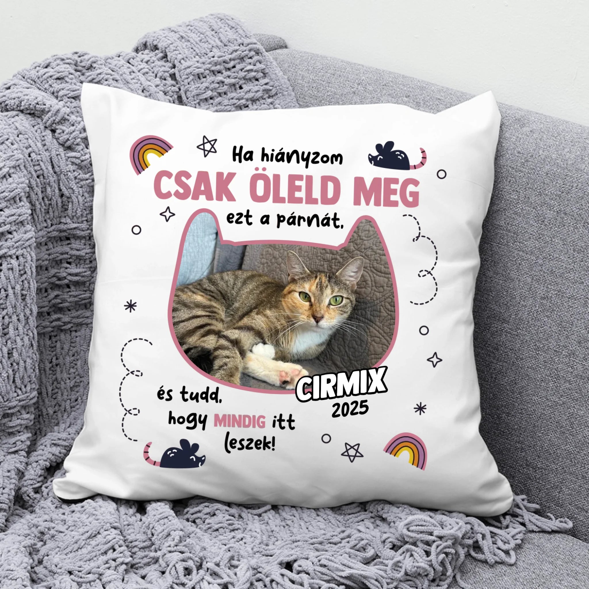 A párna teljesen egyedire szabható, rákerül a cicus fényképe, a neve és az évszám, valamint egy megható idézet: „Ha hiányzom, csak öleld meg ezt a párnát, és tudd, hogy mindig itt leszek!”. A párna többféle mintával is elérhető – cicák kedvenc motívumaival: egeres, halacskás vagy madaras változatban is választható.