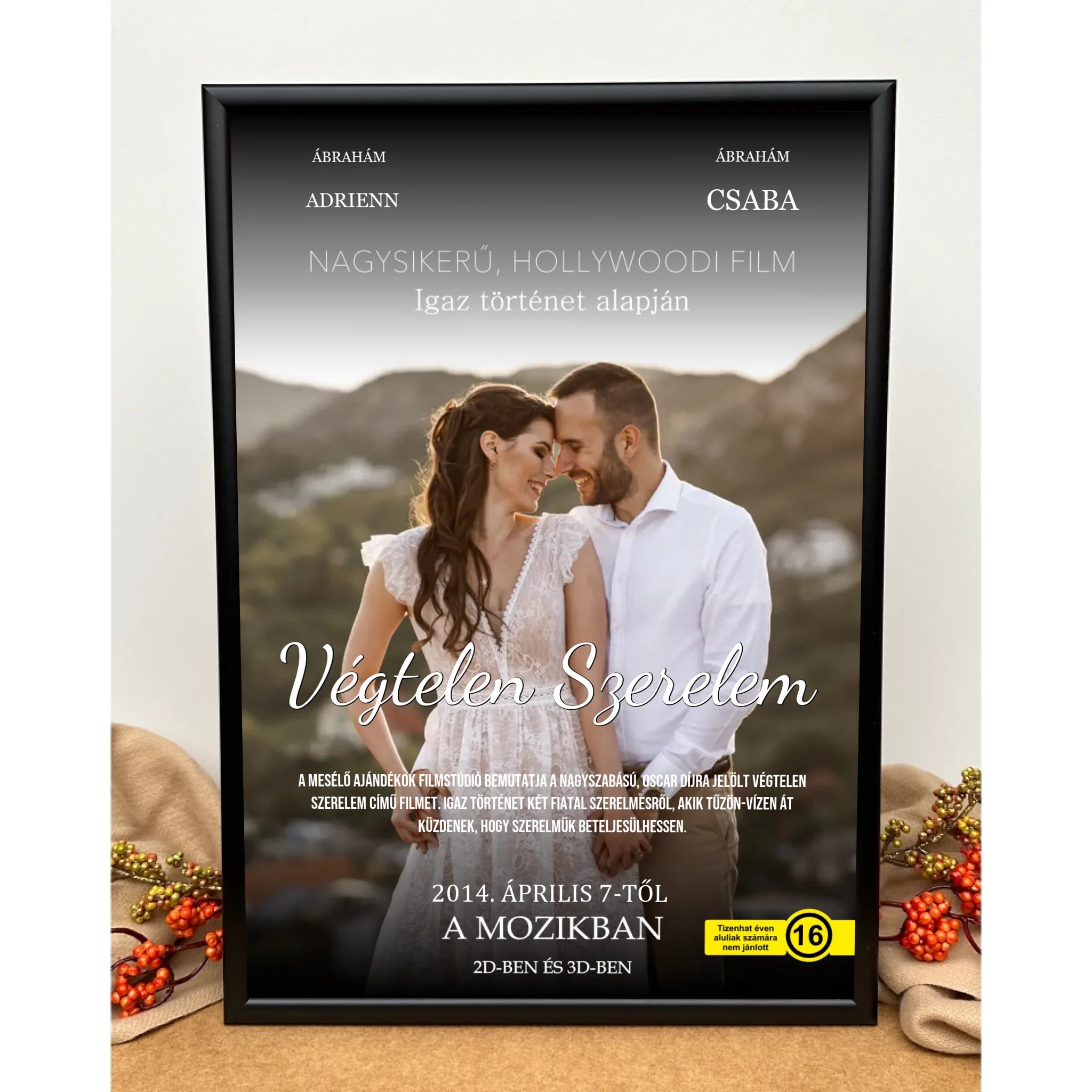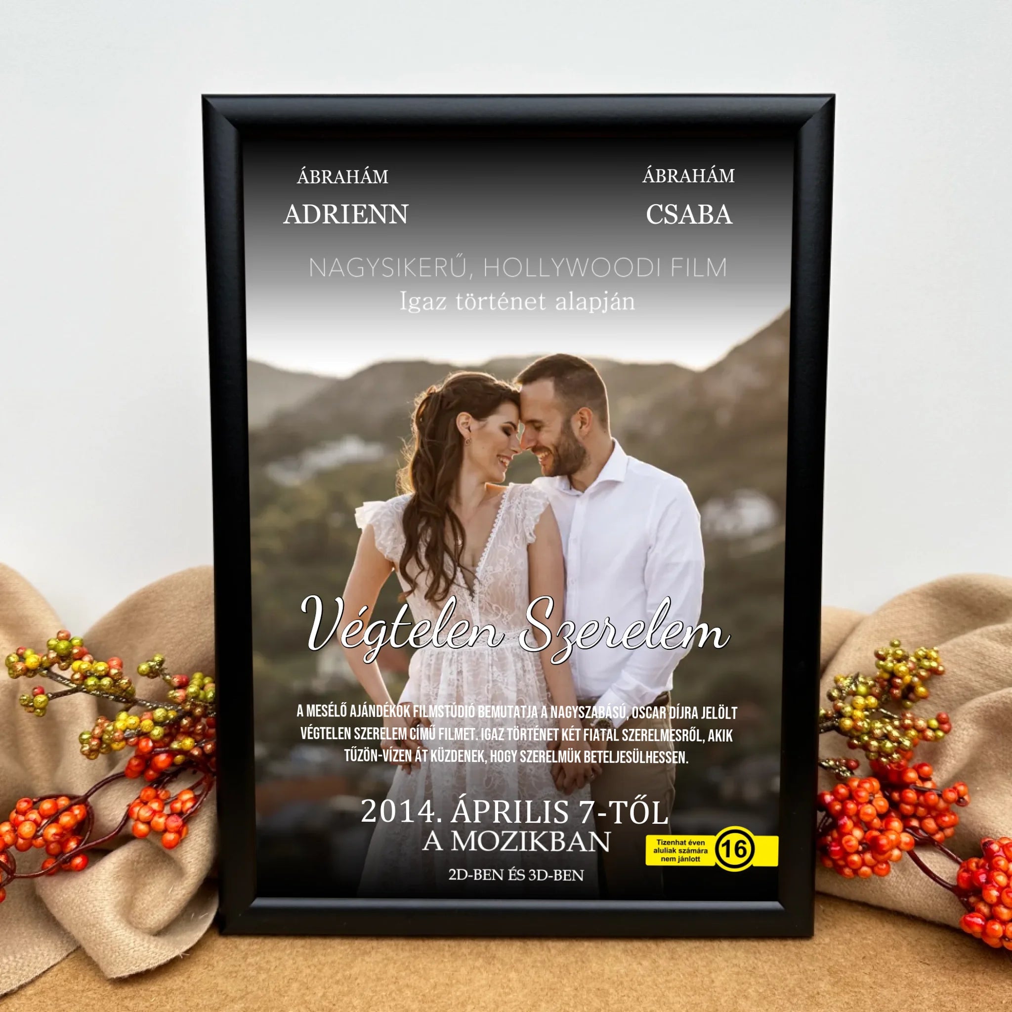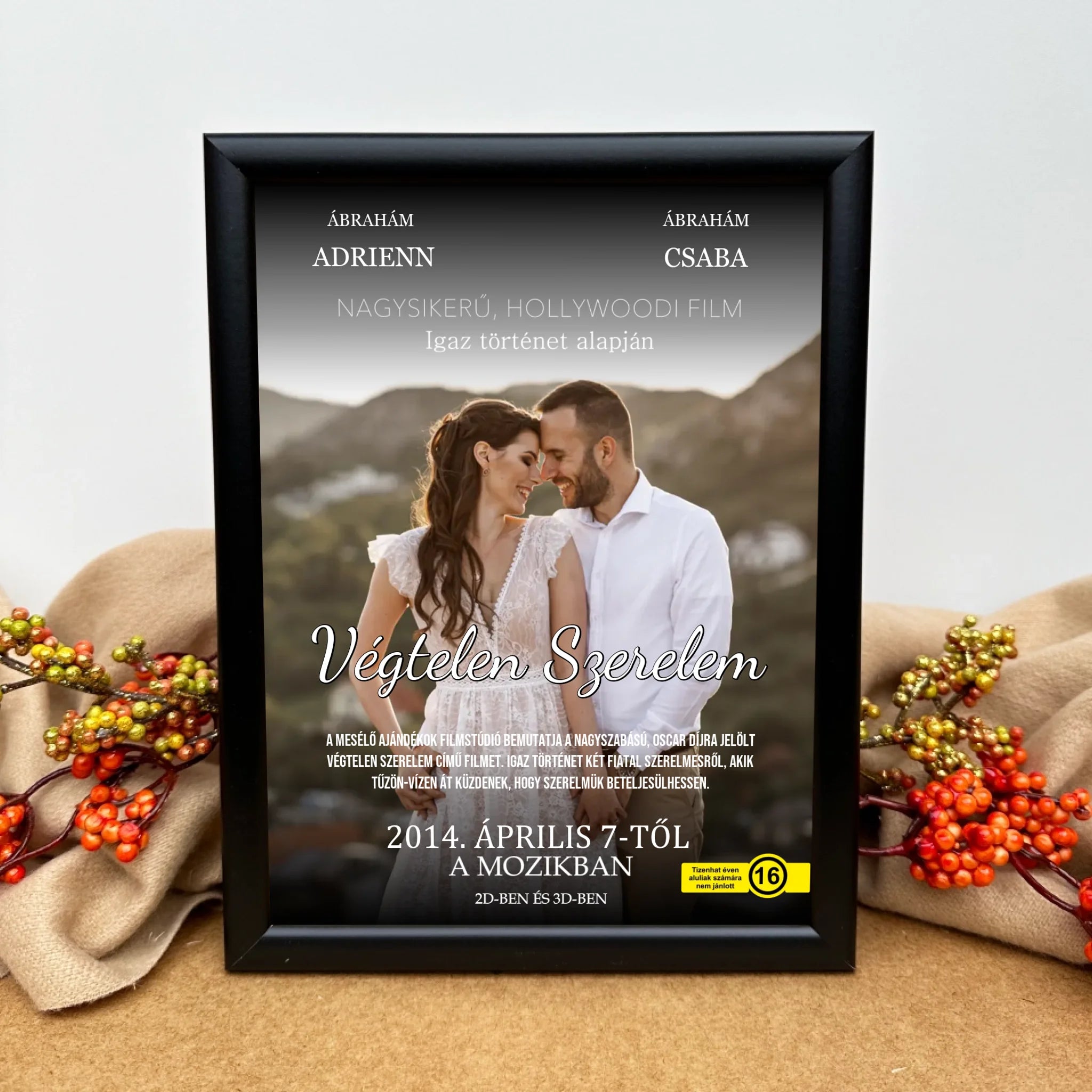 A legújabb termékünk, a filmes ajándék kép, amely mozis poszterre emlékeztető stílusú, a ti szerelmetekről mesél. A kép háttere Ti vagytok, a film címét te adhatod meg, a mű rövid leírása a megismerkedésetekről mesél. Ezen kívül a képen még felfedezheted a megismerkedésetek dátumát is, hiszen akkortól játszák a mozikban, amikortól ti egyek lettetek. :-)) Hát nem mókás?