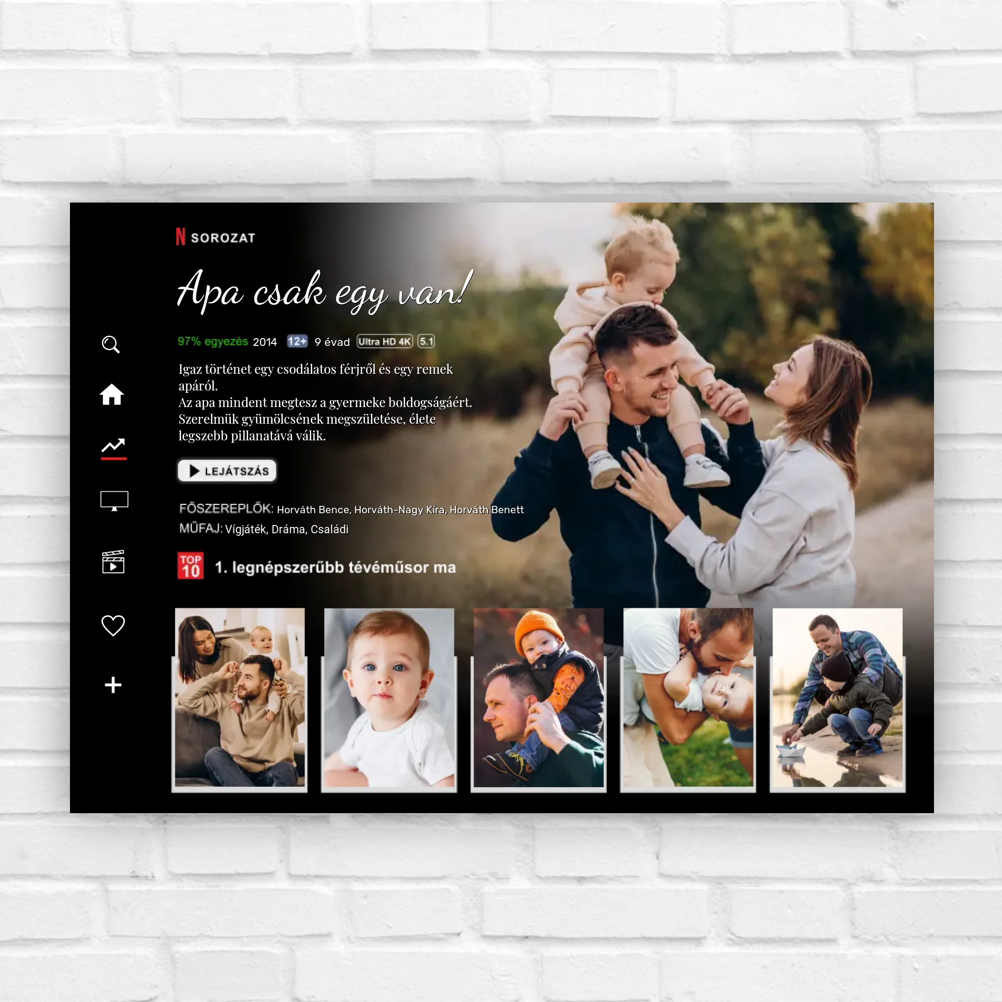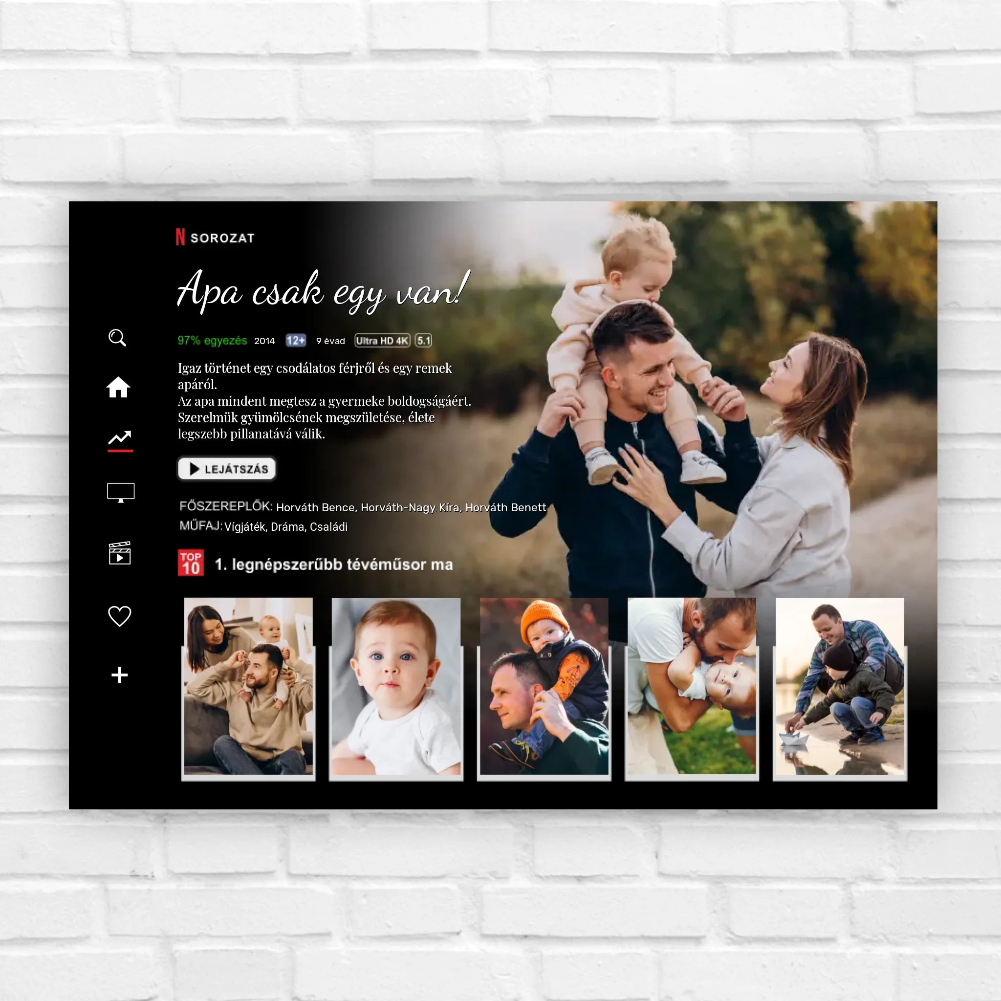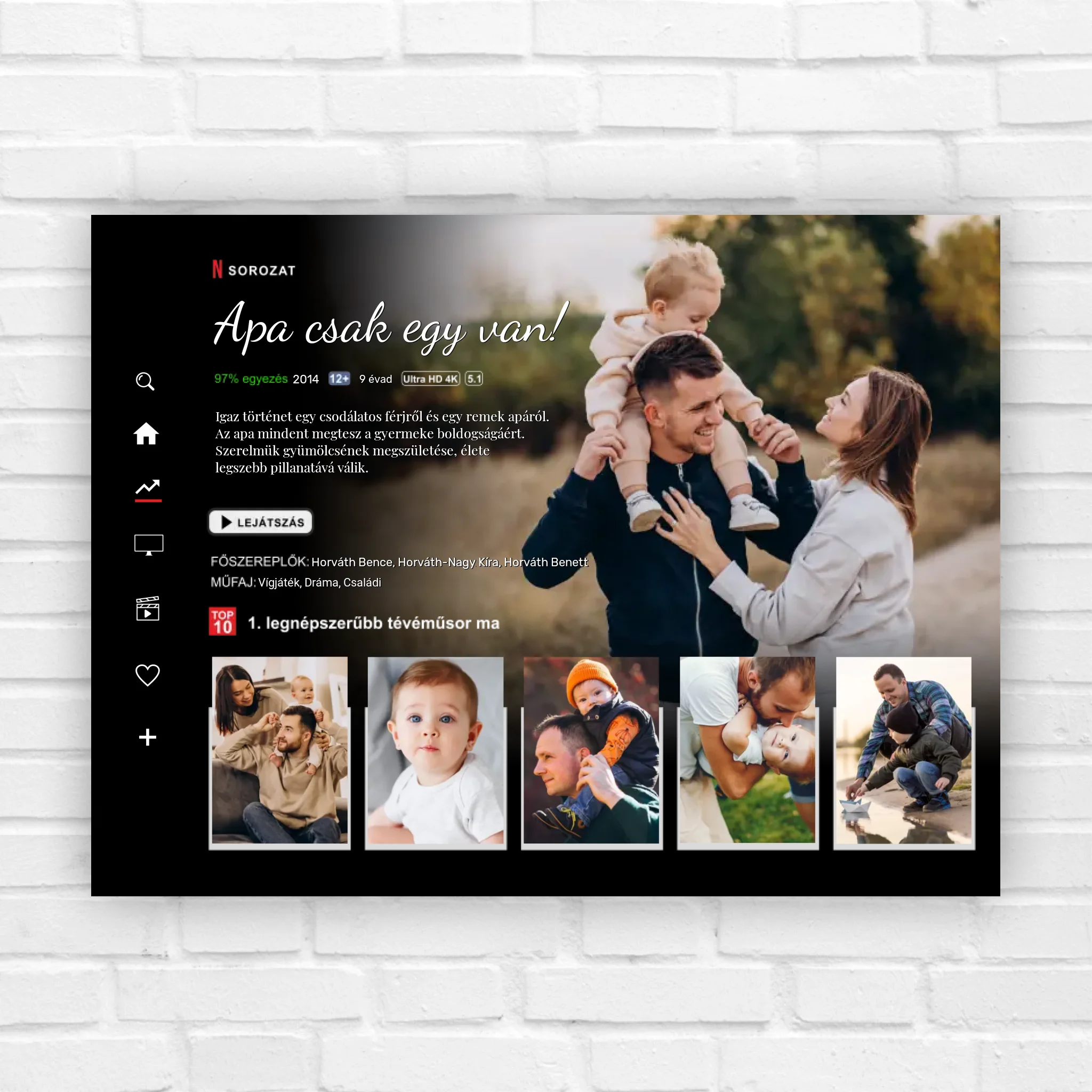 A legújabb termékünk, az apának szóló sorozatos ajándék kép, amely Netflixre emlékeztető stílusú. A kép hátterét és az öt alsó fényképet Te adhatod meg a képre. Ezen kívül Te találhatod ki a sorozat címét, a rövid leírást, a műfajokat és még a szereplőket is. A képen szereplő évszám azt az évet jelöli, amikor átadod az ajándékot az apukádnak. Az évadhoz, pedig 1 évad kerül. Ezek az elemek nem változtathatóak!