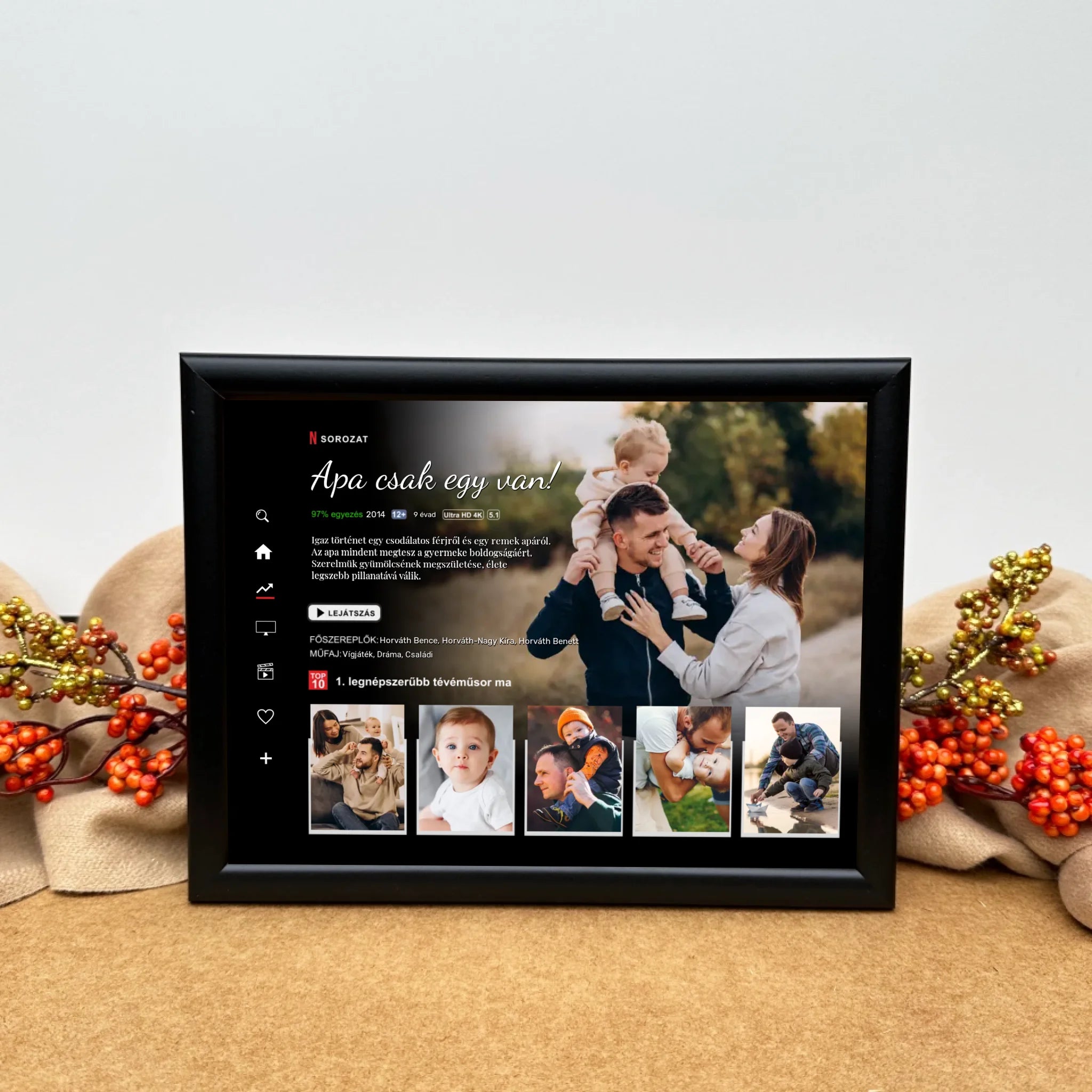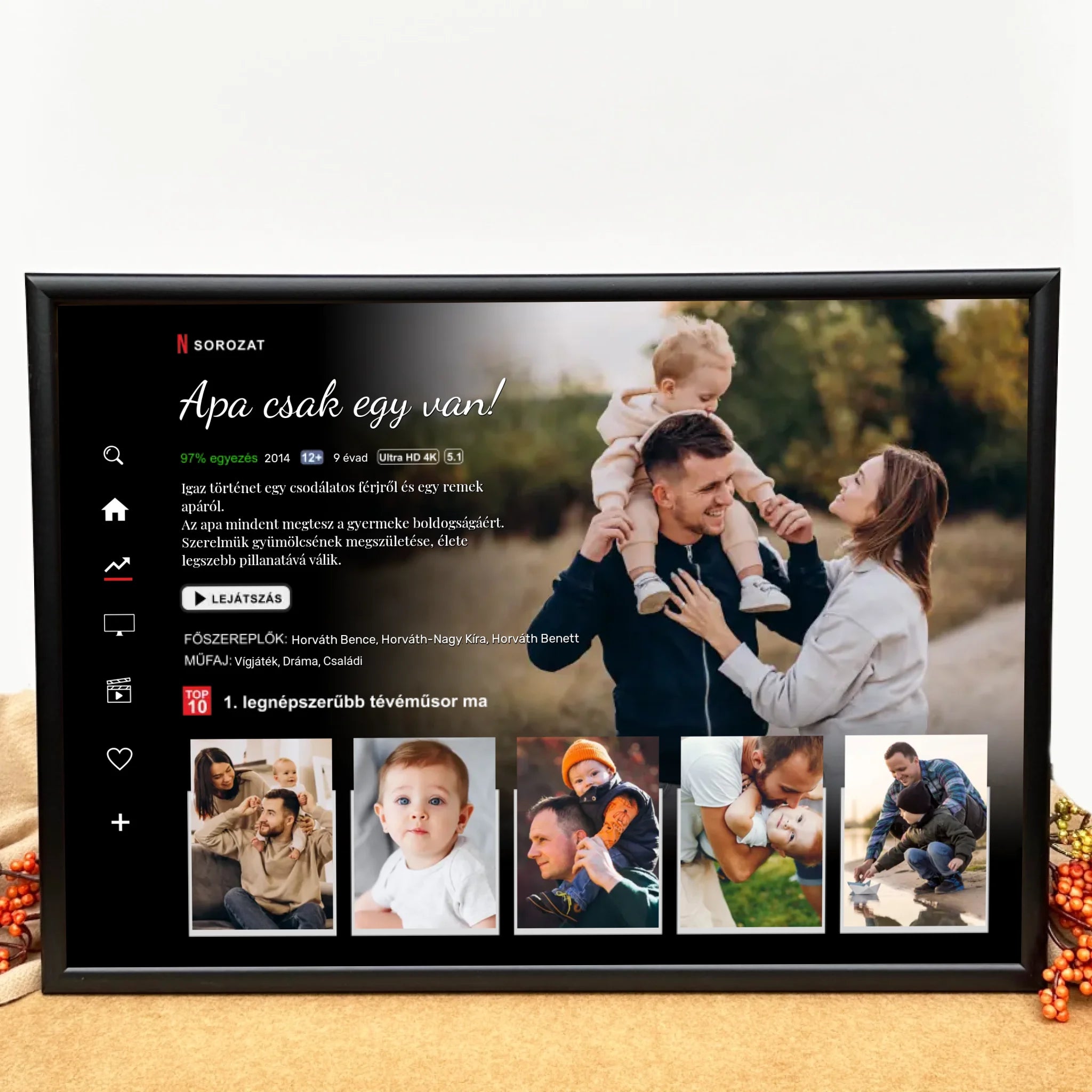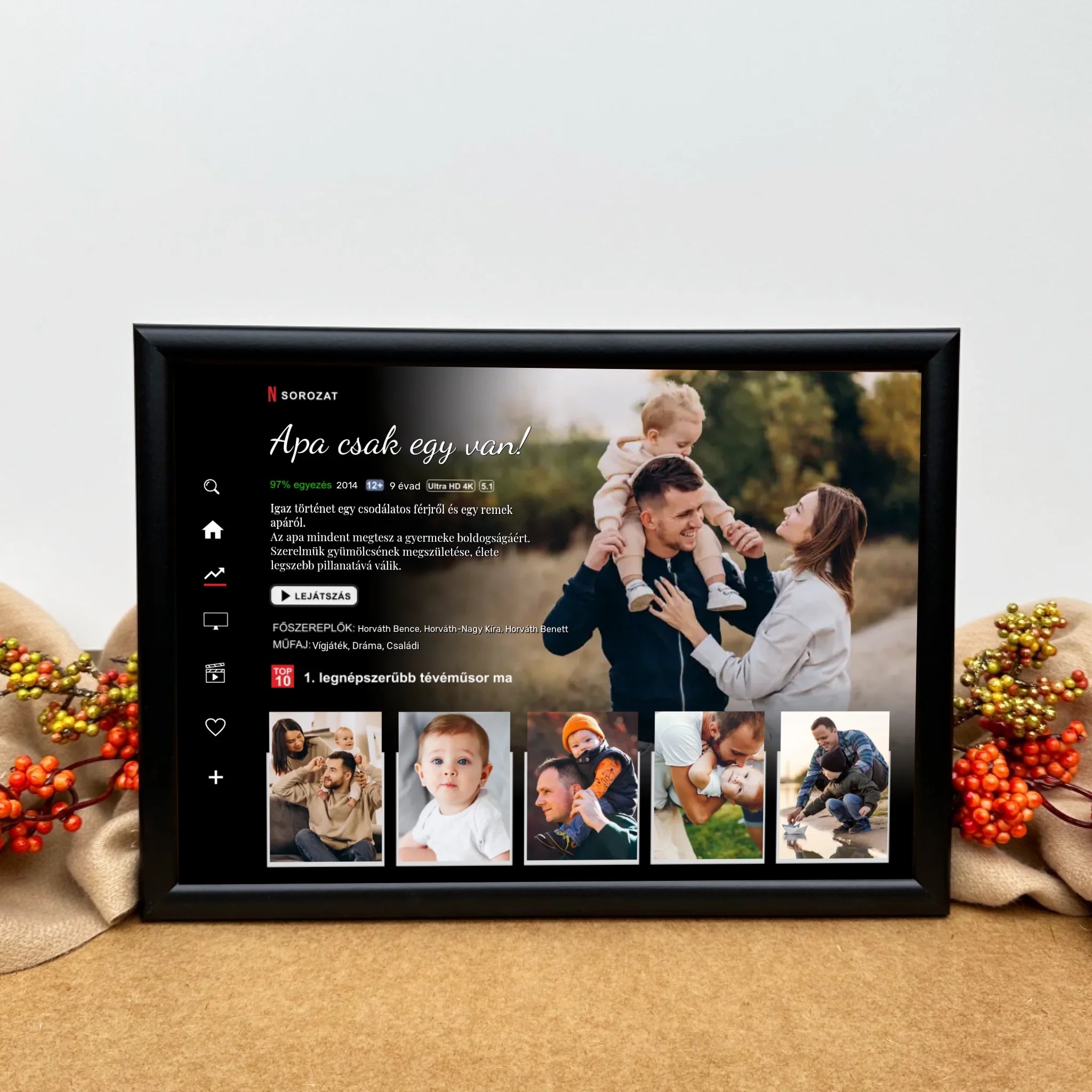 A legújabb termékünk, az apának szóló sorozatos ajándék kép, amely Netflixre emlékeztető stílusú. A kép hátterét és az öt alsó fényképet Te adhatod meg a képre. Ezen kívül Te találhatod ki a sorozat címét, a rövid leírást, a műfajokat és még a szereplőket is. A képen szereplő évszám azt az évet jelöli, amikor átadod az ajándékot az apukádnak. Az évadhoz, pedig 1 évad kerül. Ezek az elemek nem változtathatóak!