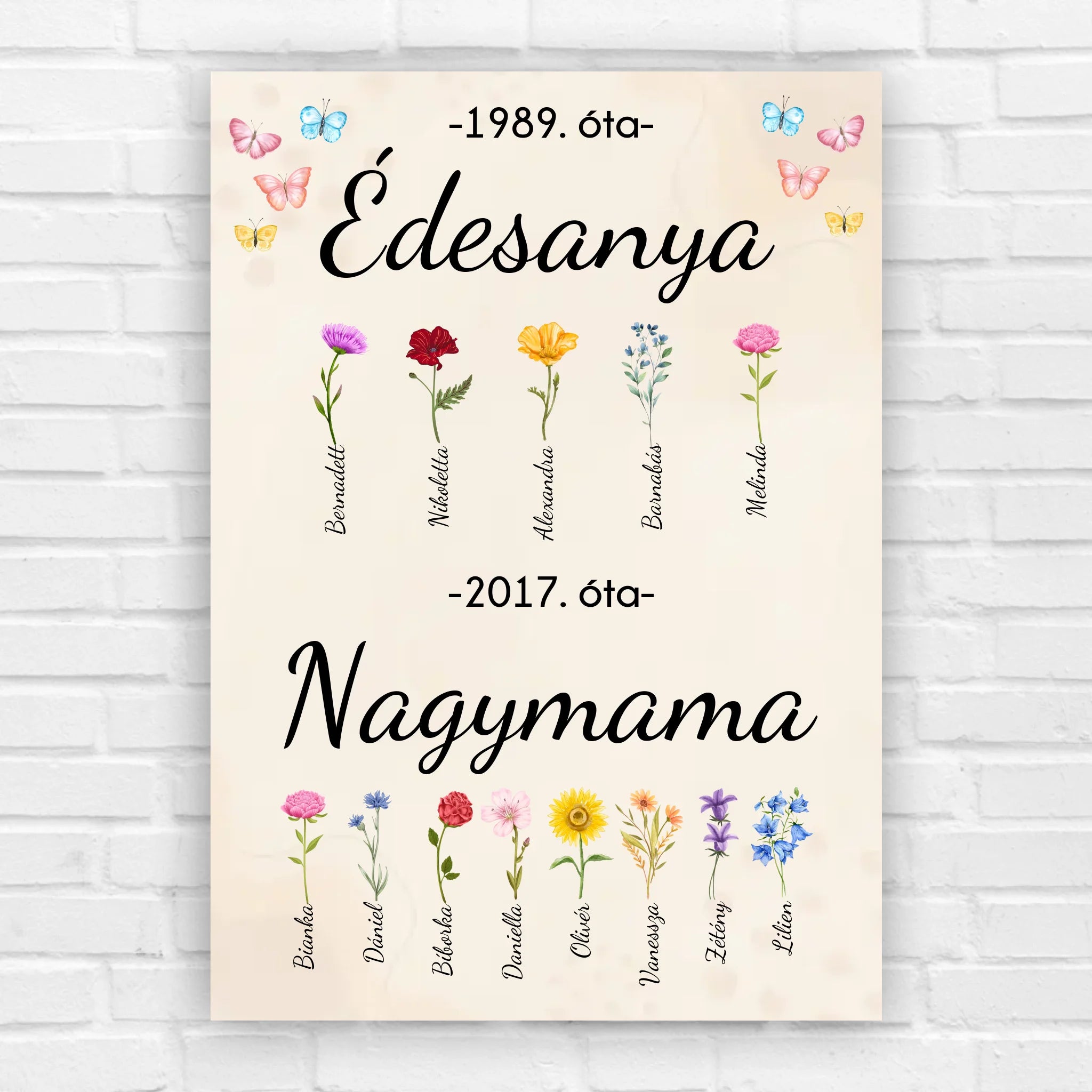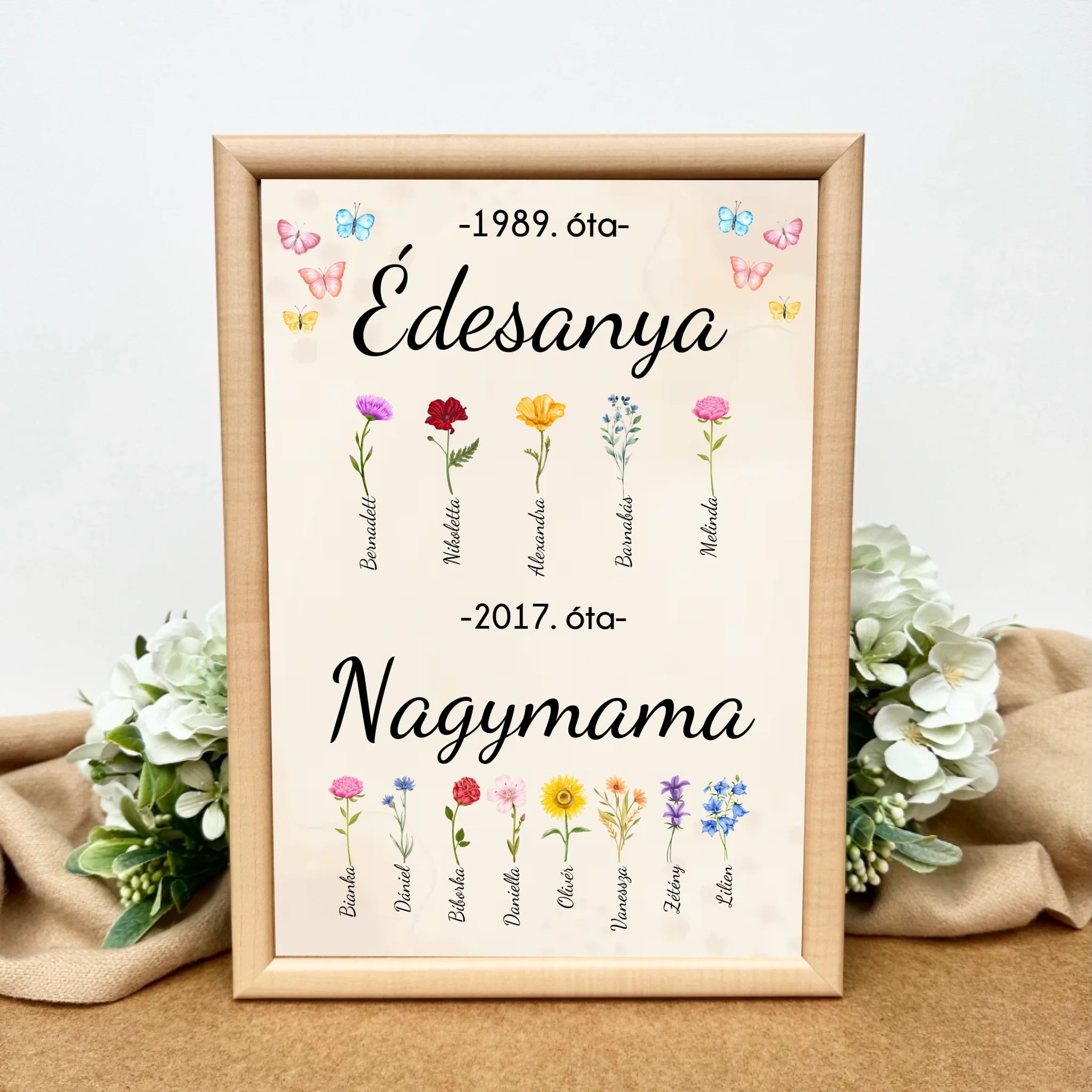A bézs színű háttéren te adhatod meg az unokák és a gyerekek számát, a neveket és az évszámokat. Azt is személyre tudod szabni, hogy melyik névhez milyen fajtájú virág kerüljön, összesen 15 virágfajta közül tudsz válogatni.