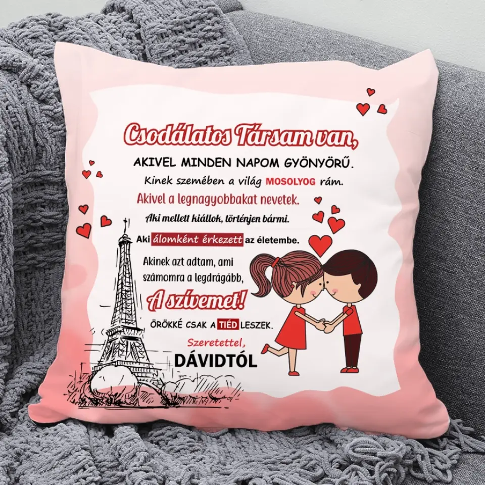 Szerelmes mintájú szívekkel, Eiffel toronnyal ellátott, vidám és romantikus hangulatú párna. Remek Valentin napi ajándék a párodnak. A figurák hajszíne változtatható! Rendelj mellé egy szép szerelmes képeslapot, vagy vásárolj hozzá egy csokor vörös rózsát és lepd meg vele azt, akit a legjobban szeretsz!