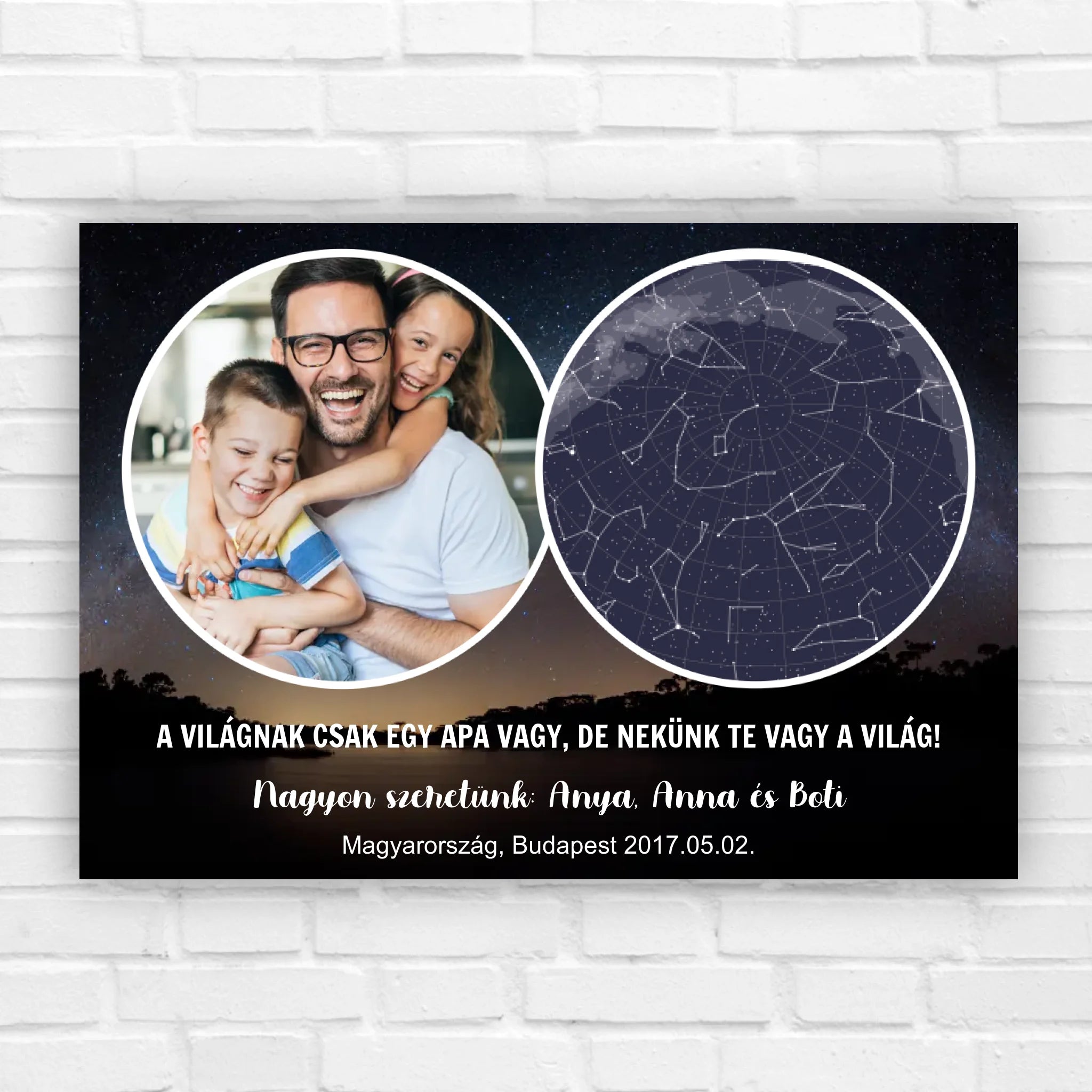 Igényes és egyedi csillagkép édesapáknak, a közös fotótokkal, melyre saját magad adhatsz meg feliratot vagy idézetet, de akár az általunk megadott szöveggel is elkészítjük, ha úgy szimpatikus. Az eredeti felirat a következő: "A világnak csak egy Apa vagy, de nekünk Te vagy a világ".Add meg a helyszínt, a dátumot és már el is készül az egyedi csillagállás.