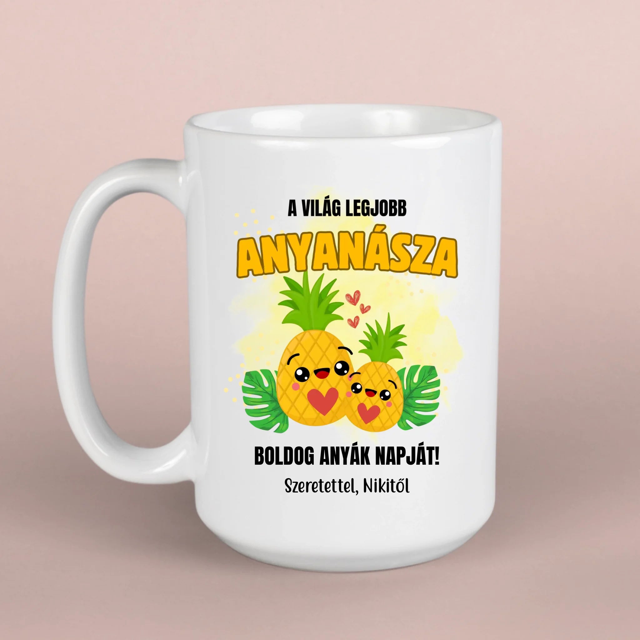 Személyre szabható ajándék, amire az általad megadott szöveg és név kerül. A fehér színű kerámia bögrén két aranyos ananász figurácska látható szívecskékkel és citromsárga háttérrel. Az ajándékon „A világ legjobb Anyanásza.” felirat olvasható.
