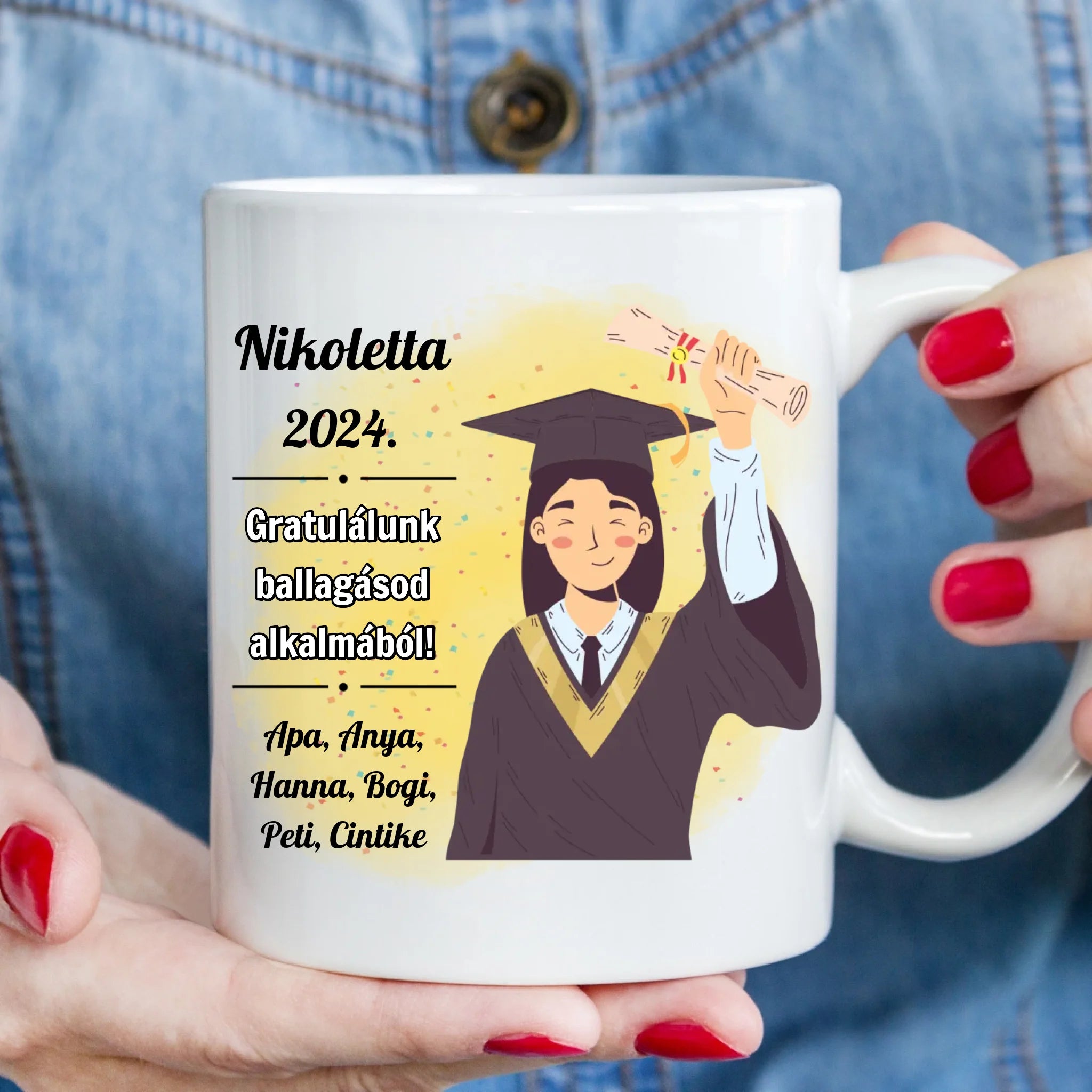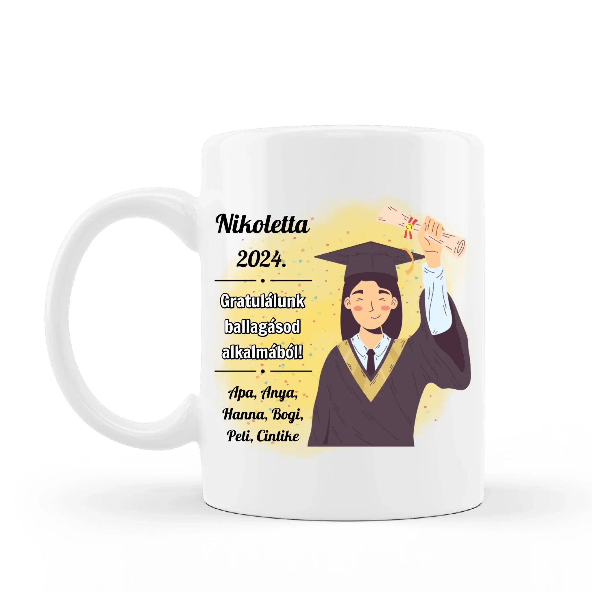 A bögre alapszíne fehér. A tetejére az általad megadott név és dátum kerül. A bögrén, sárga színű háttéren egy ballagó lány figurája látható, aminek kiválaszthatod a hajszínét. Az ajándékra megadhatod még azok neveit is akik ajándékba adják a bögrét a ballagó lánynak, illetve rákerül még az általad megadott egyedi szöveg is.