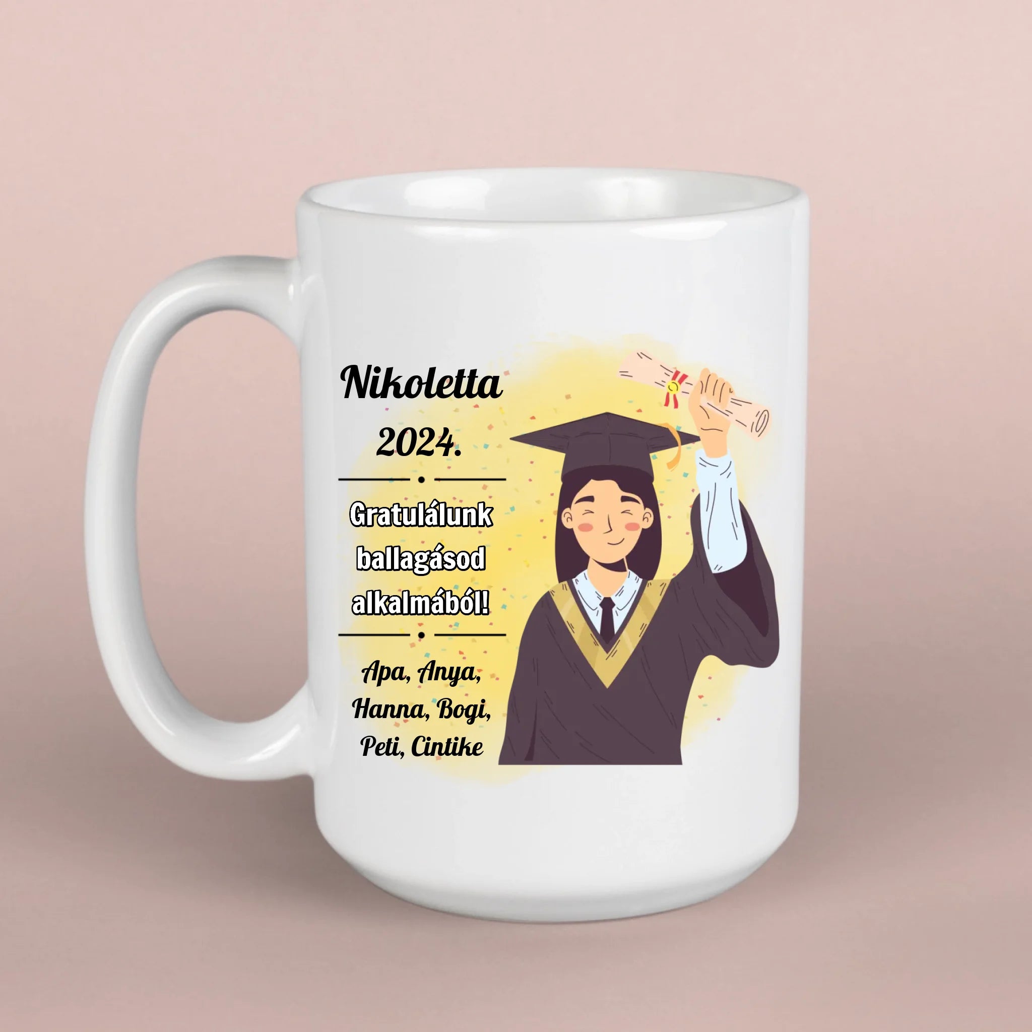 Ha közeleg a tesód, vagy egyik barátnőd ballagása és ballagási ajándék ötletek után kutatsz, akkor nem kell tovább keresgélned. Ez a ballagási bögre tökéletes választás lehet számára. Emlékezetes ballagási ajándék, amely magán viseli a ballagó diák nevét, az elballagás évét és az ajándékozók neveit is. Biztos vagyok benne, hogy bármely végzős lánynak tetszene egy ilyen szép és egyedi bögre.