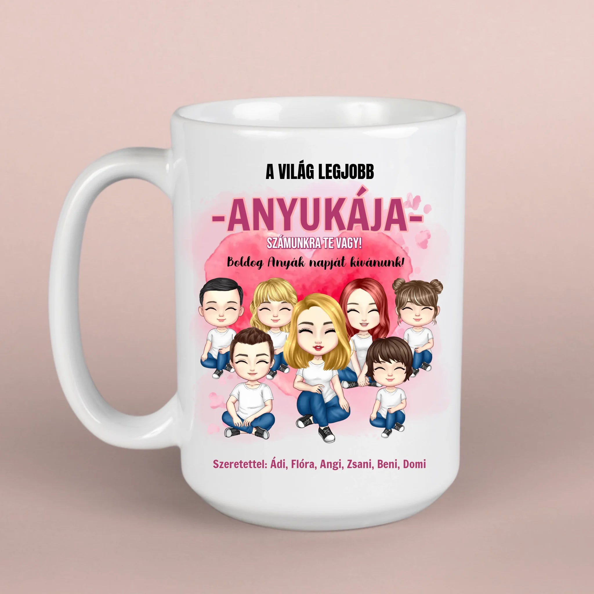 Fehér színű kerámia bögre. Az ajándékot teljesen személyre tudod szabni. A rózsaszín szívecske háttérre te adhatod meg a neveket és a figurákat kedved szerint alakíthatod. Kiválaszthatod milyen típusú és színű haja, bőre és felsője legyen a karaktereknek. Maximum 6 gyereket tudsz megadni a bögrére. Ezen kívül az ajándékra „A világ legjobb Anyukája számunkra Te vagy! Boldog Anyák napját kívánunk!” felirat kerül.