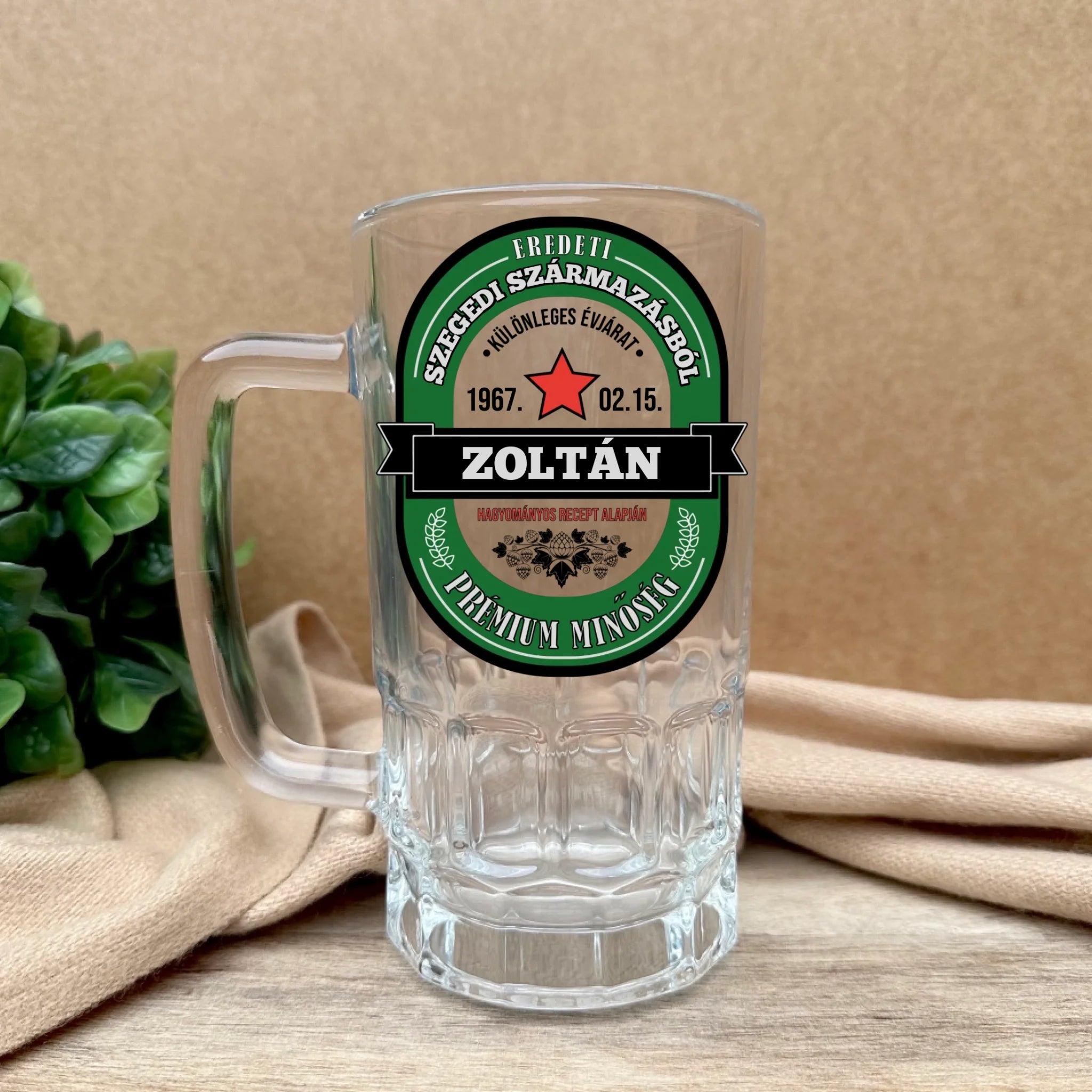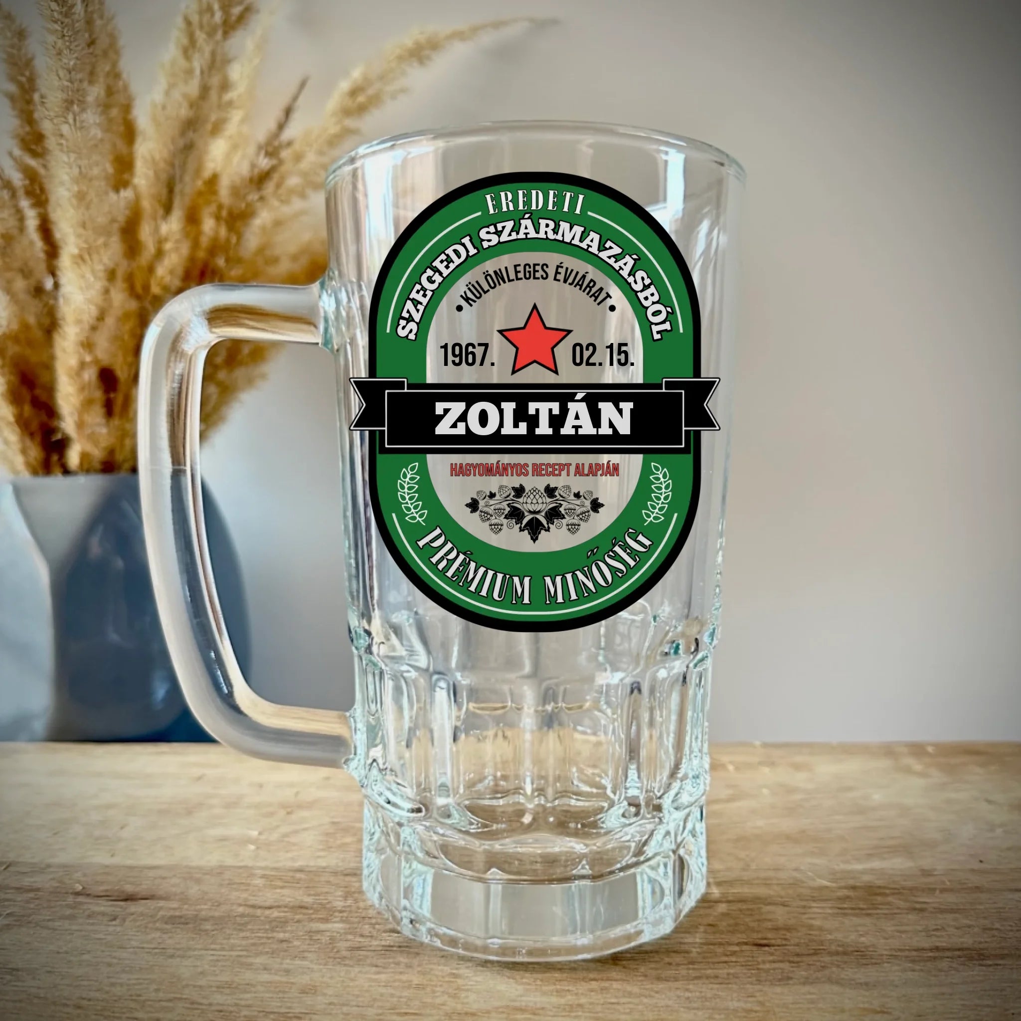 Saját névvel, születési dátummal és helyszínnel ellátott, egyedi söröskorsó üvegből. Tökéletes ajándék egy sörimádó férfi szeretted születésnapjára, névnapjára, vagy karácsonyra.