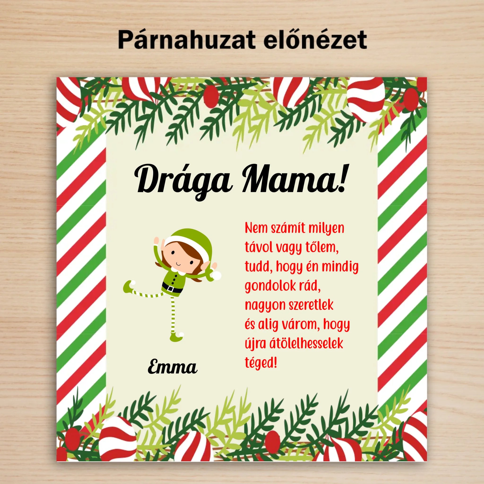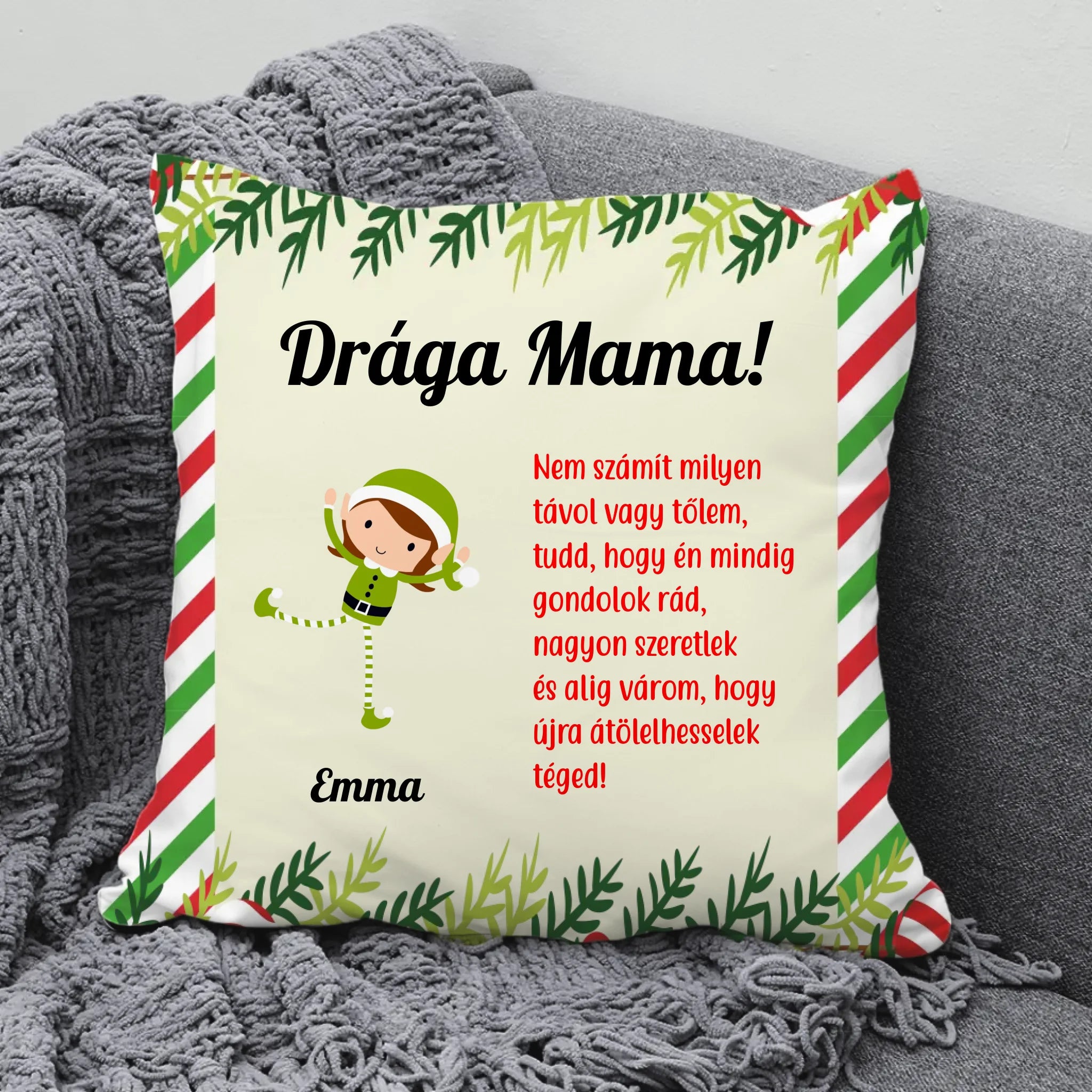 Karácsonyi mintájú dekorcsíkkal ellátott, vidám és ünnepi hangulatú manós párna. Remek karácsonyi ajándék a nagyiknak, vagy a dédiknek. A figurák alá az általad kért neveket írjuk. A megszólítás és a szöveg is módosítható. A nagyi biztosan nagyon örülne egy olyan karácsonyi meglepetésnek, amely az imádott unokáiról mesél.