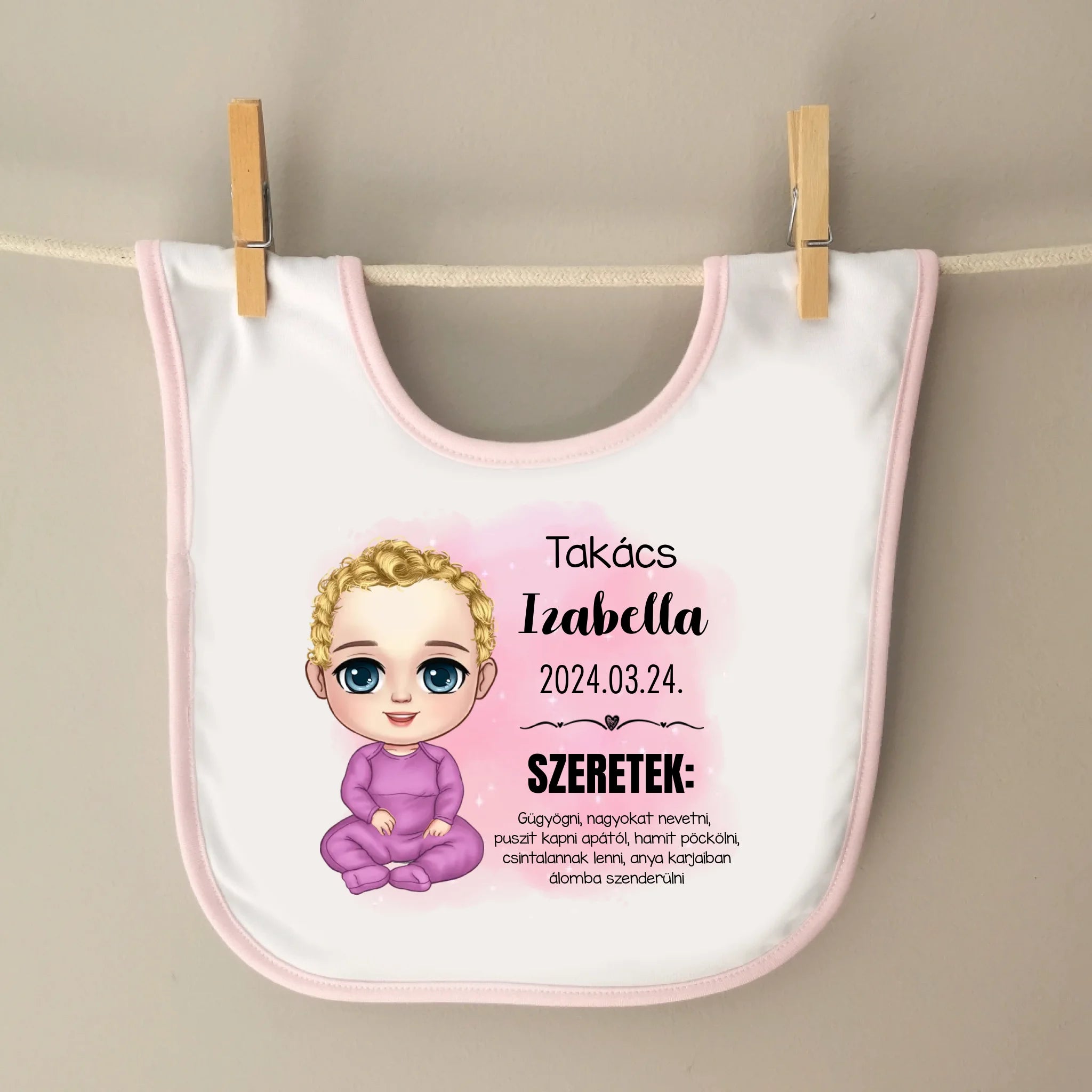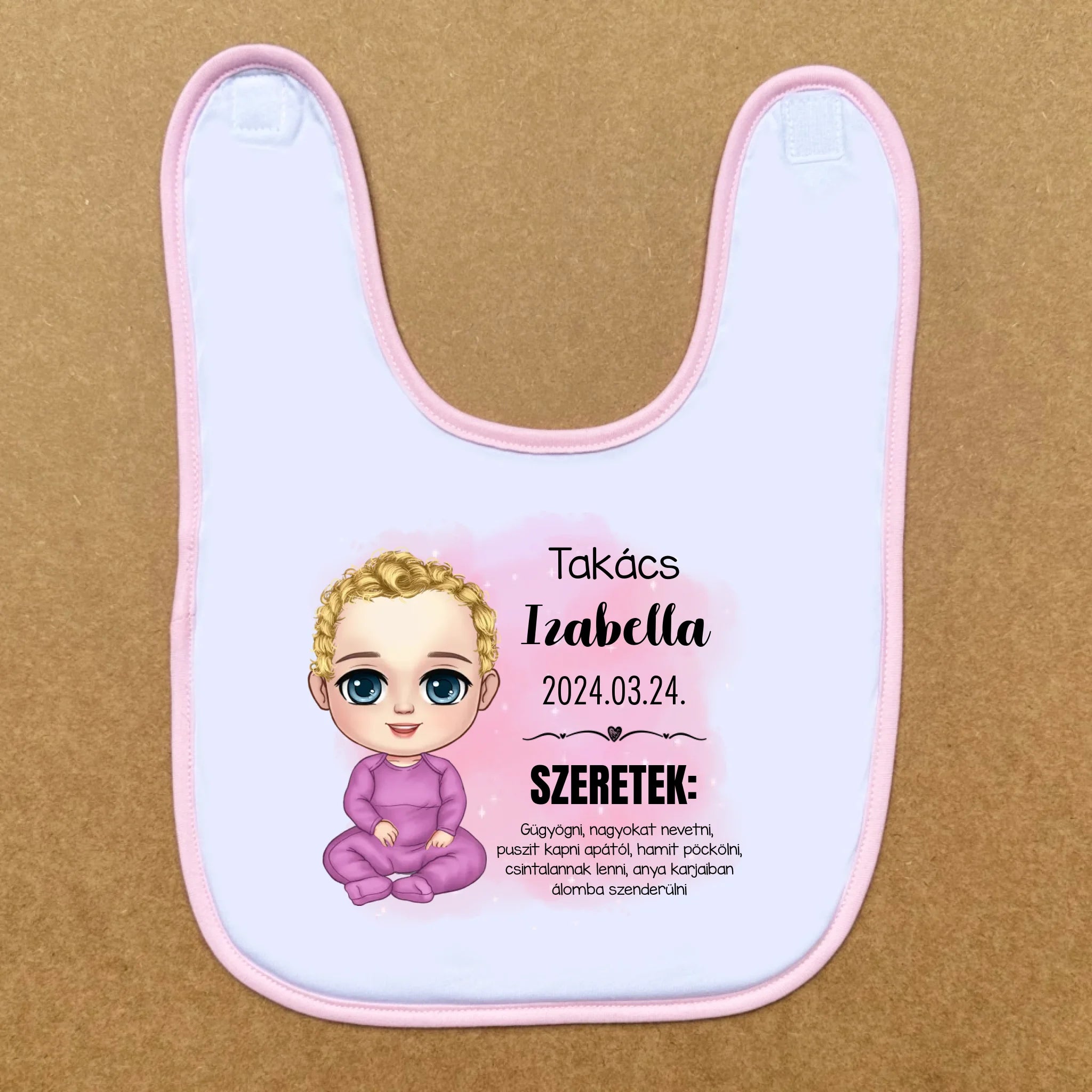 Fehér színű baba előke rózsaszín szegéllyel kislányoknak, személyre szabható kisbaba figurácskával, amit teljesen személyre tudsz szabni. Kiválaszthatod a bőr, a haj és a szemek színét. Kiválaszthatod még a ruha színét is, választhatsz hozzá cumit és fejdíszt.