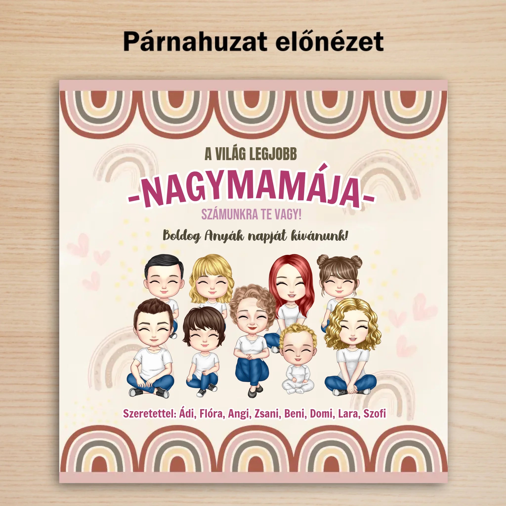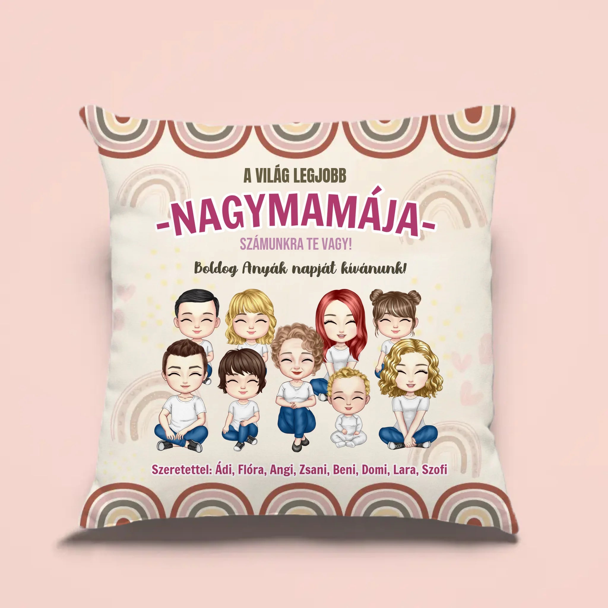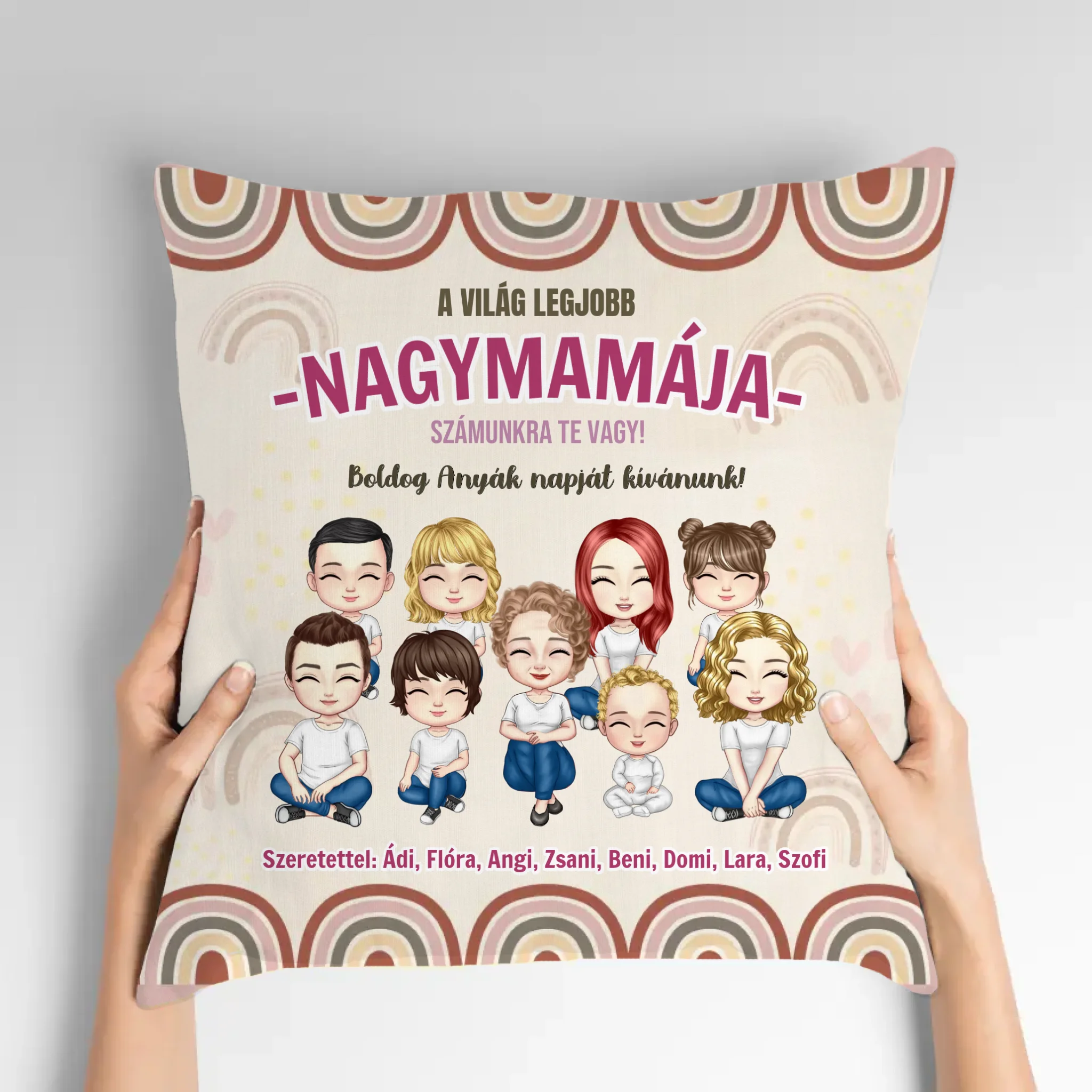A párna teljesen személyre szabható. A bézs színű háttere maximum 8 unokát tudsz megadni és azt is kiválaszthatod, hogy milyen típusú és színű haja, bőre és ruhája legyen a karaktereknek. Az unokás párnára „A világ legjobb –nagymamája- számunkra te vagy! Boldog Anyák napját kívánunk!” felirat kerül, ezen kívül még megadhatod az unokák neveit is. A párna nem csak egyedi ajándék, de még meseszép dekorációs elem is.