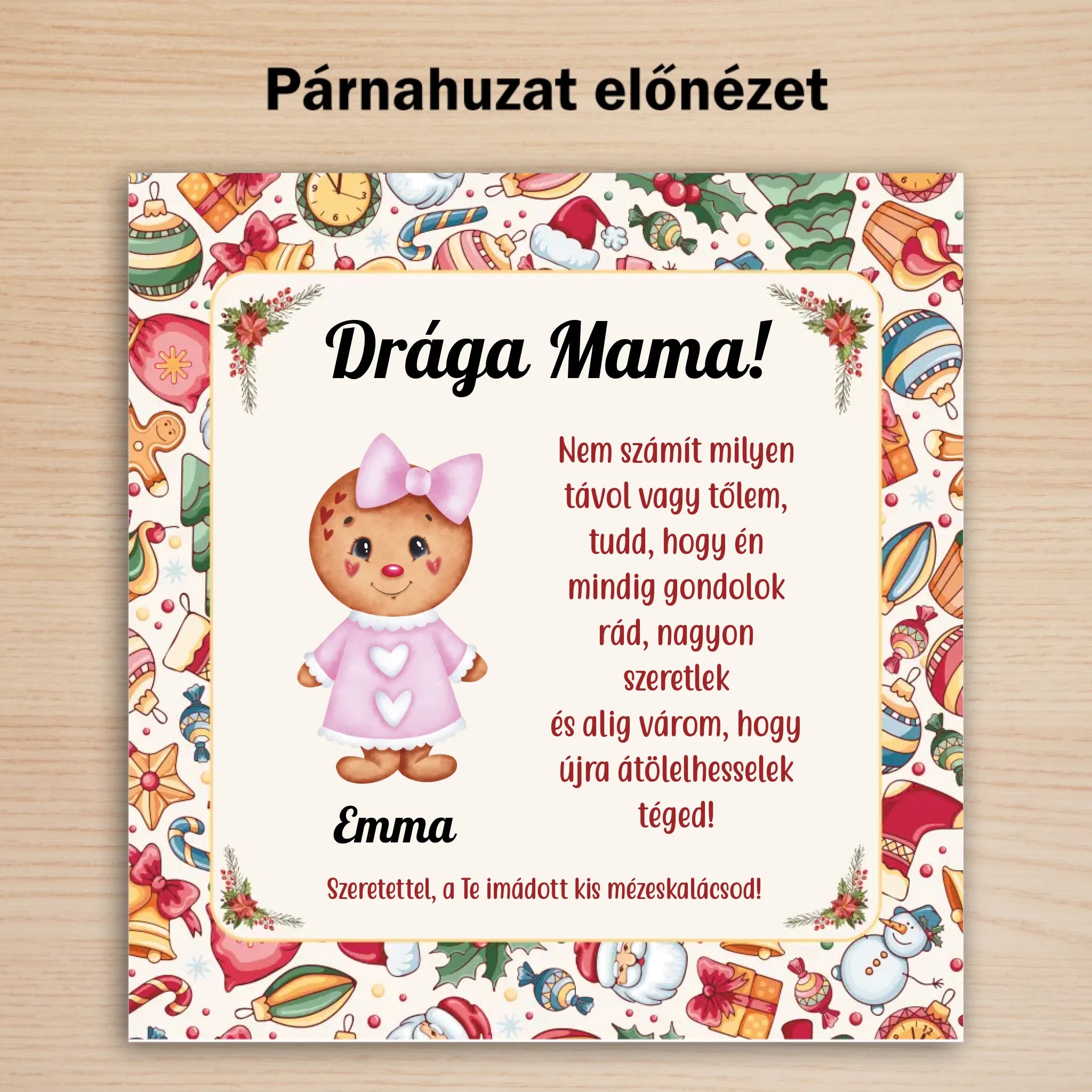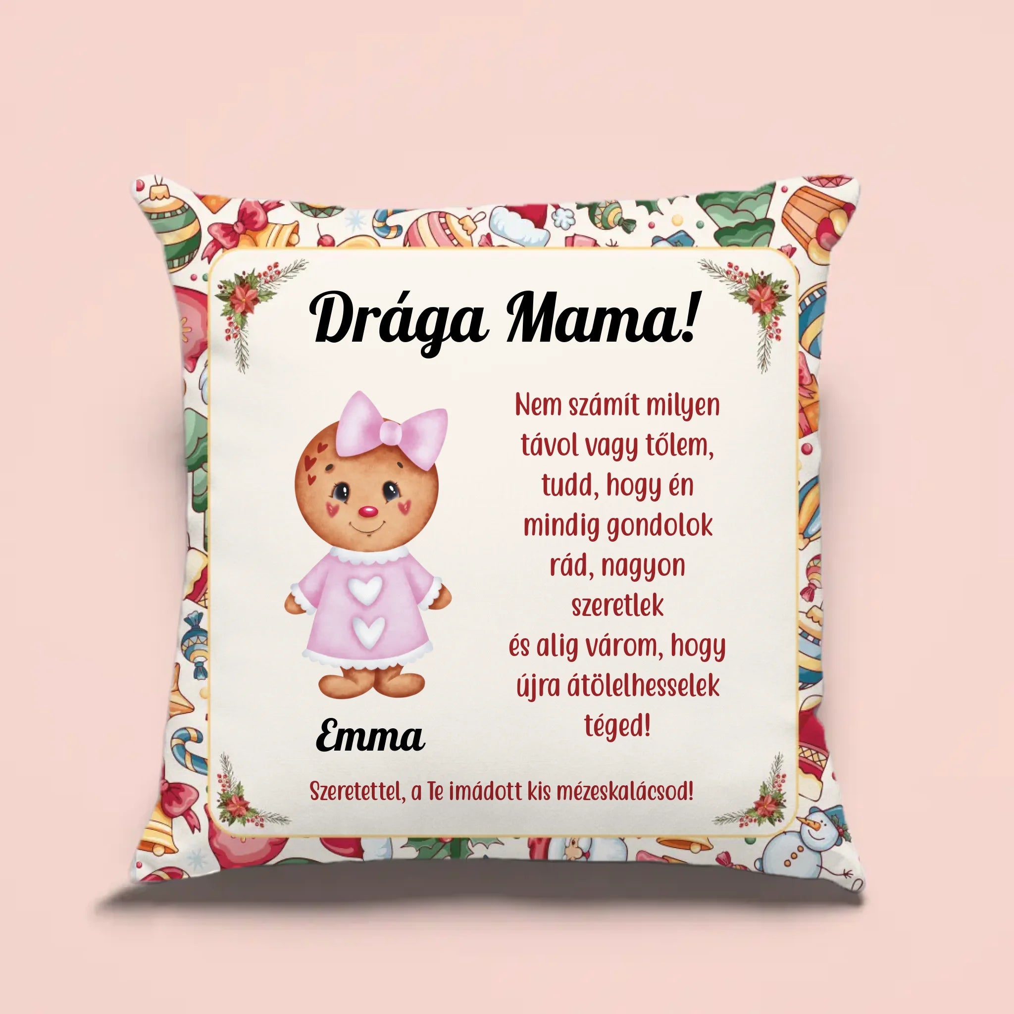 Karácsonyi mintájú dekorcsíkkal ellátott, vidám és ünnepi hangulatú mézeskalácsos párna. Remek karácsonyi ajándék a nagyiknak, vagy a dédiknek. A figurák alá az általad kért neveket írjuk. A megszólítás és a szöveg is módosítható. A nagyi biztosan nagyon örülne egy olyan karácsonyi meglepetésnek, amely az imádott unokáiról mesél.