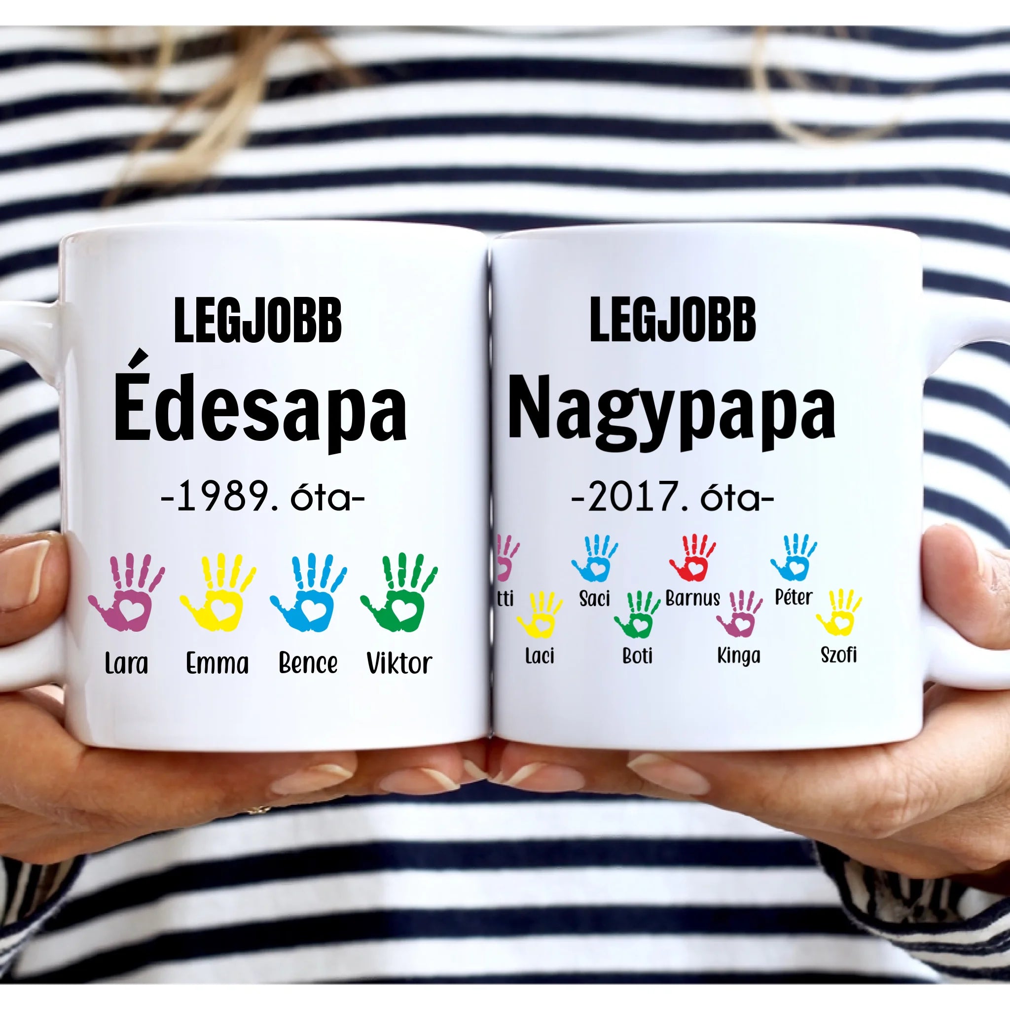 A bögrére te adhatod meg az unokák és a gyerekek számát, a neveket és az évszámokat. Azt is személyre tudod szabni, hogy melyik névhez milyen színű kéznyom kerüljön.