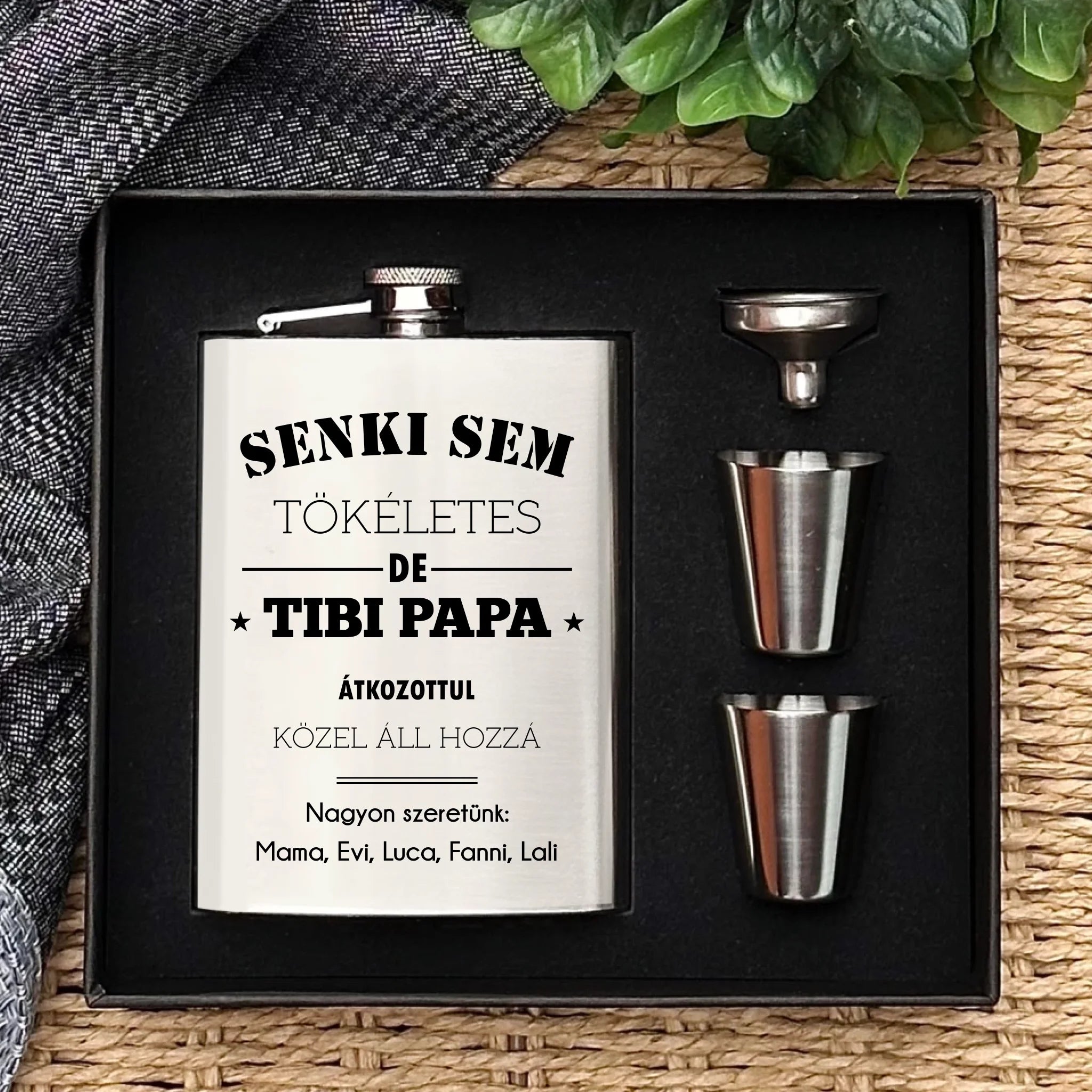 Nemesacél anyagú, egyedileg gravírozott nagypapának szóló flaska szett, amely tökéletes  ajándék édesapáknak, nagypapiknak karácsonyra, születésnapra, vagy Apák napja alkalmából. A szett egy darab gravírozott laposüveget, 2 db acél poharat és egy darab utántöltő tölcsért tartalmaz. Igazi vagány, értékes ajándék ötlet férfiak számára.
