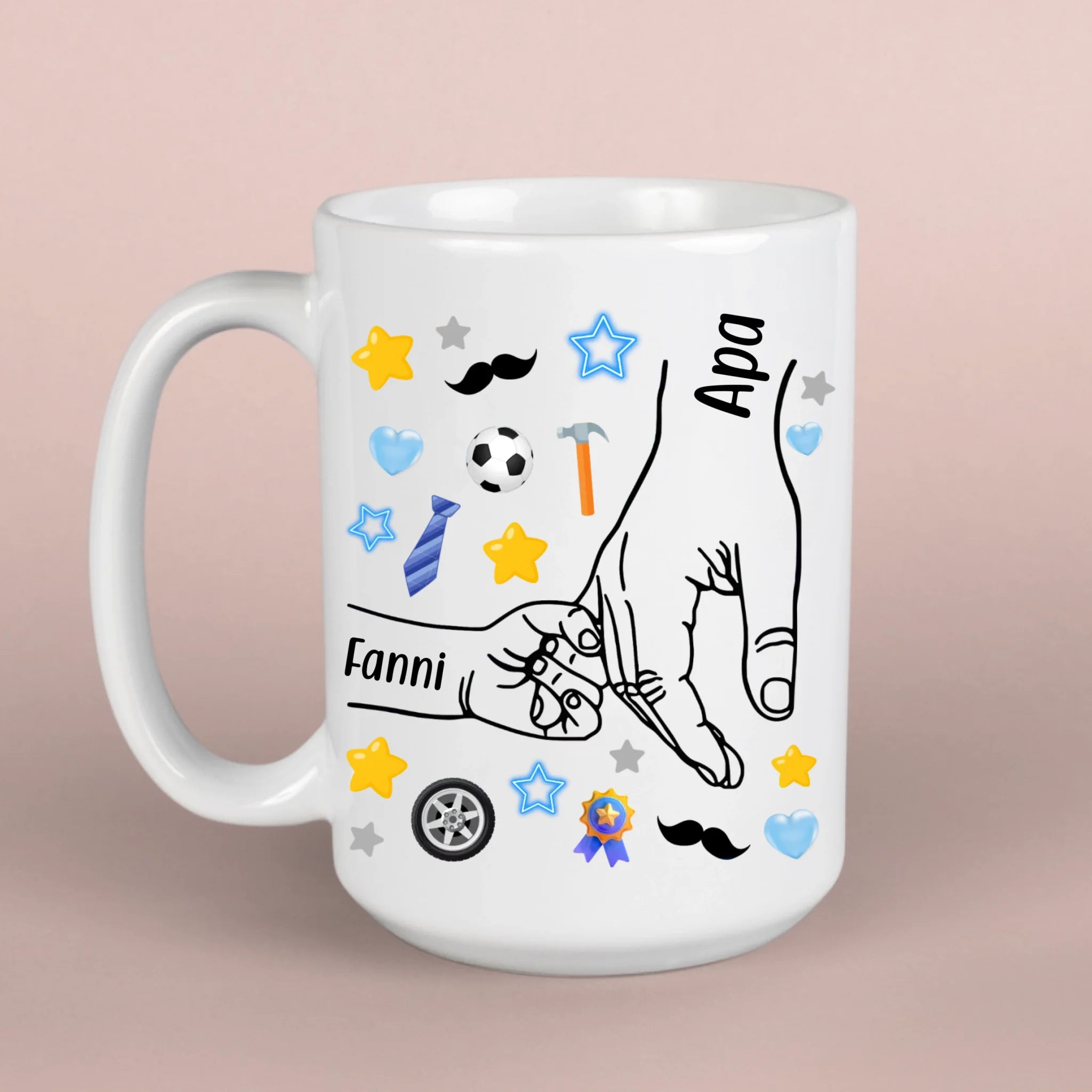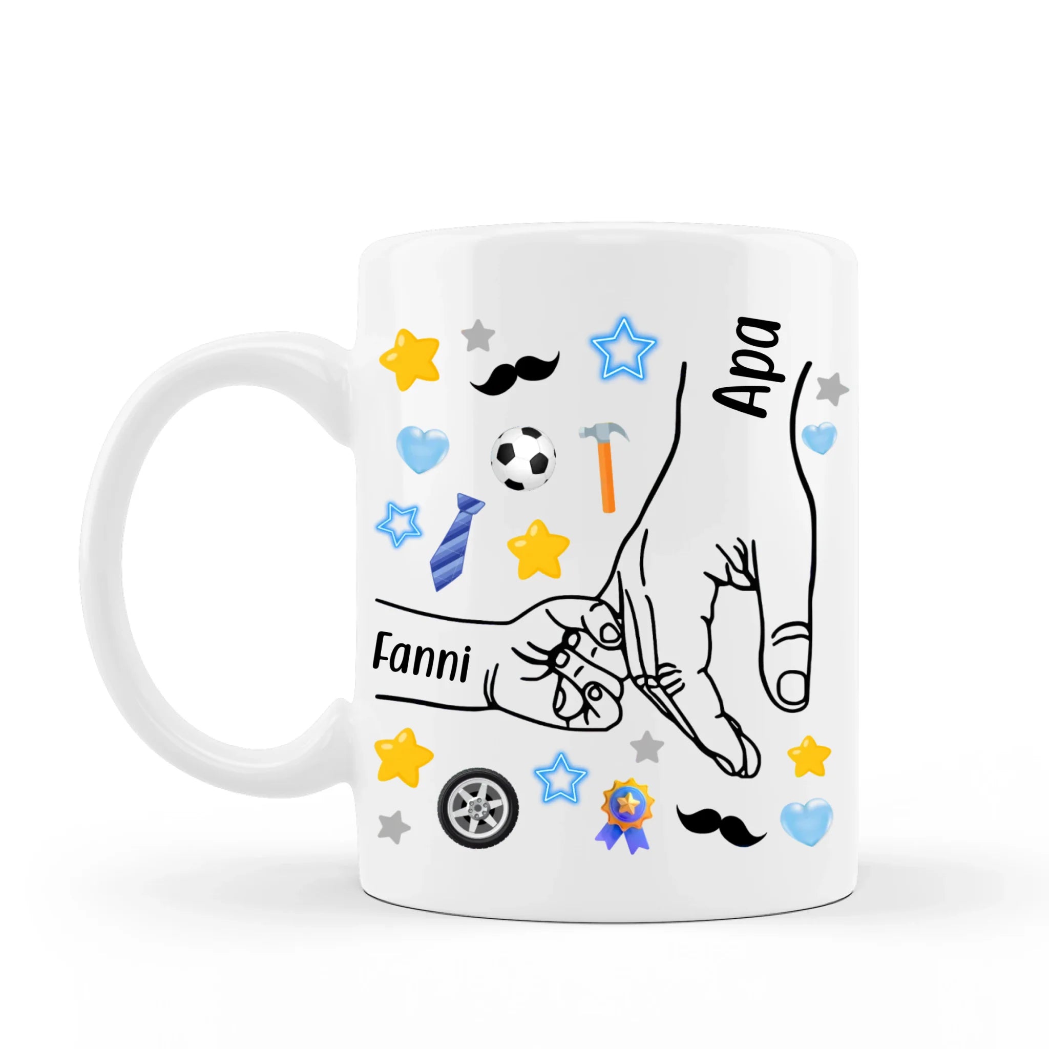 Közeleg az Apák napja, vagy az édesapád születésnapja? Ajándékozd meg őt egy bájos, kéz a kézben bögrével. Akár 7 gyermek nevével is kérheted. Az elején apukás motívumok a választott gyermekek számához tartozó kezek és a nevek fognak szerepelni.