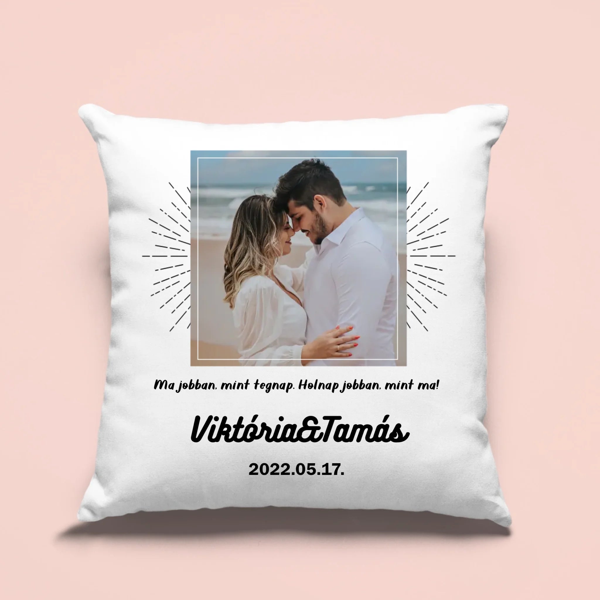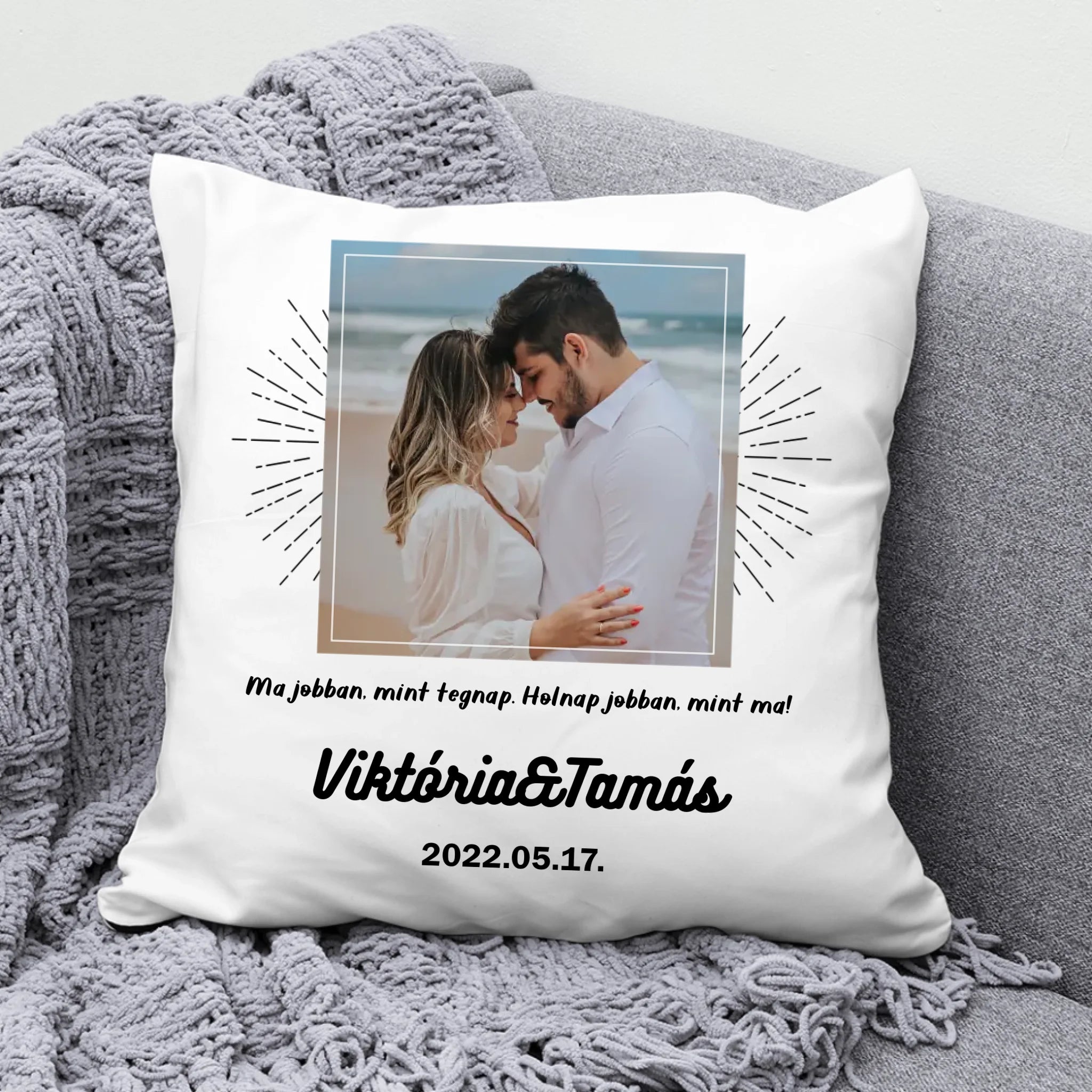 Fehér alapú párna, saját fényképpel, romantikus idézettel, a keresztnevetekkel és a megismerkedésetek dátumával. Kézi mosó programon vagy öblítéssel ajánljuk mosni.