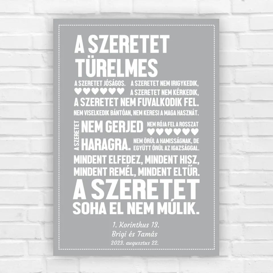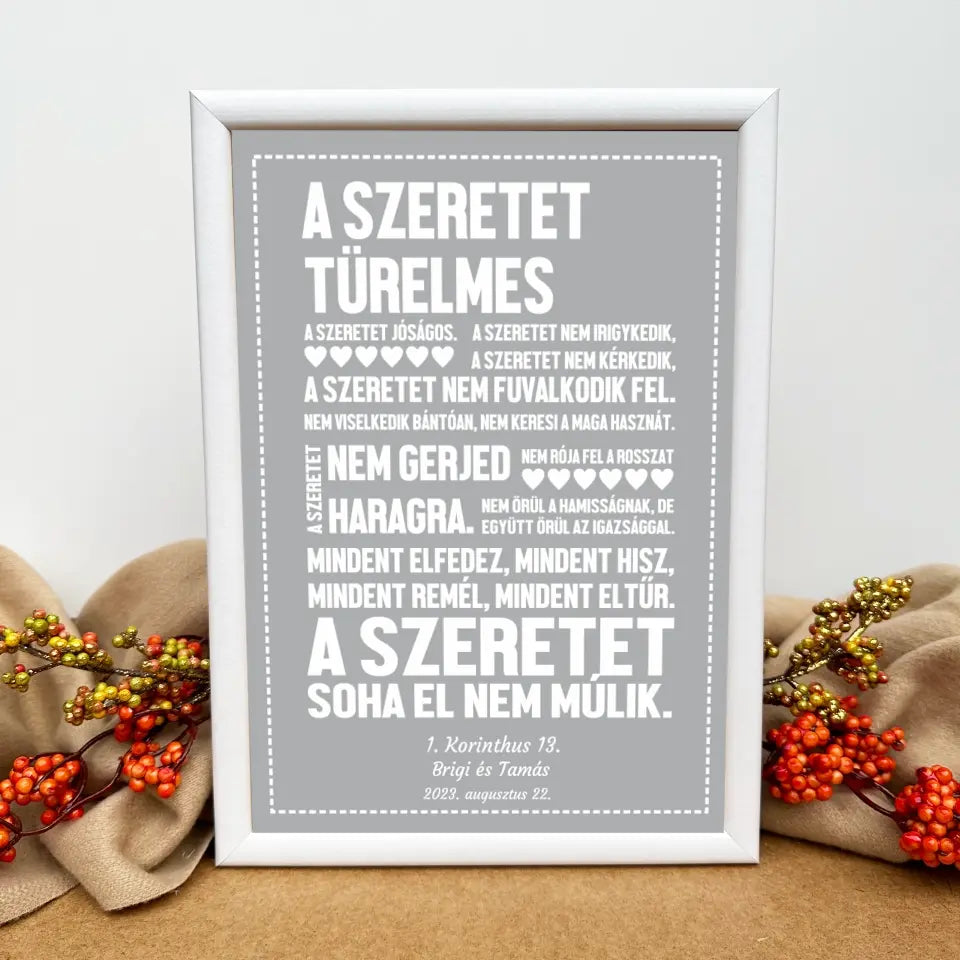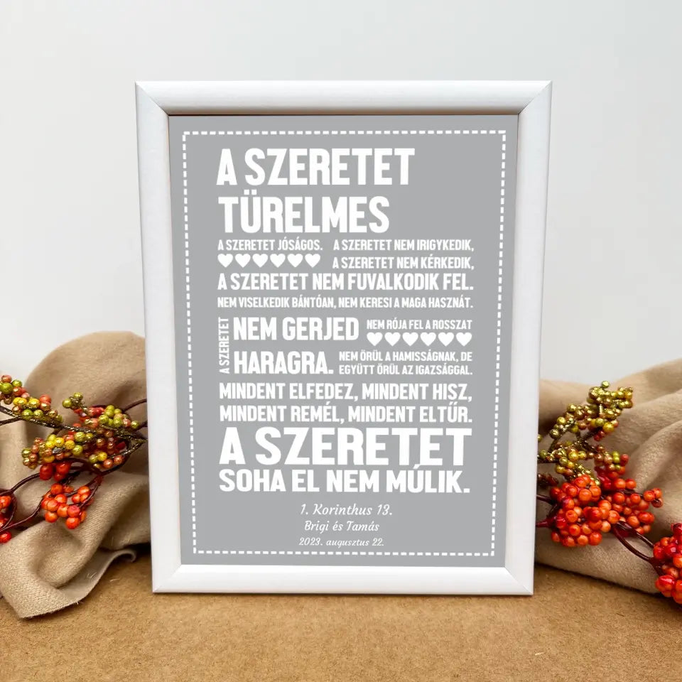 Meseszép esküvőre szánt ajándék. Rajta az alábbi szöveggel: „A szeretet türelmes, jóságos; a szeretet nem irigykedik, a szeretet nem kérkedik, nem fuvalkodik fel. Nem viselkedik bántóan, nem keresi a maga hasznát, nem gerjed haragra, nem rója fel a rosszat. Nem örül a hamisságnak, de együtt örül az igazsággal. Mindent elfedez, mindent hisz, mindent remél, mindent eltűr. A szeretet soha el nem múlik.” (1 Korinthus 13.)