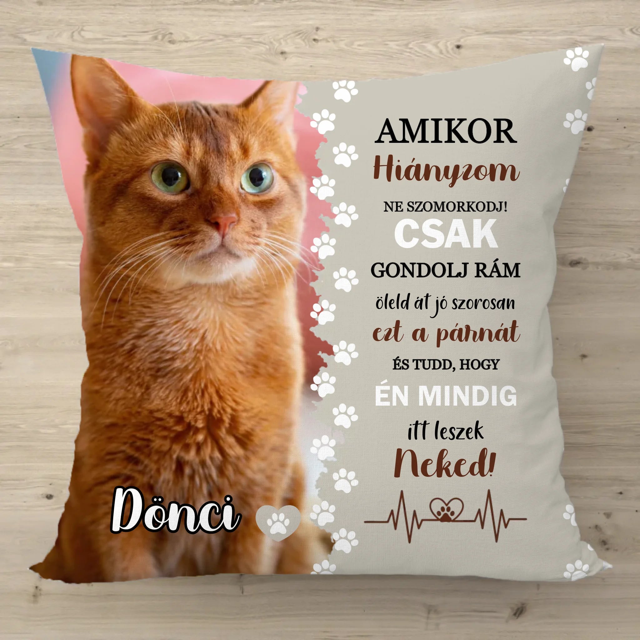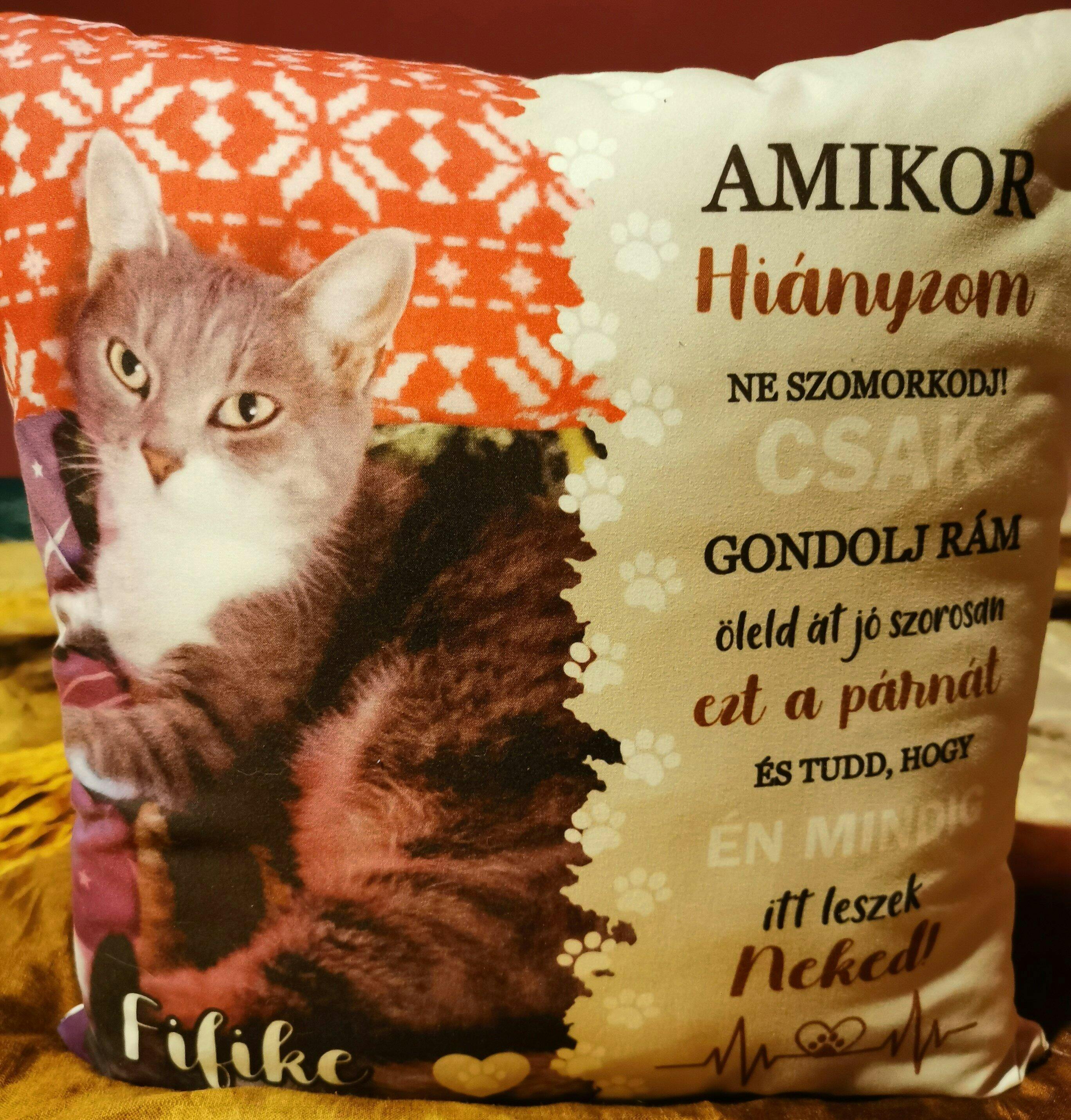 Személyre szabható párna, amire az általad megadott kép kerül a cicusról, a kiskedvenc nevét is megadatod. A párnára egy igazán megható idézet kerül: „Amikor hiányzom, ne szomorkodj! Csak gondolj rám, öleld át jó szorosan ezt a párnát és tudd, hogy én mindig itt leszek Neked!”. Ezt az idézetet olvasva biztosan megfog hatódni.