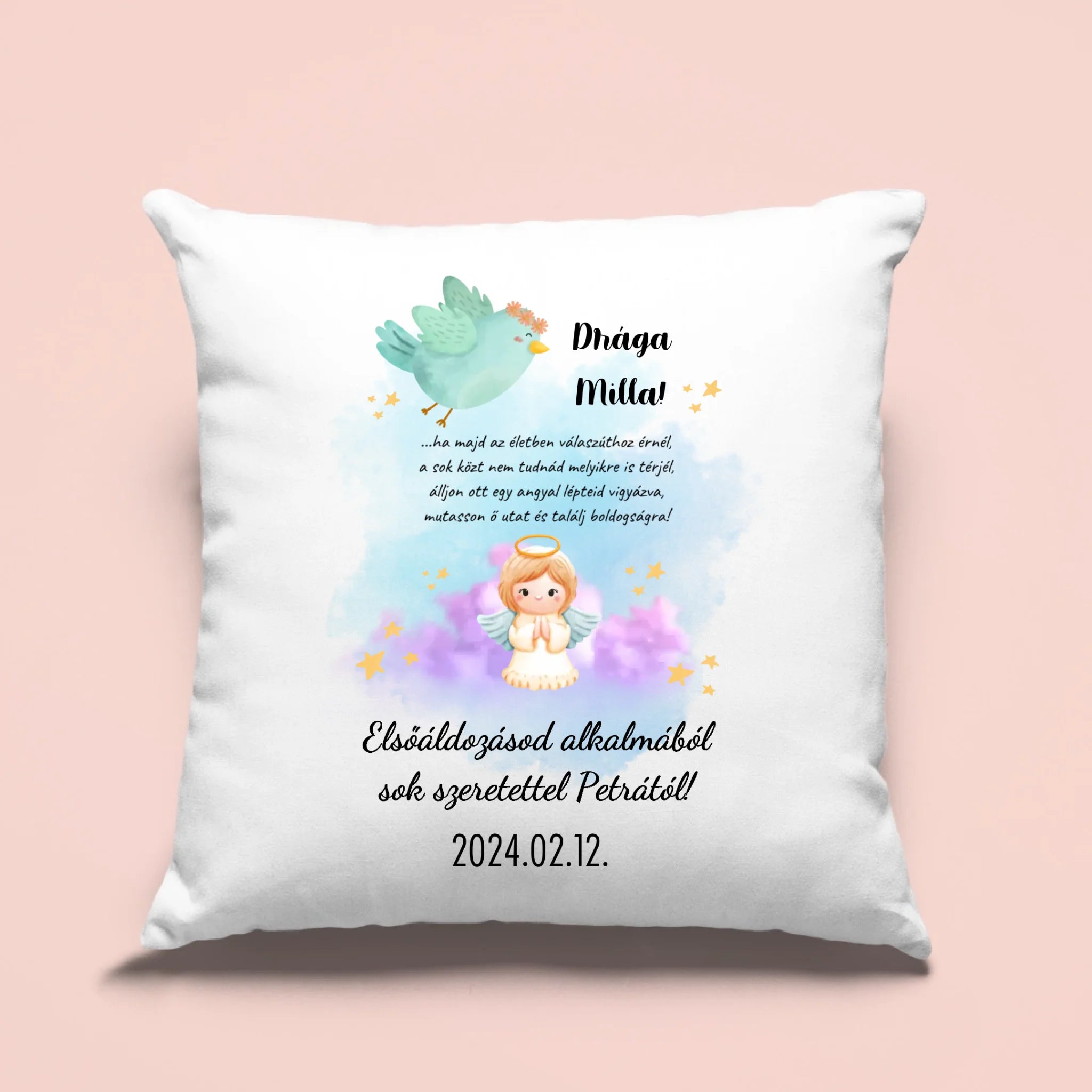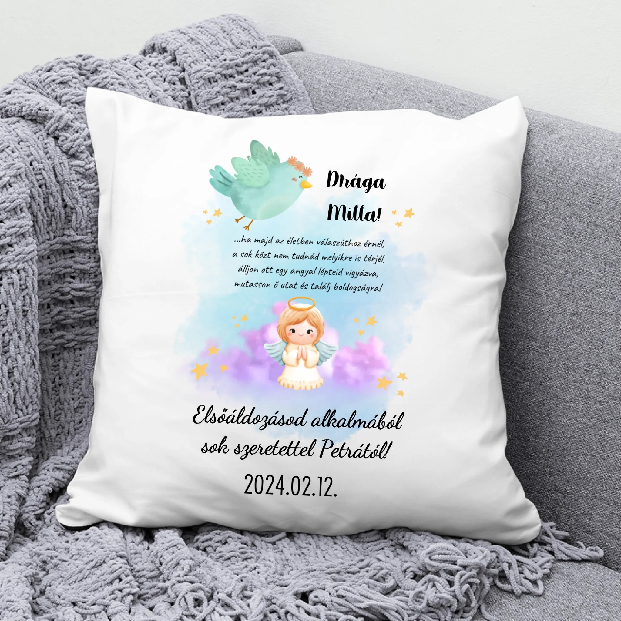 A párnán egy kék színű kismadár és egy aranyos angyalka grafikája látható, kellemes hangulatú, kékes-lilás színű háttérrel. A párnát teljesen személyre tudod szabni, a huzatra az általad megadott nevek, szöveg és dátum kerül. Ezen kívül a párnára a következő szöveg kerül: „… ha majd az életben válaszúthoz érnél, a sok közt nem tudnád melyikre is térjél, álljon ott egy angyal lépteid vigyázva, mutasson ő utat és találj boldogságra!”. Az ajándékozott sok-sok év után is, ha elolvassa ezt az idézetet, biztosan megfog hatódni és eszébe jutnak majd a szép emlékek.