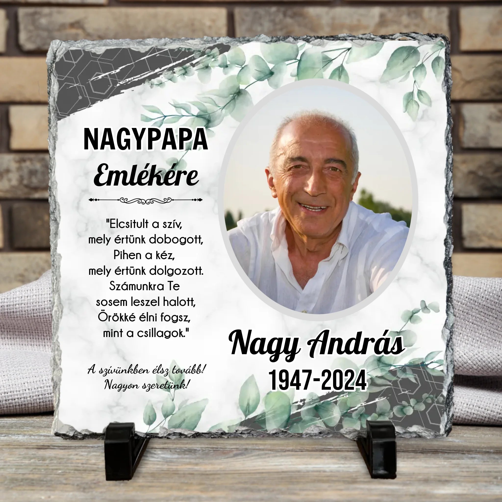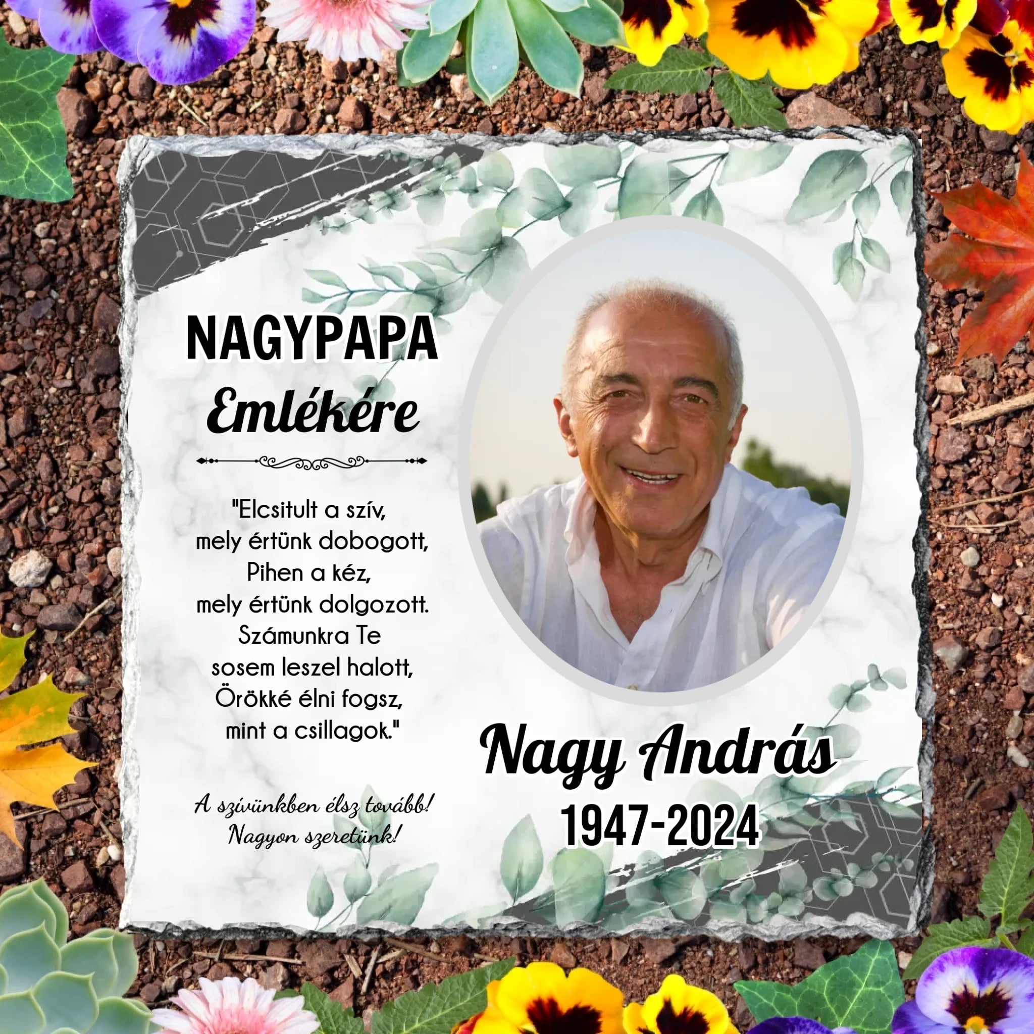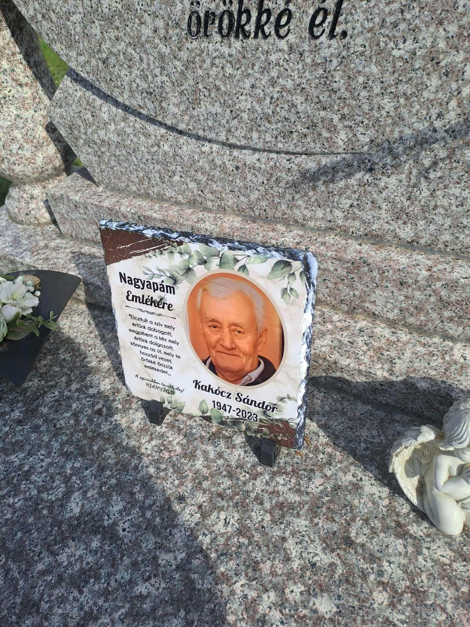 A táblára a szeretted fényképe, egy szép idézet, a szeretted neve és az évszám kerülhet. A kődíszen szereplő fotó és a kedves felirat segít megeleveníteni a szeretted emlékét.