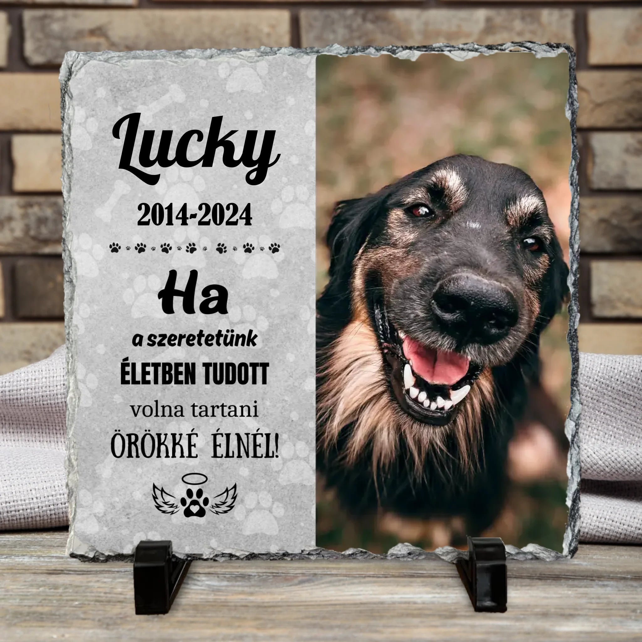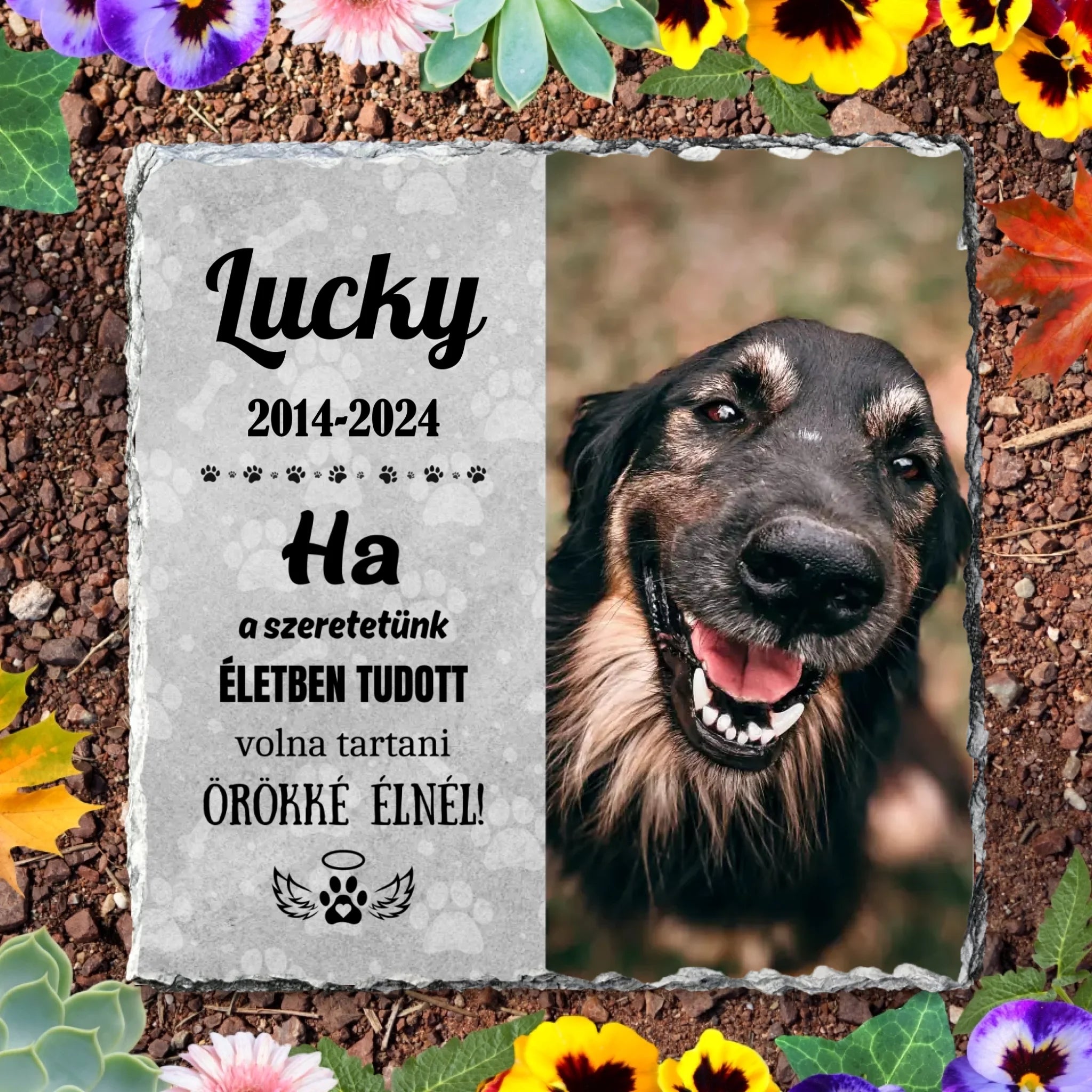 A táblára a kiskedvenc fényképe, egy szép idézet, a neve és az évszám kerülhet. A kődíszen szereplő fotó és a kedves felirat segít megeleveníteni a kuytusod, vagy a cicád emlékét.