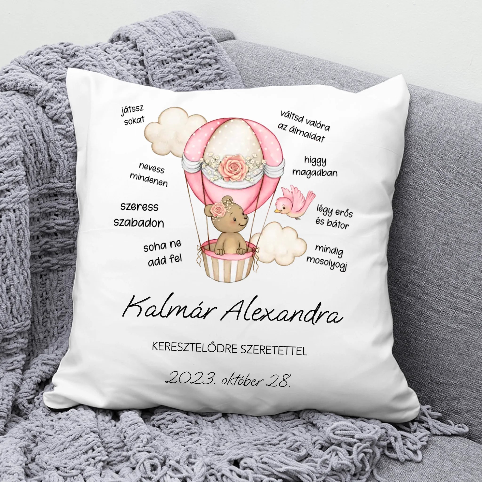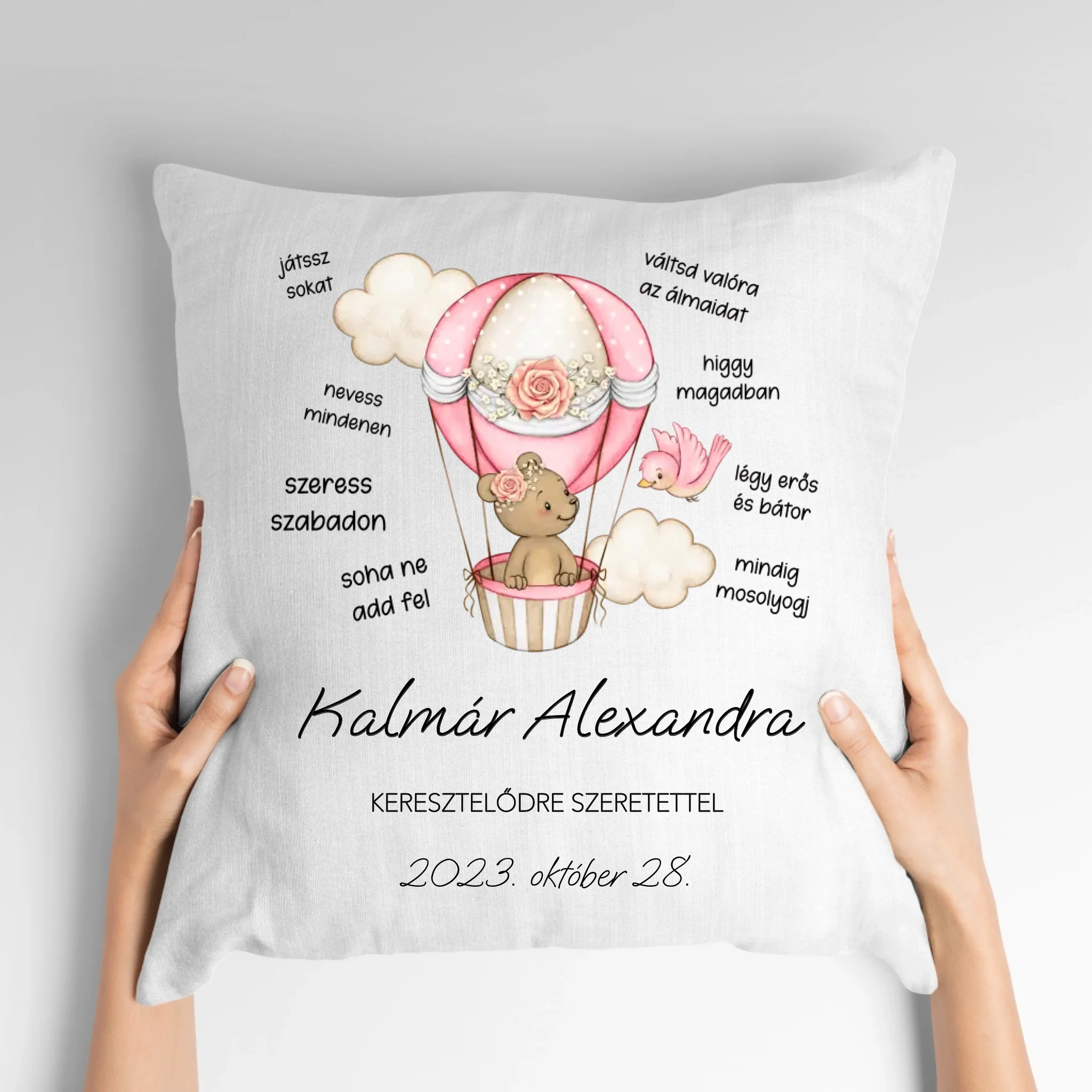 Fehér színű, bájos mackós párna, amely remek keresztelői ajándék egy kislány szerettednek. Ajándékozd meg vele Őt a keresztelője alkalmából.