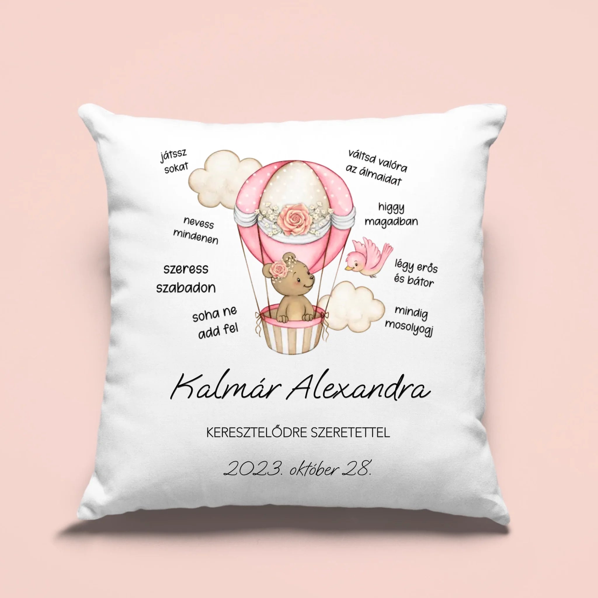 Bájos és kedves keresztelői ajándék. A párnára rákerül a kislány neve, a keresztelő dátuma, az ajándékozó neve és sok-sok jókívánság. A babaszoba éke lehet ez a párna és később kedves emlék maradhat a keresztelő napjáról.