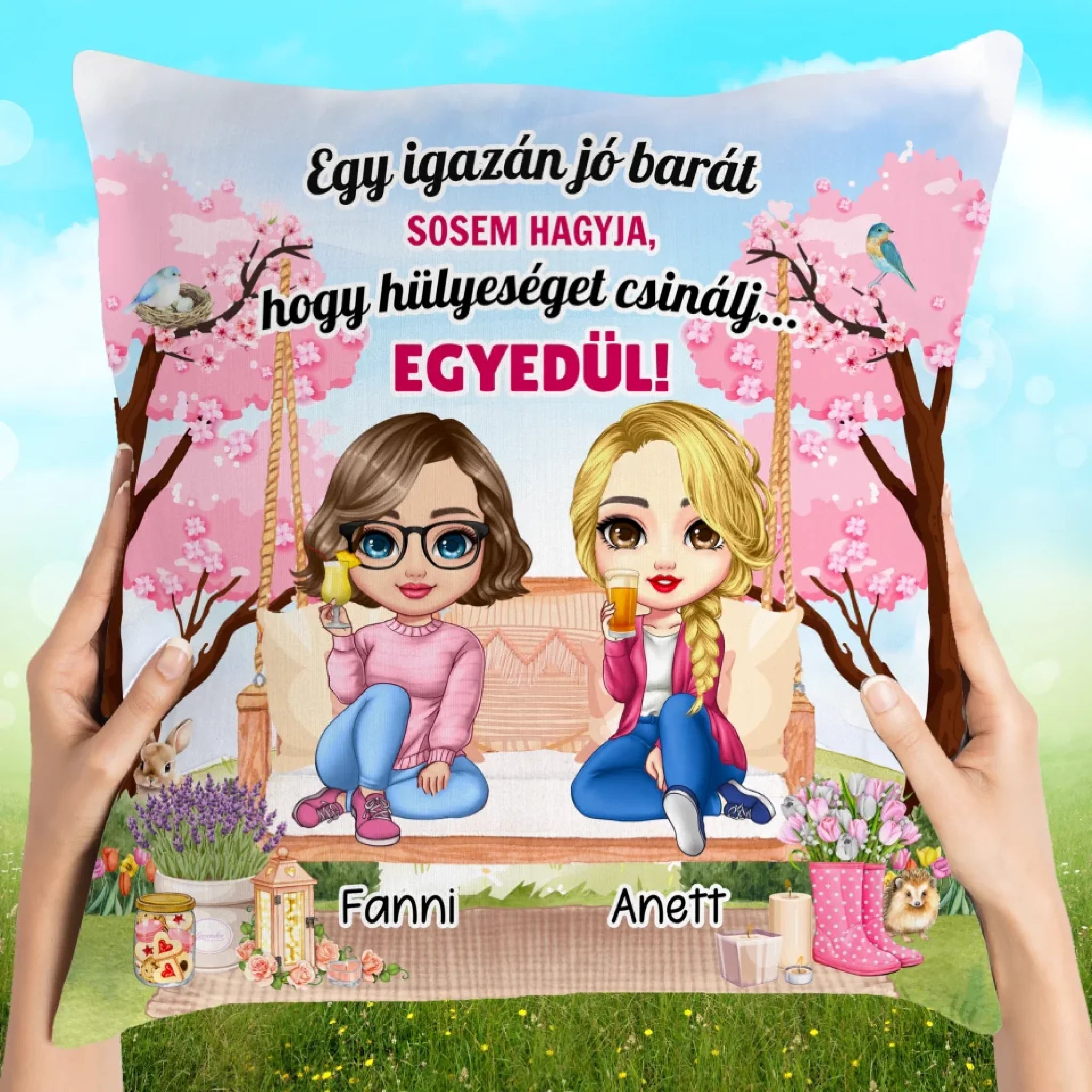 A párna hátulja fehér színű, az elején tavaszi háttér látható. A tetejére az alábbi szöveg kerül: "Egy igazán jó barát sosem hagyja, hogy hülyeséget csinálj...EGYEDÜL!"