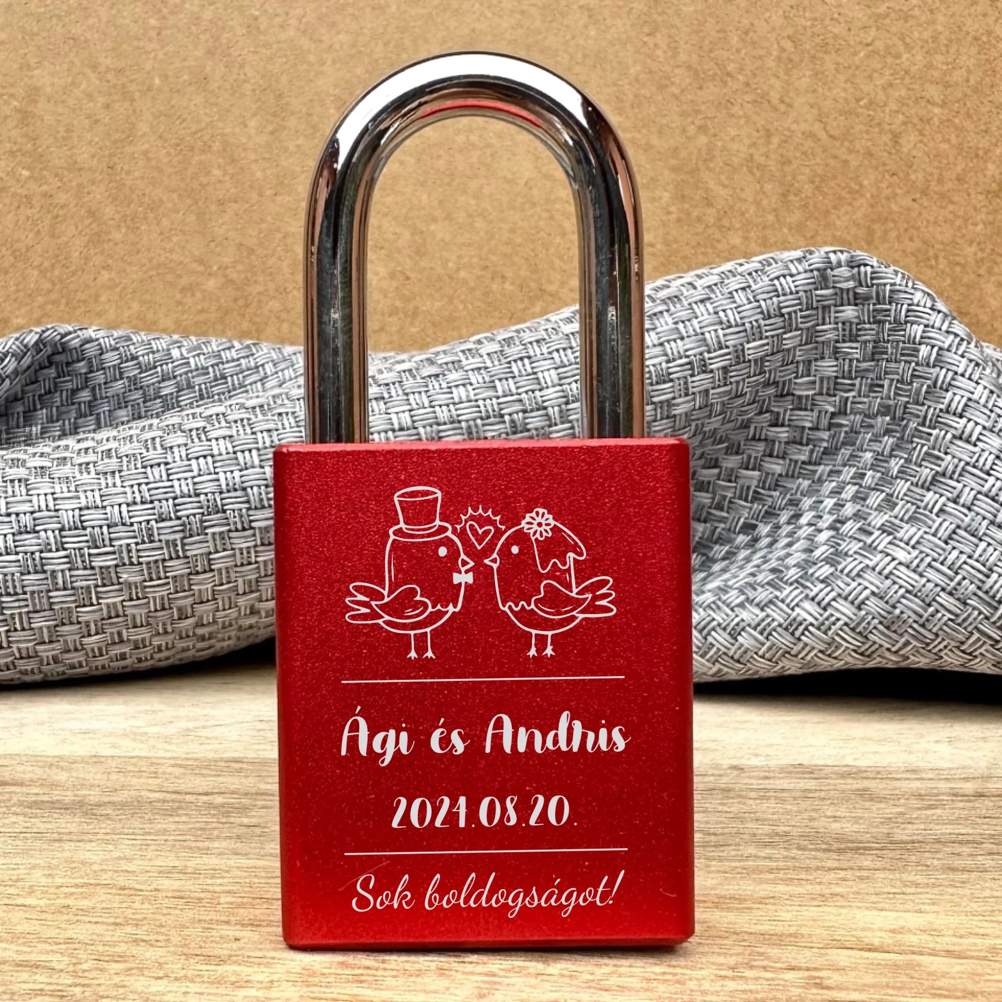 A nevek alá az a dátum kerül, amióta egy párt alkottok, de kérheted az évfordulótok, esküvőtök, vagy az eljegyzésetek dátumával is. A lakatot az általad megadott szöveggel és egy galambpárral, vagy egy esküvői autó grafikájával tesszük még romantikusabbá. A szerelemlakat mintáját te magad választhatod ki, összesen 3 minta közül tudsz válogatni.