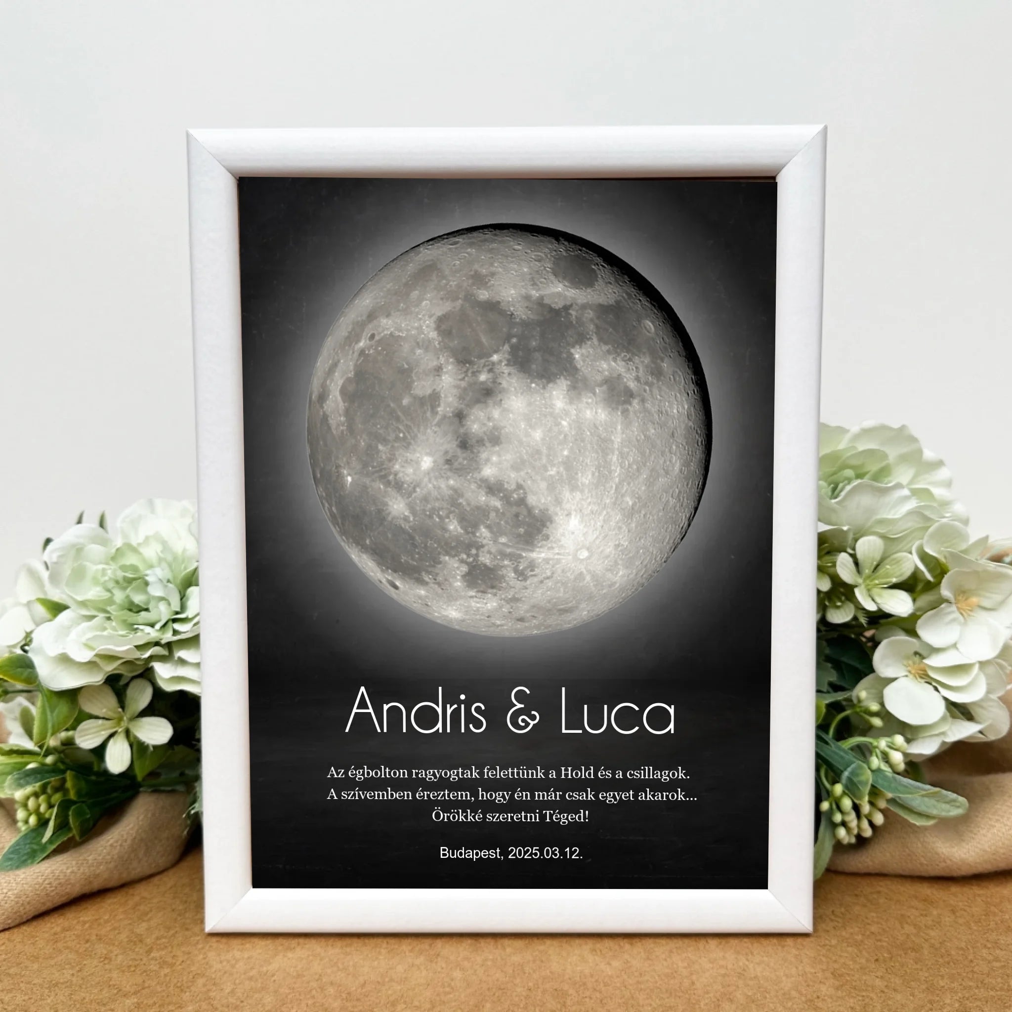 Emlékszel még rá, hogy milyen volt feletettek az égbolt, amikor egy pár lettetek? Nem baj, ha nem, hiszen mi segítünk visszaidézni ezt az emlékezetes napot. A legújabb termékünk a Holdfzis kép az adott helyszínhez és az adott naphoz kötve mutatja meg számodra a valós Hold állást. Hát nem különleges?