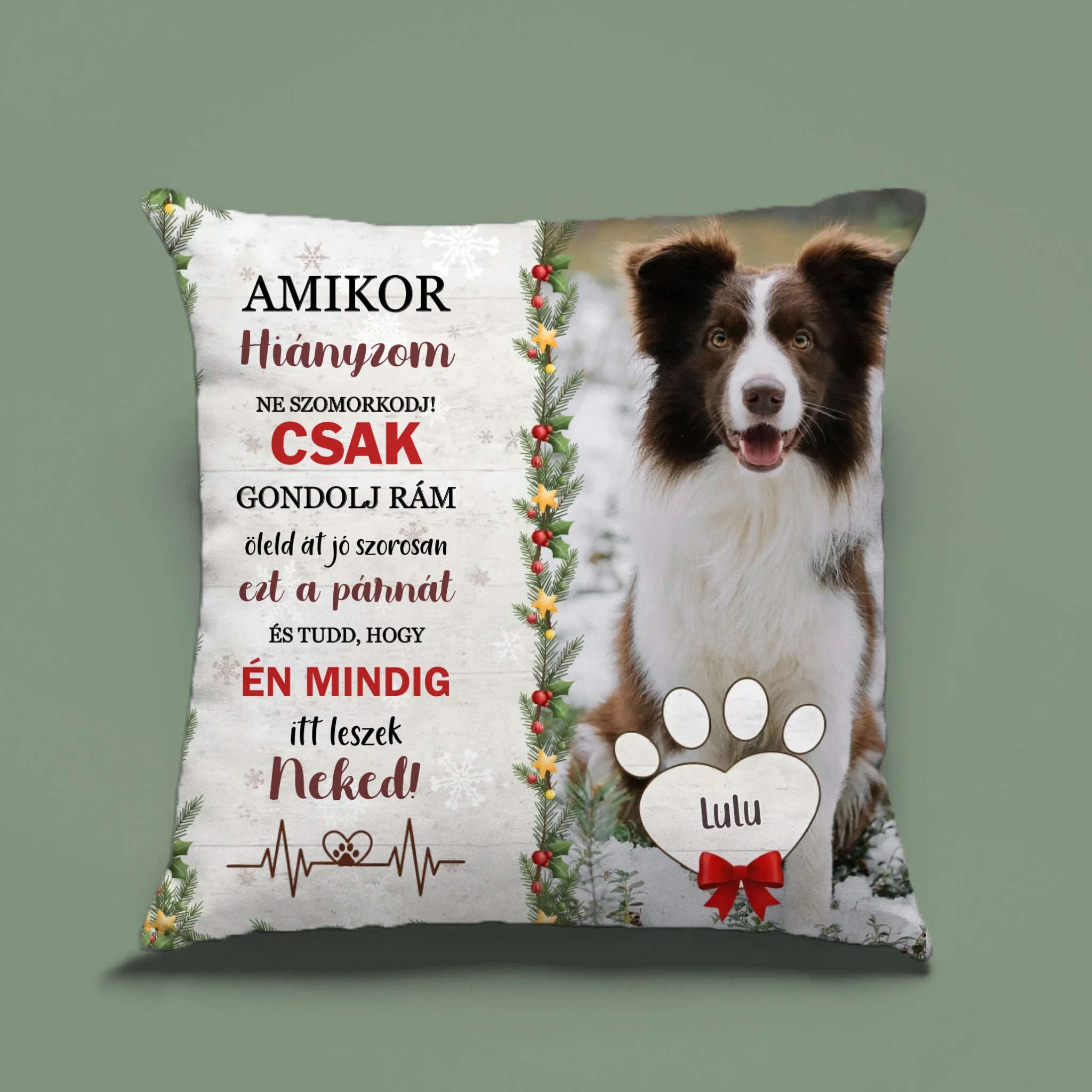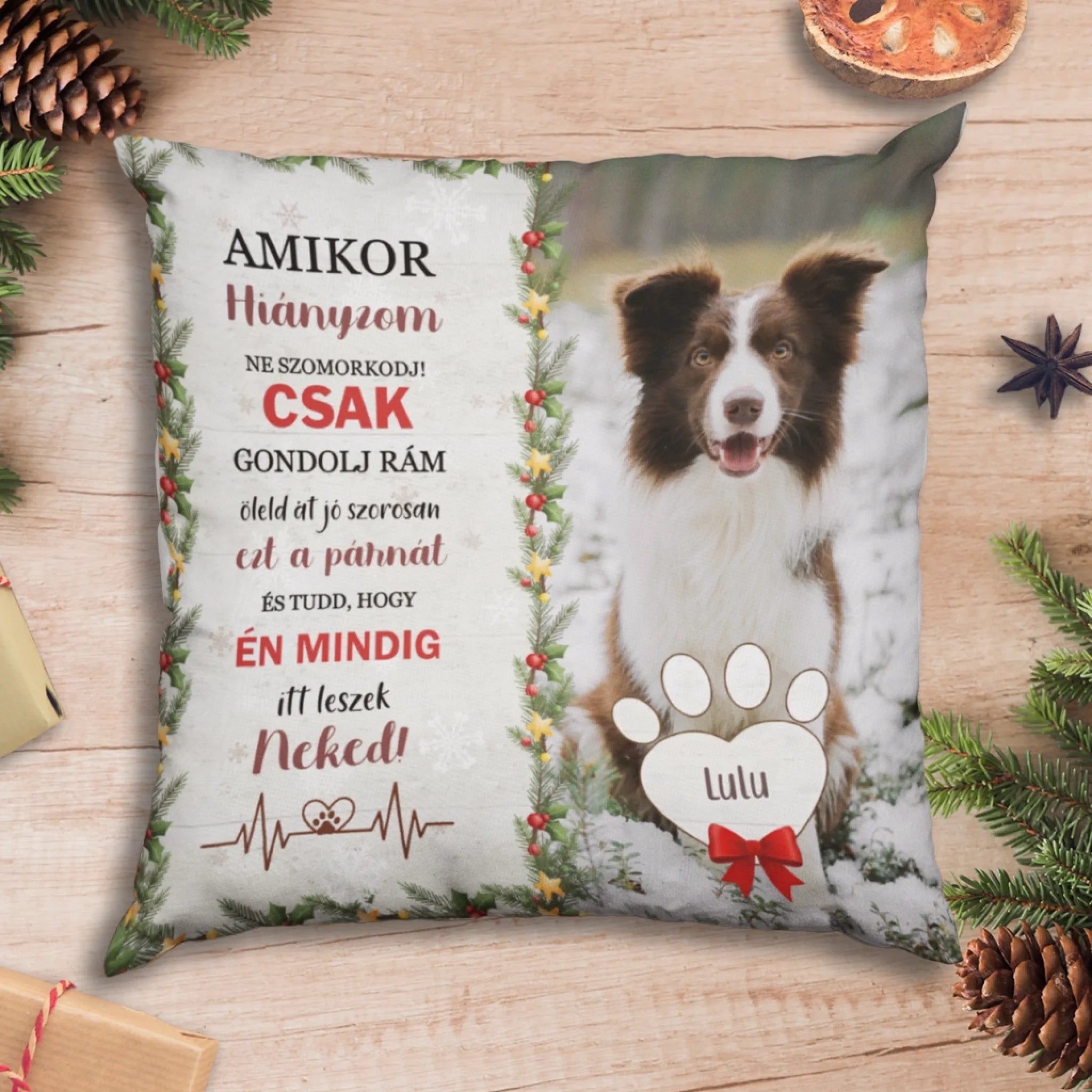 Személyre szabható párna, amire az általad megadott kép kerül a kutyusról, a kiskedvenc nevét is megadatod. A párnára egy igazán megható idézet kerül: „Amikor hiányzom, ne szomorkodj! Csak gondolj rám, öleld át jó szorosan ezt a párnát és tudd, hogy én mindig itt leszek Neked!”. Ezt az idézetet olvasva biztosan megfog hatódni.