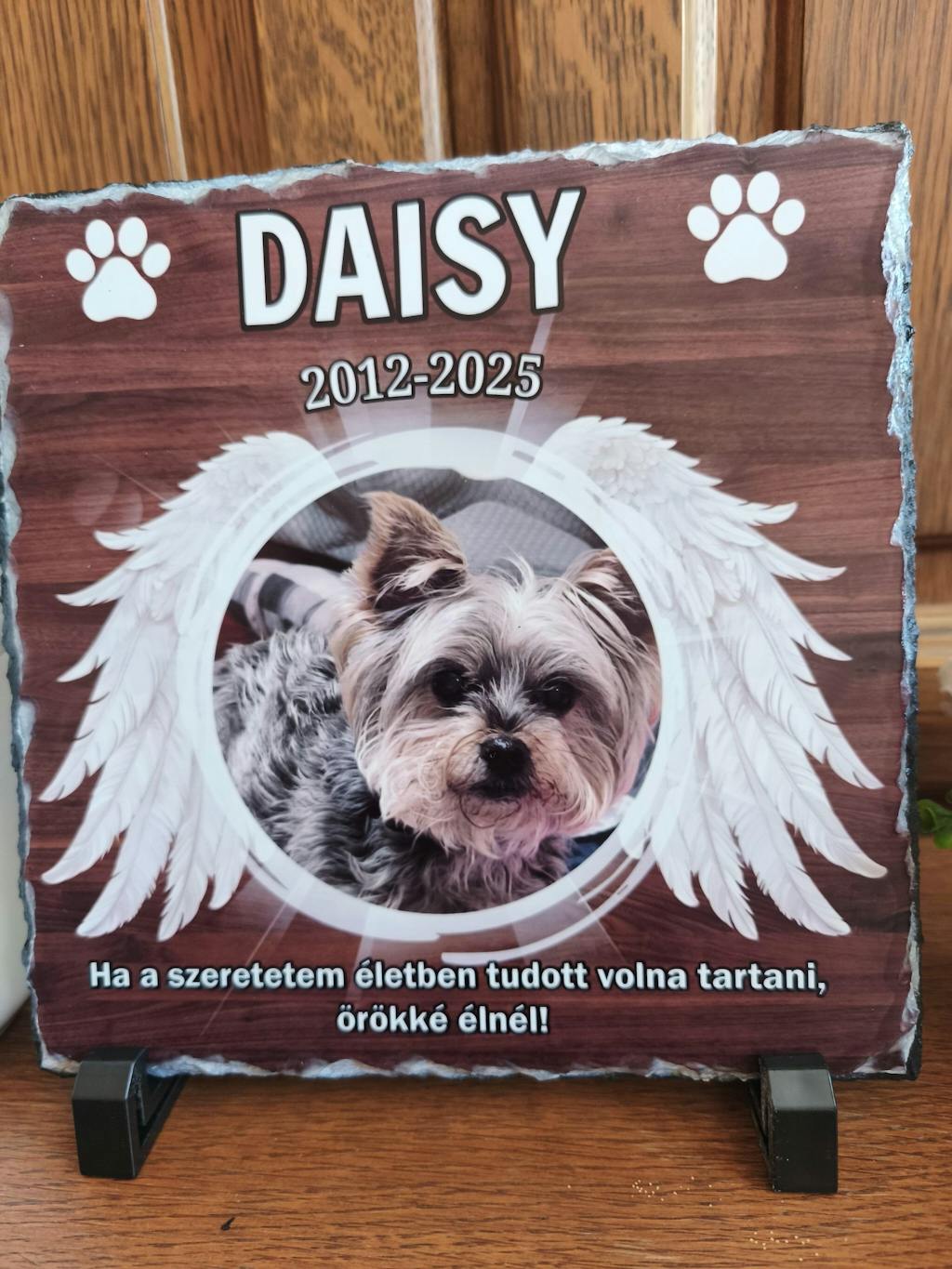 A táblára a kiskedvenc fényképe, egy szép idézet, a neve és az évszám kerülhet. A kődíszen szereplő fotó és a kedves felirat segít megeleveníteni a kuytusod, vagy a cicád emlékét.