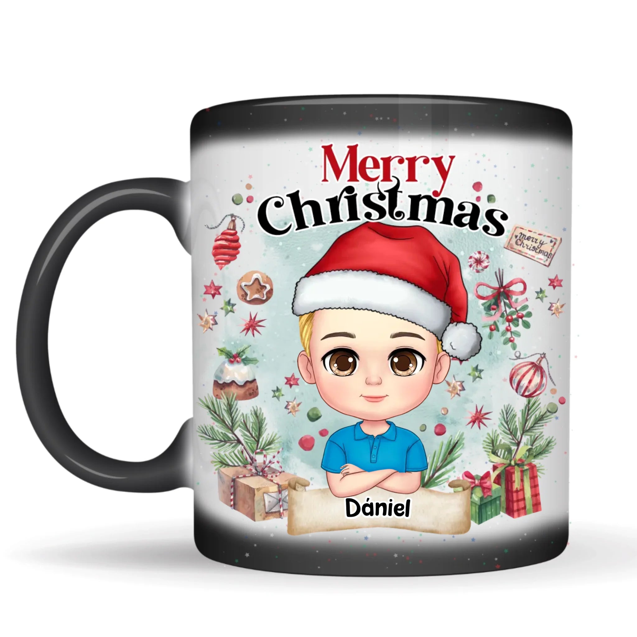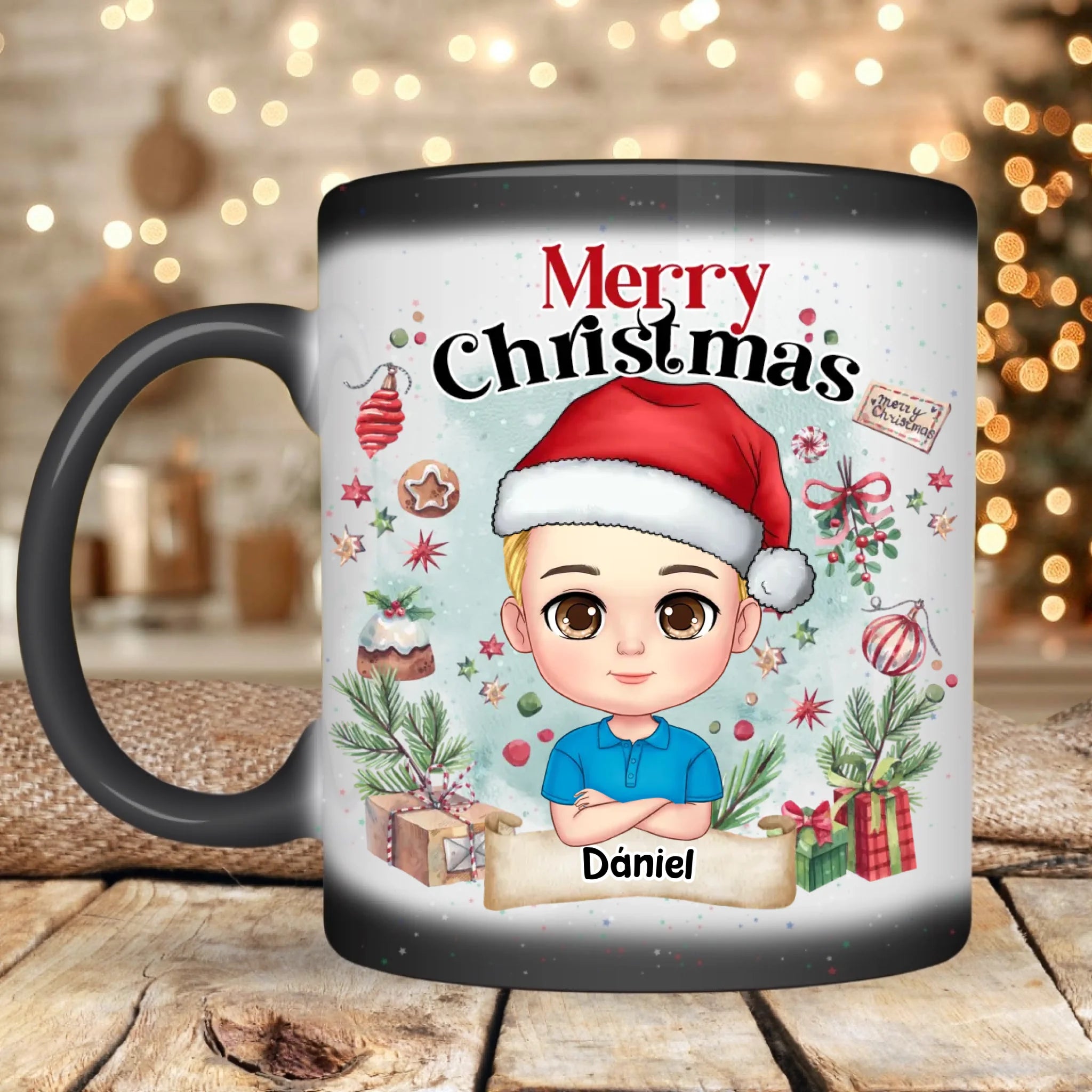 Ez a kedves, ünnepi bögre nemcsak meleg italt, hanem mosolyt is ad. A rajta lévő kisfiú figurát teljesen személyre szabhatod – frizura, ruha, bőrszín –, és a megajándékozott neve is rákerül. A felirat választható magyarul vagy angolul, így pontosan olyan lesz, amilyennek megálmodtad.
