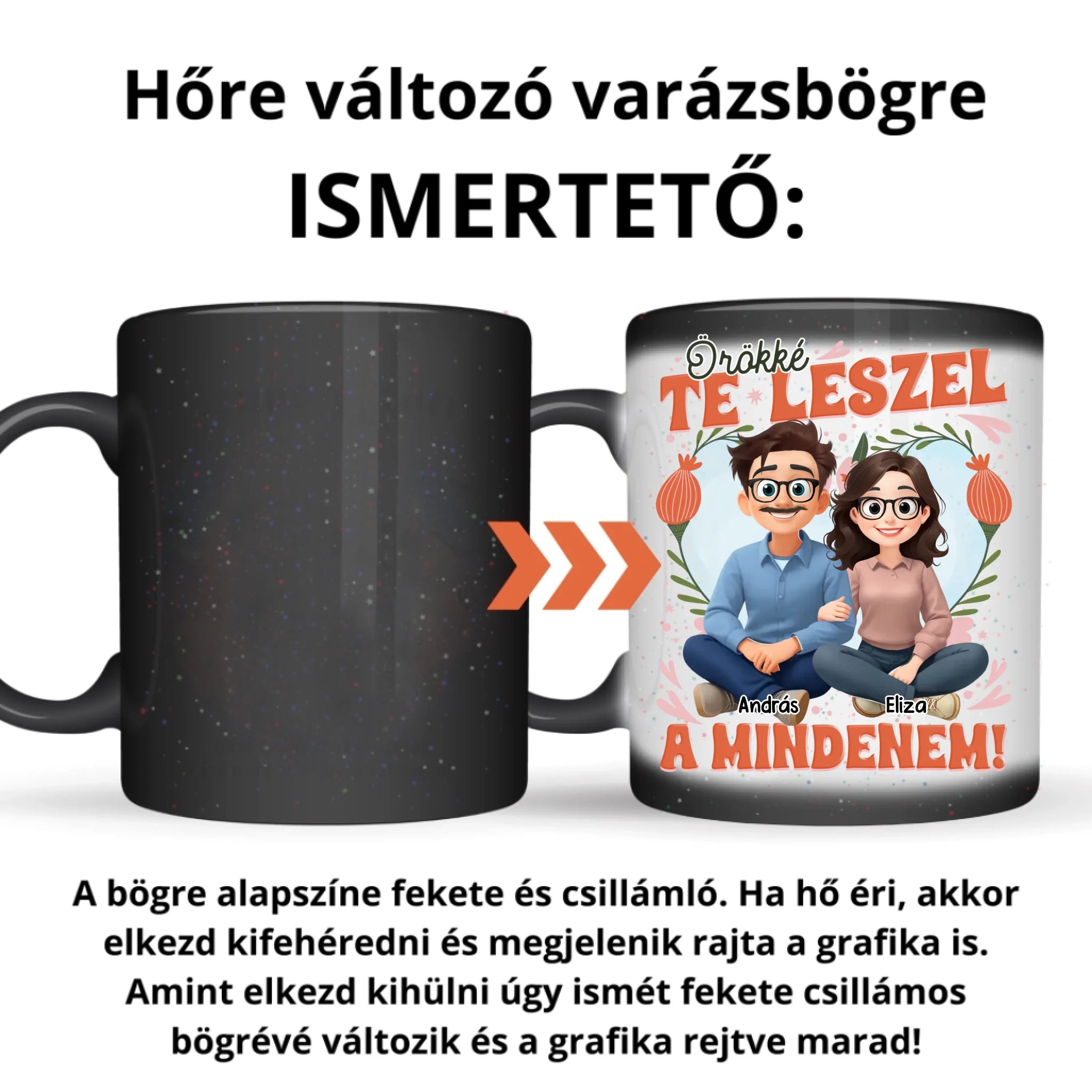 Ideális ajándék pároknak, szerelmeseknek és házaspároknak Valentin-napra, évfordulóra, születésnapra vagy akár egy spontán, kedves meglepetésként. A bögre minőségi anyagból készül, mindennapi használatra alkalmas, miközben a hőre változó technológia és a glitteres bevonat garantáltan különlegessé teszi az ajándékozás pillanatát.