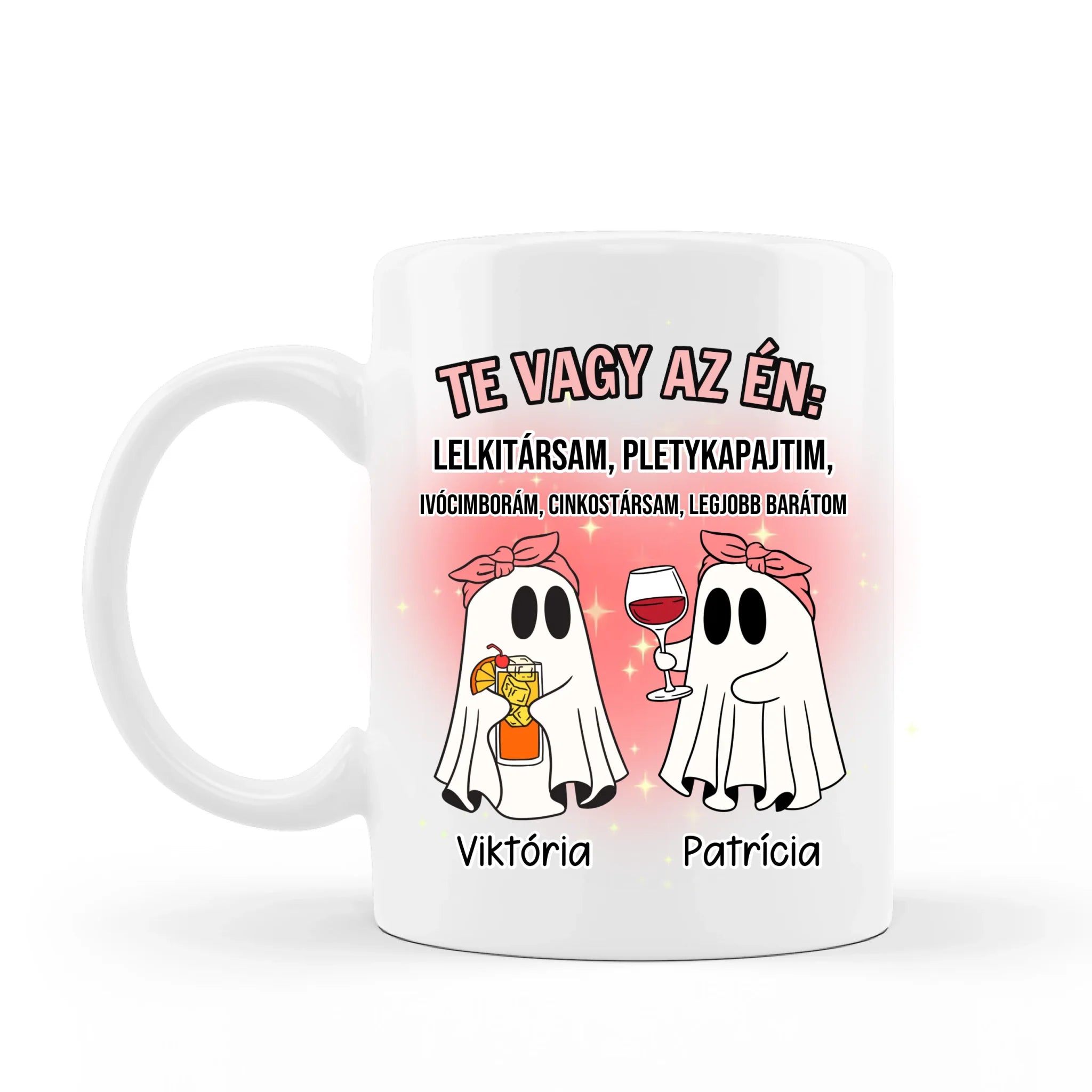 Cuki, halloweeni bögre, rajta két szellemmel, vicces szöveggel és a saját nevetekkel. Ha szereted a kávét, és a halloweent, akkor ennek a bögrének ott a helye a Te polcodon is. Lepd meg vele a legjobb barátnődet és fogyasszátok ebből a kedvenc kávétokat.
