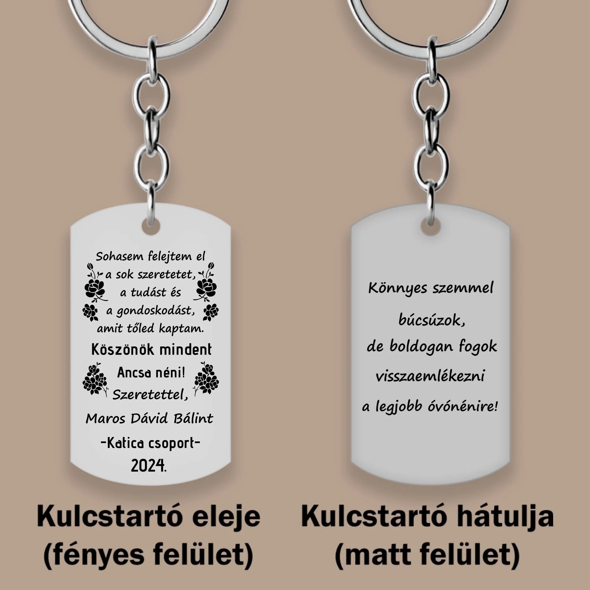 A nemesacél szögletes medál 4 cm méretű és 1 mm vastag. Masszív anyag, nem lehet eltörni. A teljes kulcstartó 8-9 cm hosszúságú, tehát egy női táskában könnyedén megtalálható. Az óvónéniknek szánt ajándék kulcstartó karikájára a lakáskulcs, vagy a kocsikulcs könnyedén fölhelyezhető. A kulcstartó karika 3 cm átmérőjű. A medálra kerülő szövegek és grafikák gondos szerkesztői munka után lézergravírozással kerülnek a medál felületére.