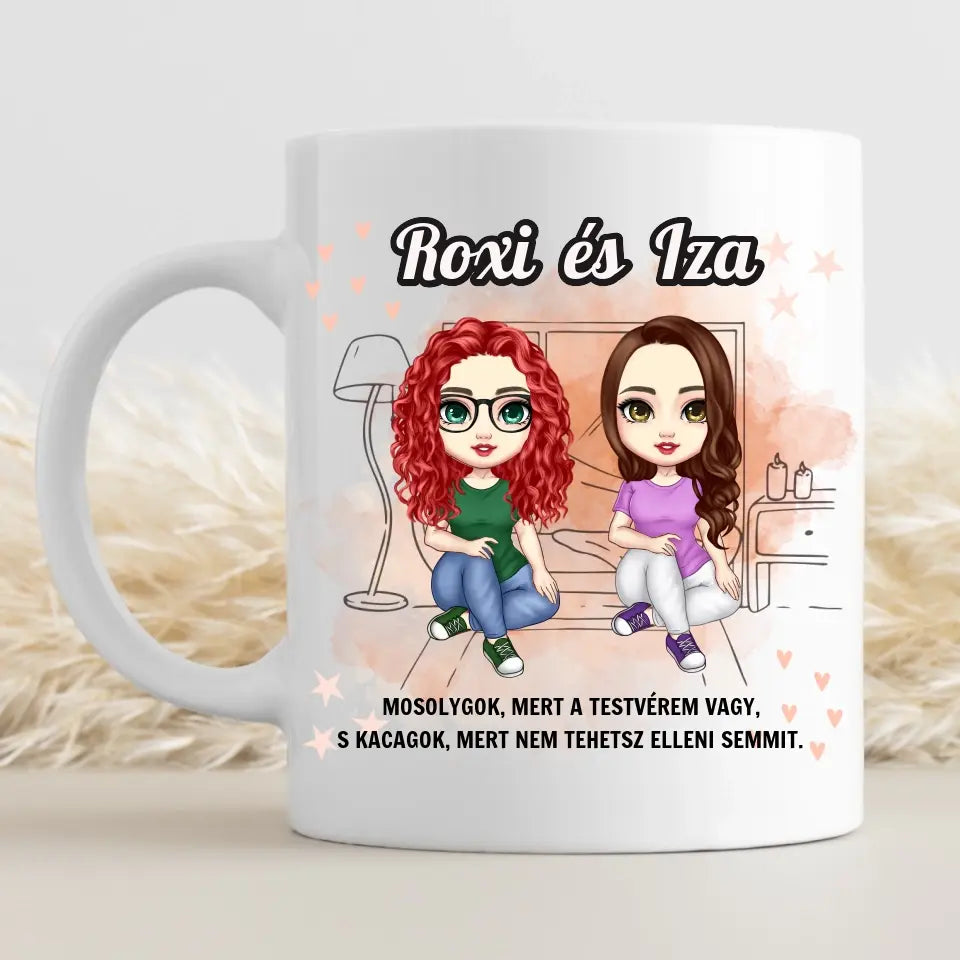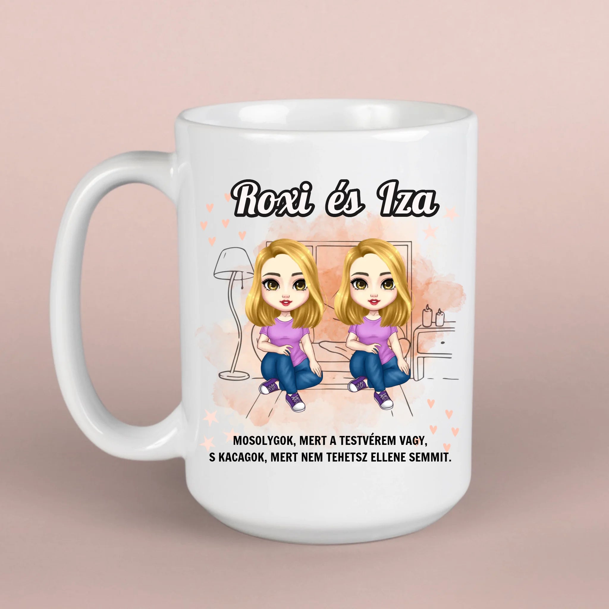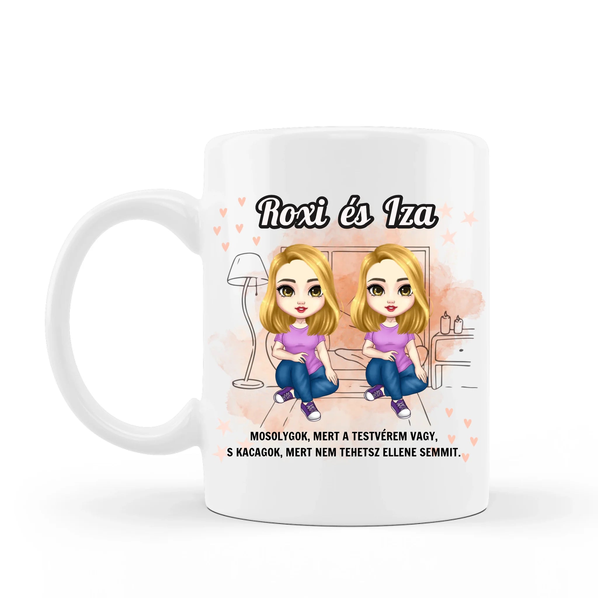 A bögre alapszíne fehér. A tetejére az általad megadott nevek kerülnek. A bögrén két figura látható, melyeket teljesen személyre tudod szabni. Kiválaszthatod a figurák bőrszínét, haját és ruházatát. A bögrén az alábbi vicces szöveg olvasható: „Mosolygok, mert a testvérem vagy. Kacagok, mert nem tehetsz ellene semmit!”. Ezt a feliratot olvasva biztosan nevetni fog.