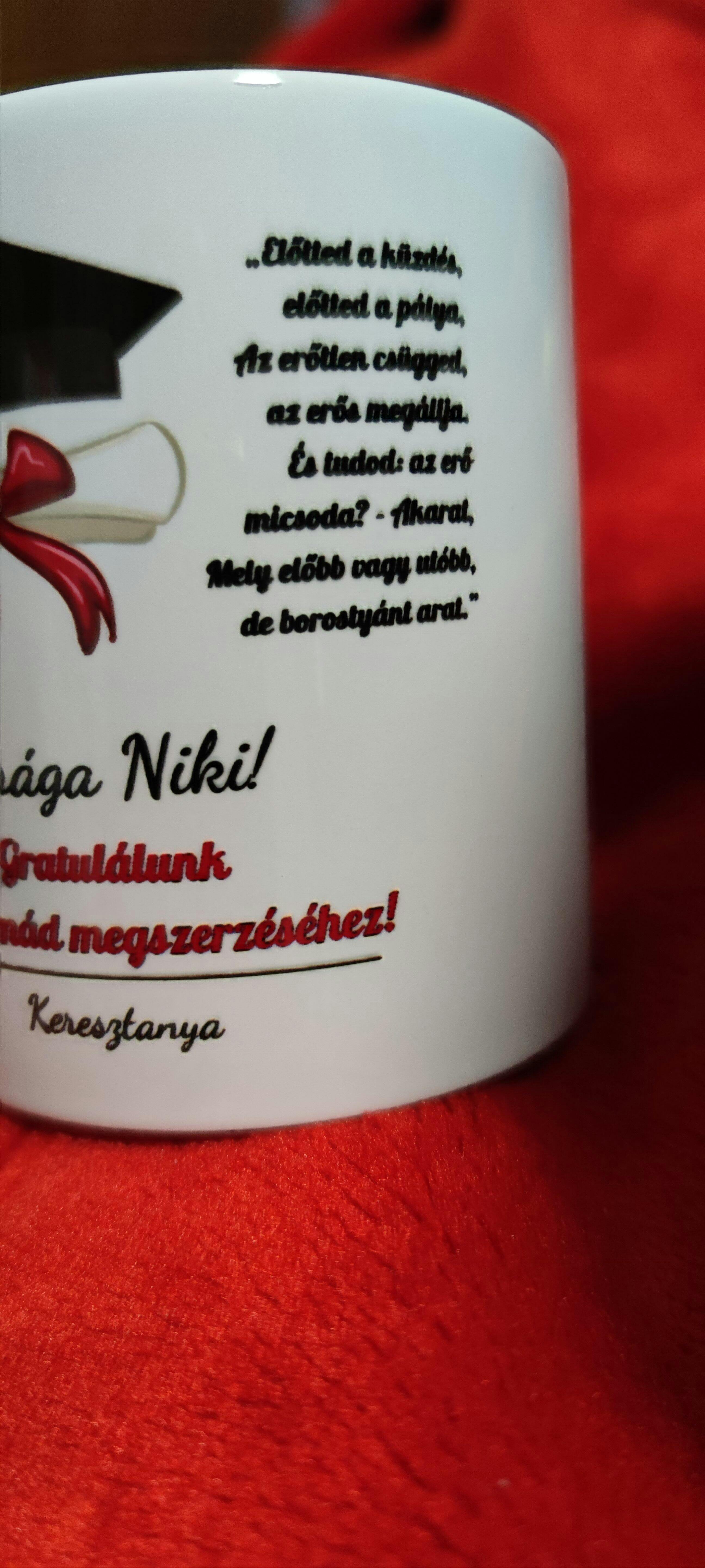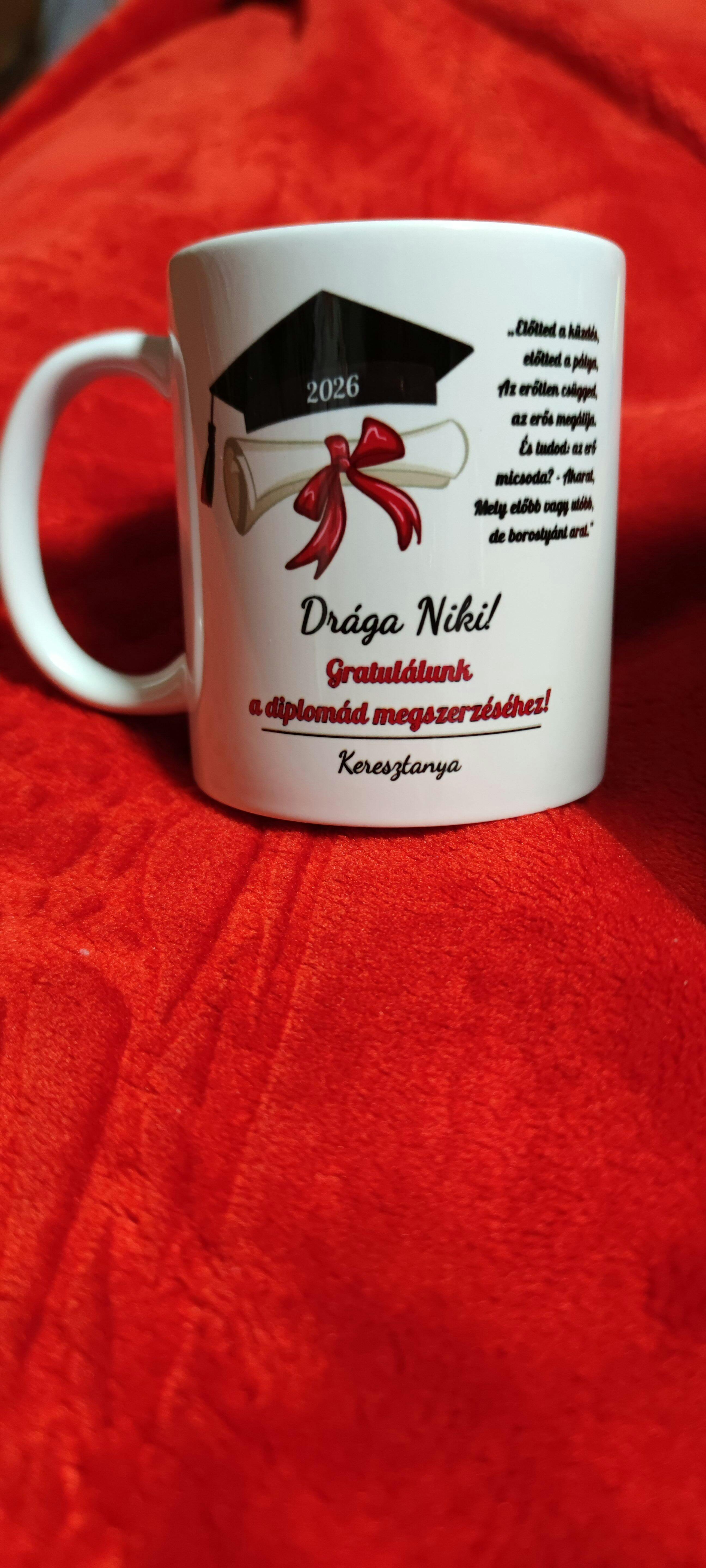 Van a családodban egy olyan személy, akinek közeleg a diplomaosztója és szeretnéd egy személyre szóló ajándékkal meglepni? Akkor ne keresgélj tovább, mert megtaláltad! Ez a diplomaosztóra szánt ajándék emlékezetes meglepetés lehet egy olyan lány szerettednek, aki most fogja megszerezni a diplomáját.Ezzel az egyedi bögrével biztosan mosolyt fogsz csalni az arcára. Lepd meg vele szerettedet a diplomája megszerzése napján.