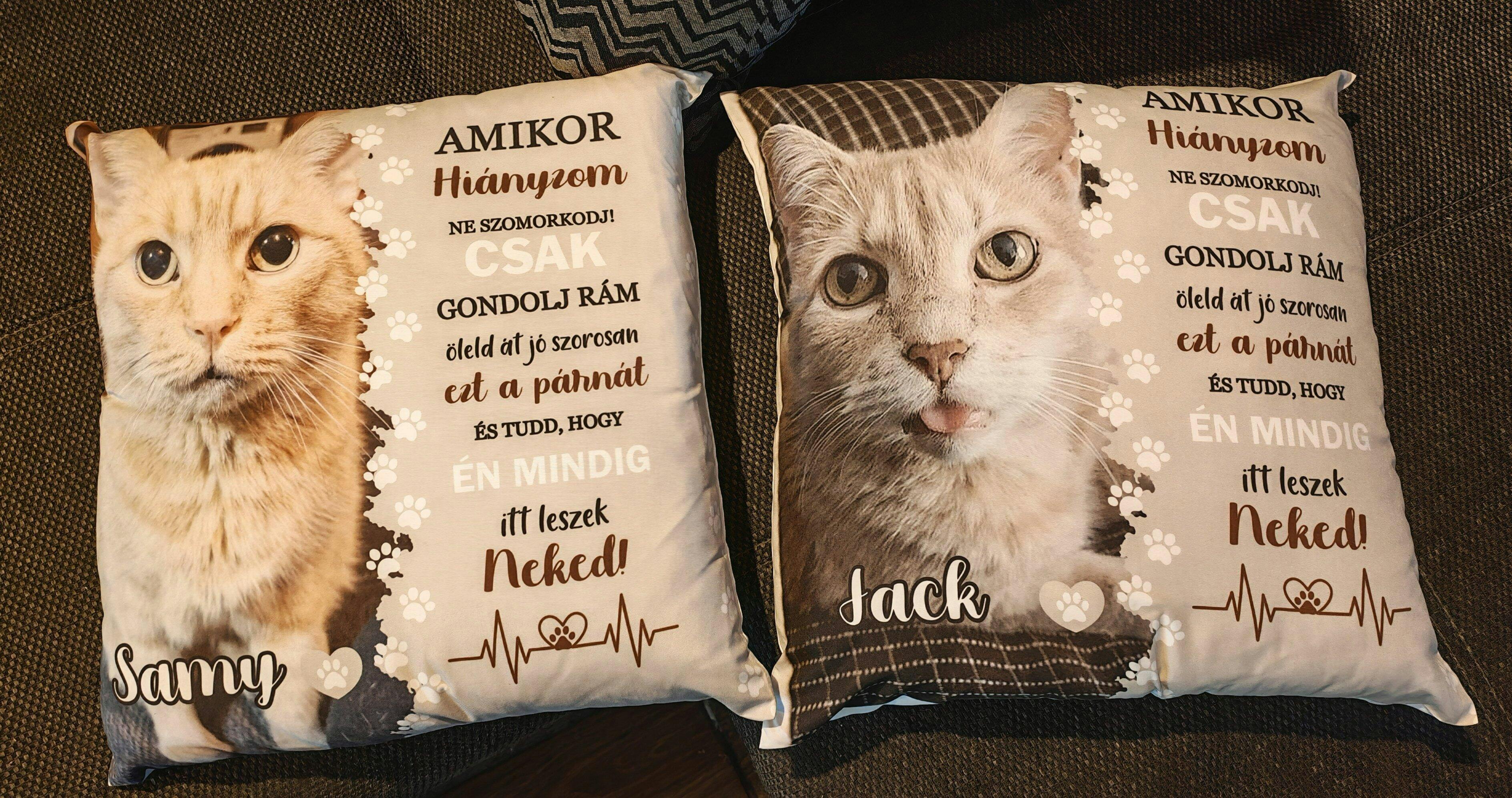 Személyre szabható párna, amire az általad megadott kép kerül a cicusról, a kiskedvenc nevét is megadatod. A párnára egy igazán megható idézet kerül: „Amikor hiányzom, ne szomorkodj! Csak gondolj rám, öleld át jó szorosan ezt a párnát és tudd, hogy én mindig itt leszek Neked!”. Ezt az idézetet olvasva biztosan megfog hatódni.