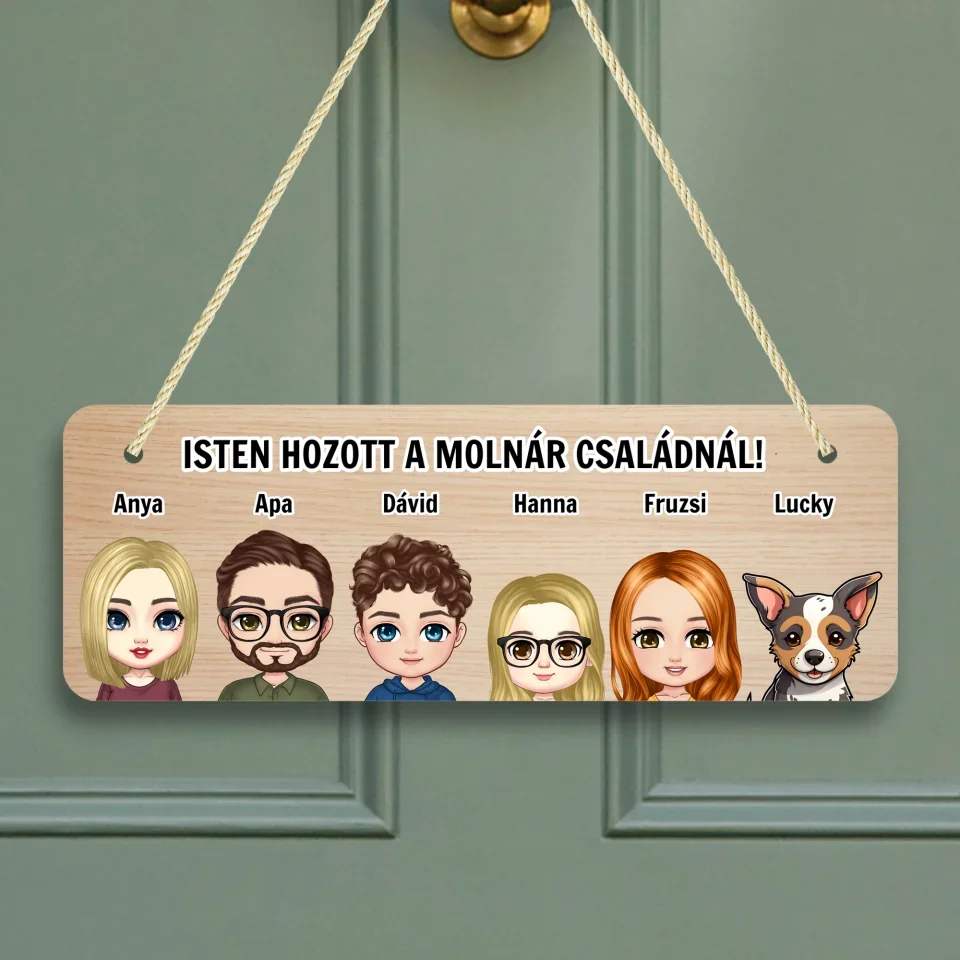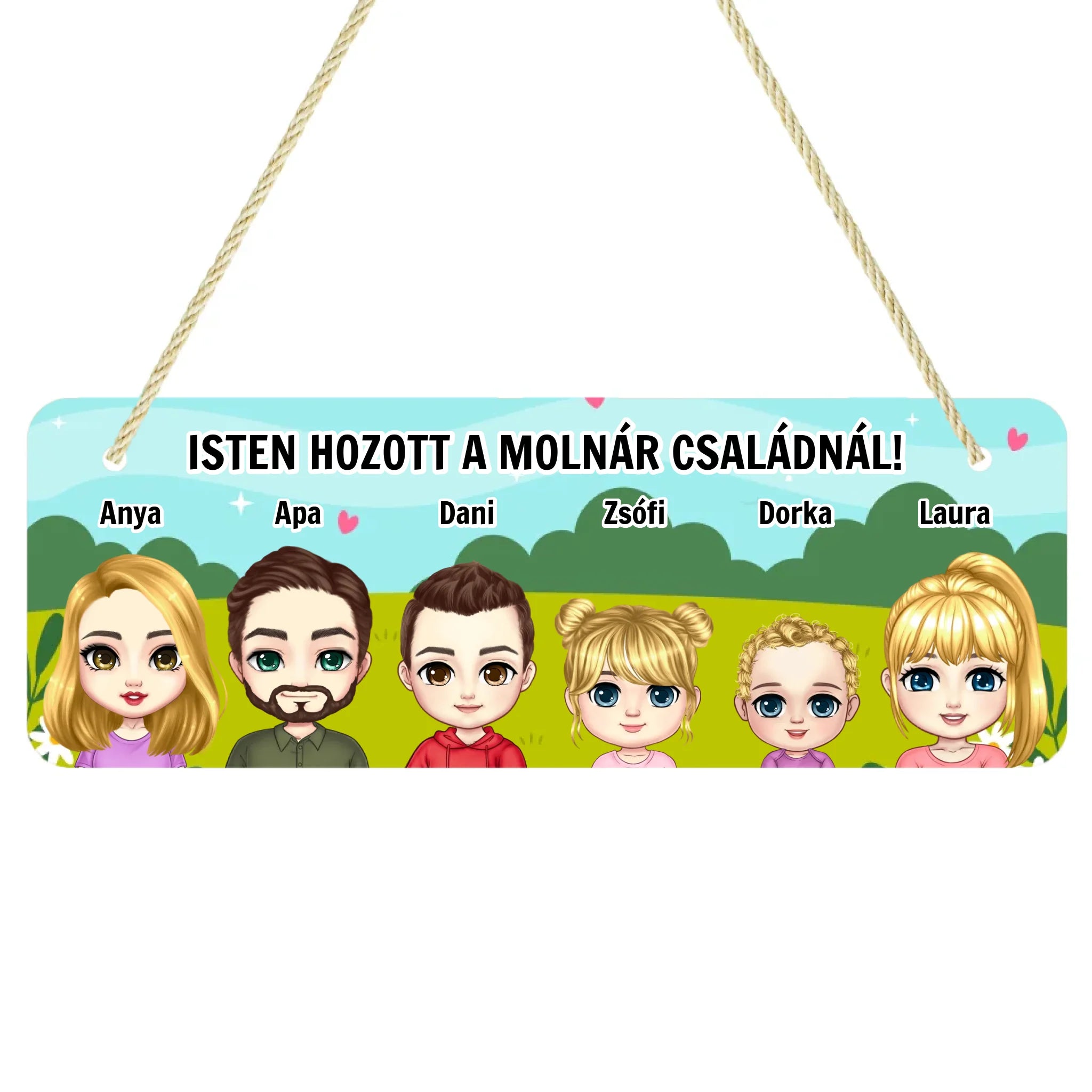 Fa anyagú, téglalap alakú, családos ajtódísz. Rajta az általad kért szöveggel, a családtagok neveivel és a rájuk hasonlító figurákkal. A karakterek teljesen személyre szabhatóak. Akár 6 családtag is elfér a díszen. Csodás dekorációs elem és szívet melengető ajándék ötlet.
