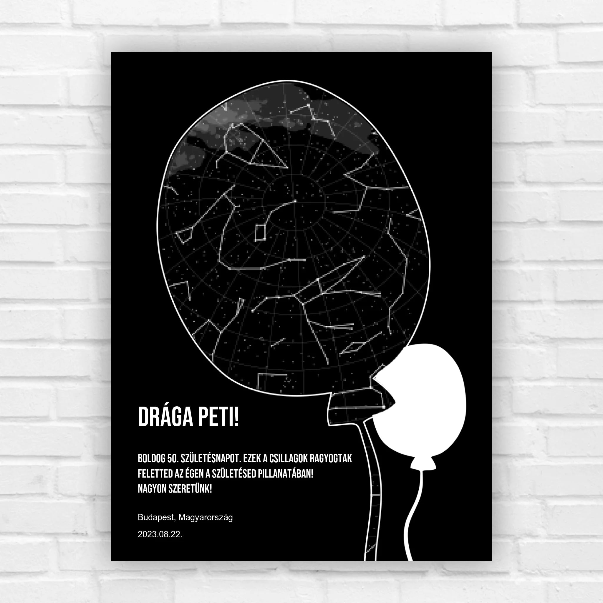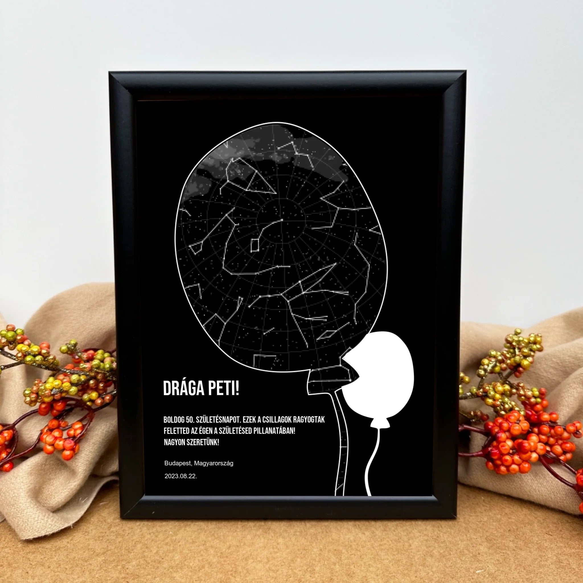 Egyedi születésnapi ajándék férfiak és nők számára. Lufiba bújtatott csillagállás, amely megmutatja, hogy milyen csillagok ragyogtak az égen azon a napon, amikor a szülinapos megszületett. Emlékezetes szülinapi meglepetés és ezen kívül szuper lakásdekorációs elem is.